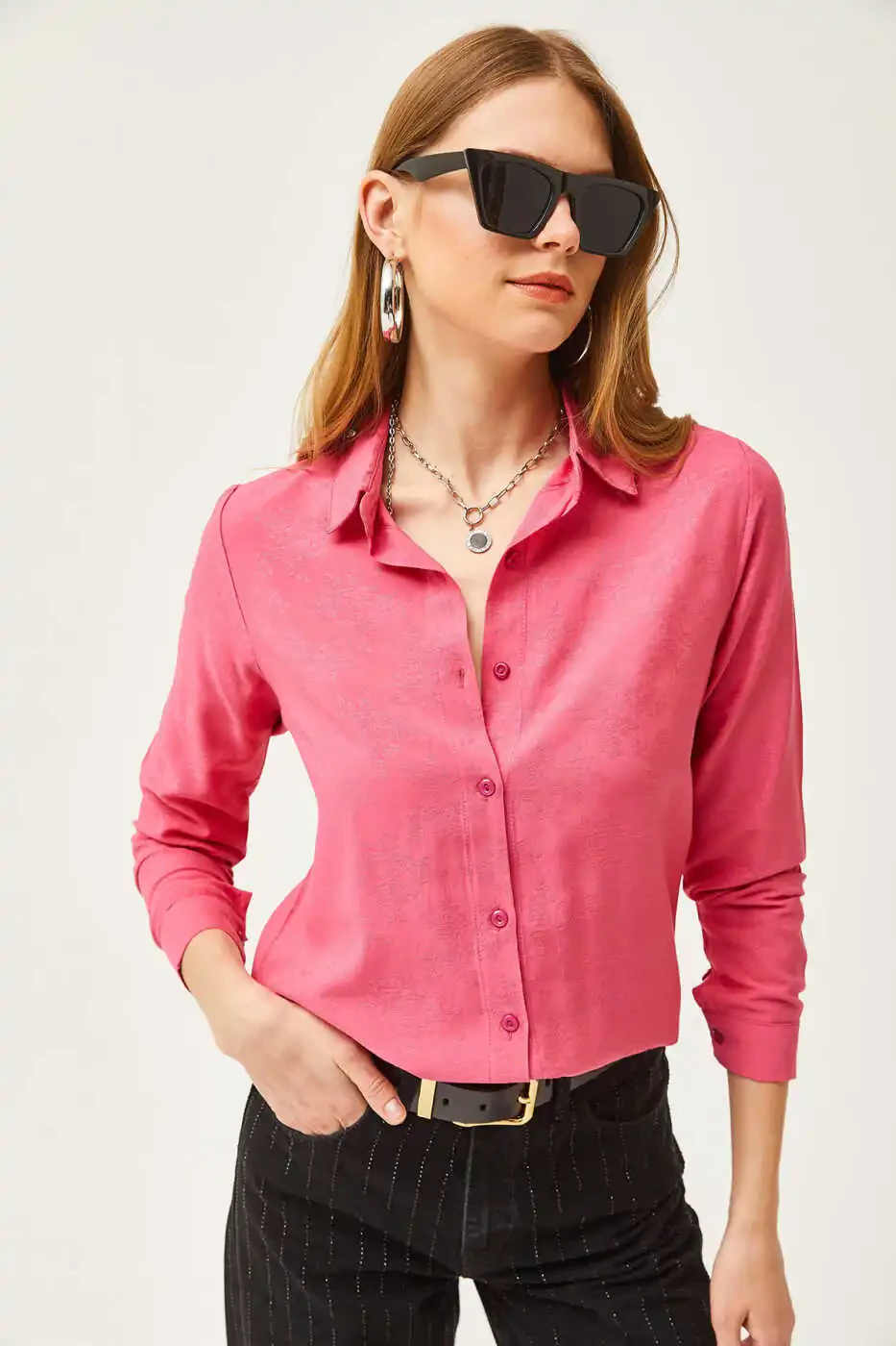 Kadın Çiçek Fuşya Jakarlı Saten Detaylı Dokuma Gömlek - GML-19001173