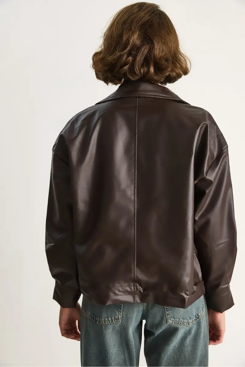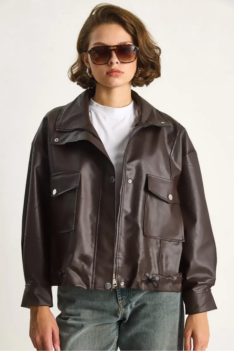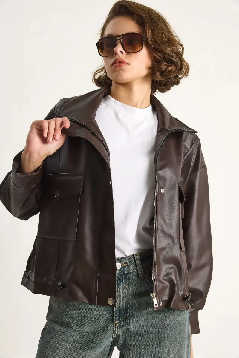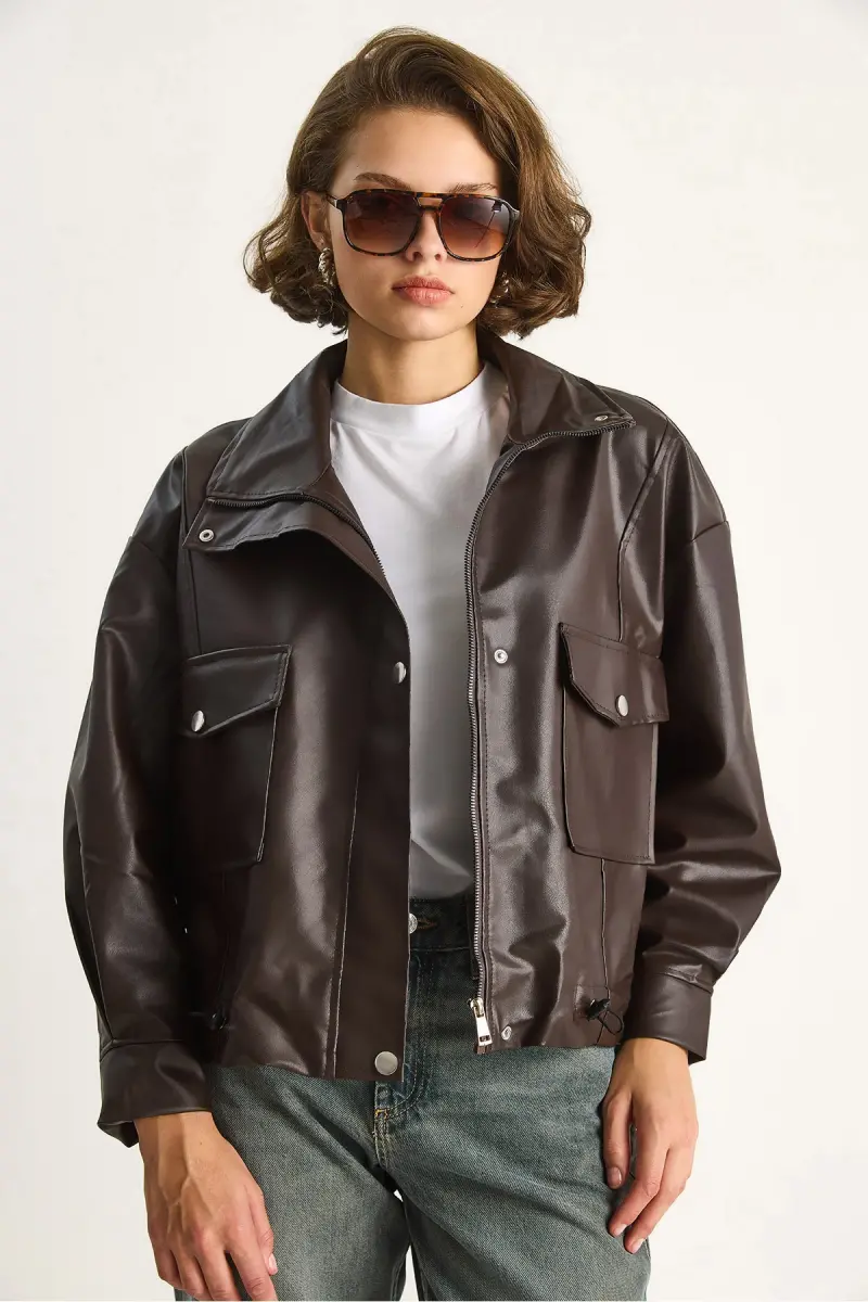 Kadın Çift Büyük Cepli Deri Ceket-Kahve