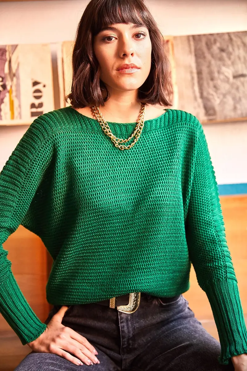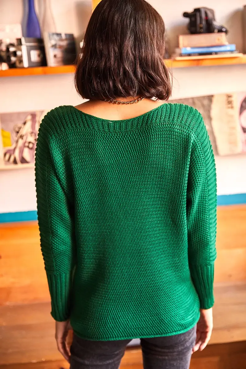 Kadın Çimen Yeşili Kol Detaylı Petek Örgü Kazak KZK-19000399-Çimen Yeşili