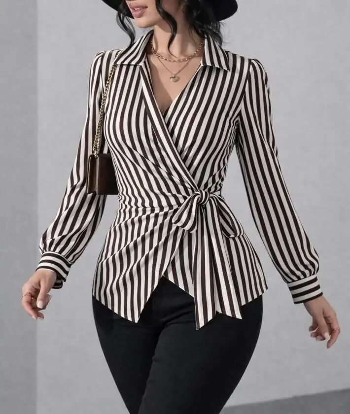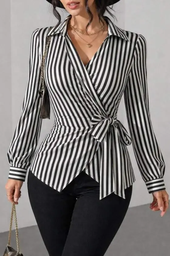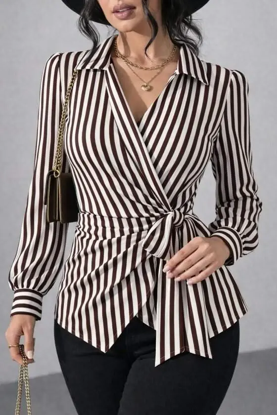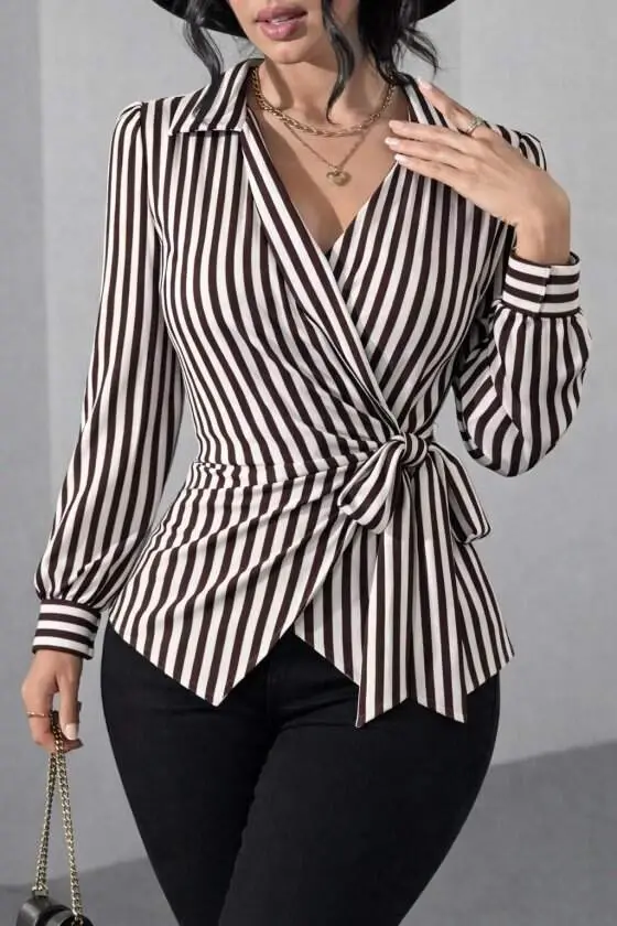 Kadın çizgili Kruvaze Bağlamalı Gömlek