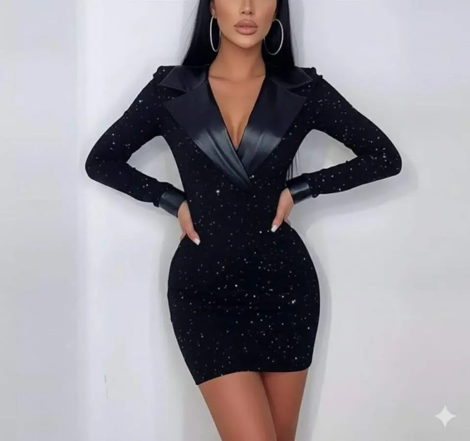 Kadın Deri Detaylı Manşet Yaka Simli Fukara Kumaş Mini Elbise