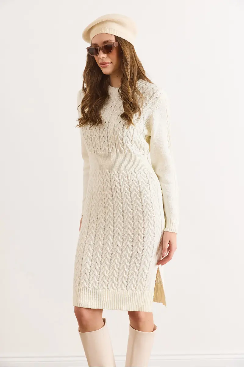 Kadın Ekru Beli Bantlı Yırtmaçlı Saç Örgü Mini Elbise ELB-19002289-Ekru