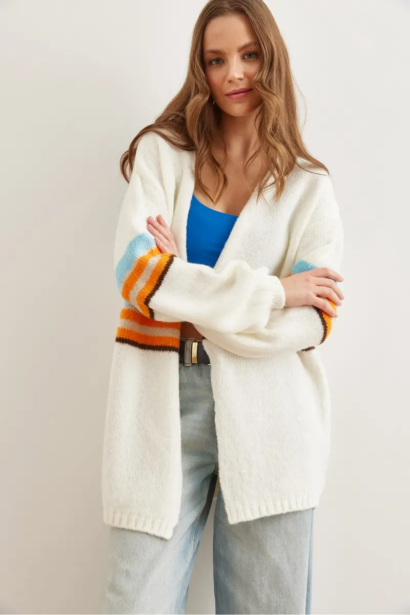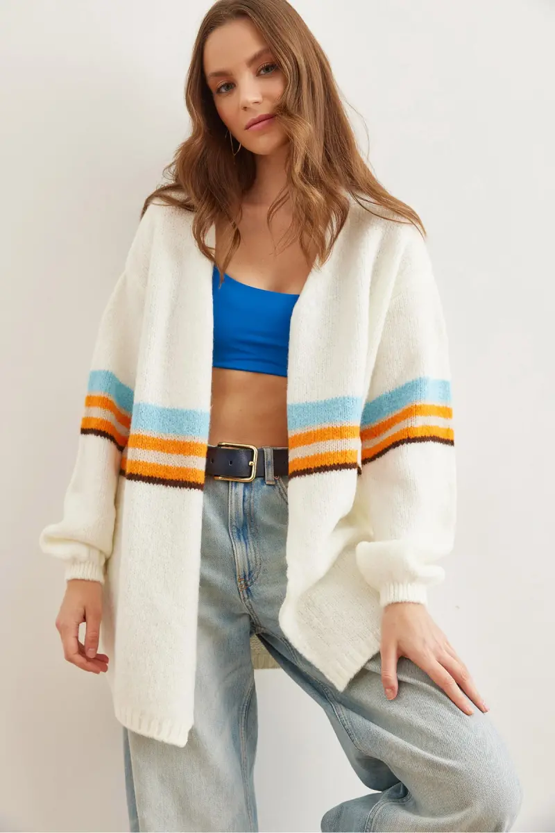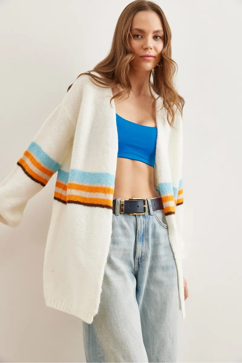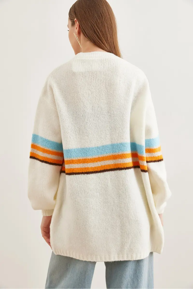 Kadın Ekru Renkli Şeritli Yumuşak Dokulu Triko Hırka HRK-19000299-Ekru