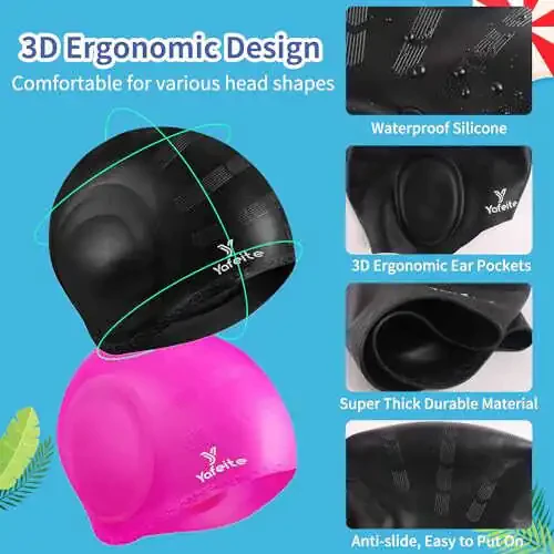 ⛱Premium Silicone Material: The swim cap is made of top-quality material, which is durable, soft, non-toxic, and eco-friendly. Super thick silicone is stretchy and durable, easy to put on and take off to make you comfortable and relaxing. Premium silicone will not deform after repeated use, providing a snug fit for your head, and ensuring it stays in place during your swim. 🌞Large Size for Various Hair Styles: Our swim caps are designed with an extra space at the back, with enough room to fit any bulky hairstyle or curly hair. There are anti-slip patterns on the edge of the hat, which is easy to wear and tangle-free. With the 3D Ergonomic design and high elasticity, the swim cap can easily fit for no matter short hair or long hair, suitable for both women and men. ❤Protect Scalp and Ears, Keep Hair Fluffy: The swimming cap is designed with a special ear pocket to prevent water from entering your ear. Coordinated with the super-fitting edge, our swimming hats will protect your ears from dirt, chlorides, and other substances in the water, and keep your hair dry and clean. Hair and health-conscious swimmers all know that a great waterproof swim cap could ensure a safe and happy swimming experience. 🎁Super Value Set with Free Bonus: This swim cap comes with two swimming hats in black and pink. They can be applied to both men and women, it is a great gift pack to share with families. Bonus two pairs of ear plugs and nose clips for swimmers, they protect your ears and nose from water to a certain extent, so you can perform at your best. All these accessories are reusable, simple to use, and can be stored in a free mesh bag. ✔️Enjoy Summer With the Stylish Swim Cap: Yafeite Swimming Cap for women adults is an additional fashion accessory. You could enjoy the summer and protect your hair in a fresh, novel, and attractive way. At the same time, if you have any questions or concerns, our customer service team is always available to provide you with satisfactory answers and solutions.