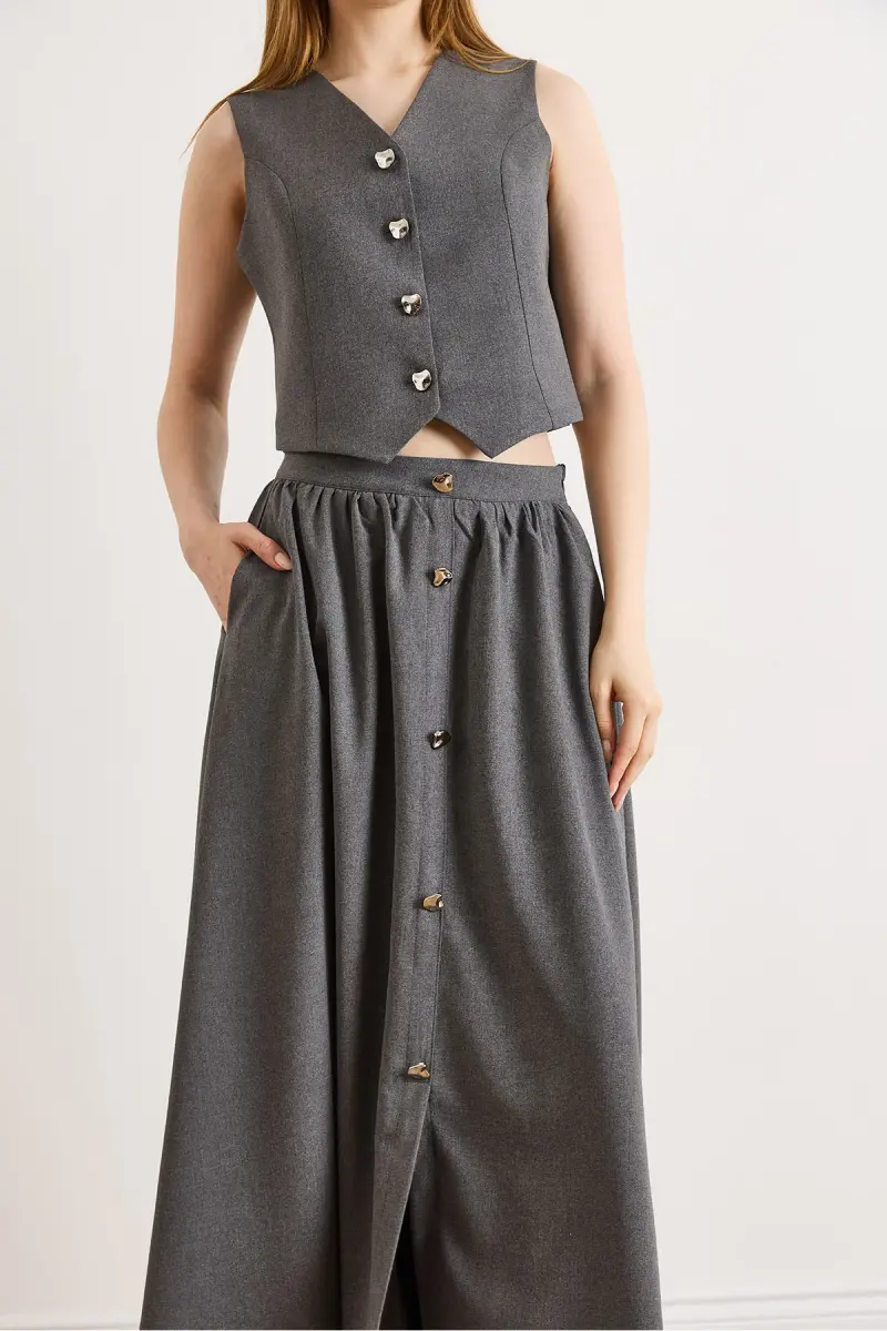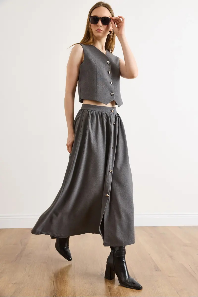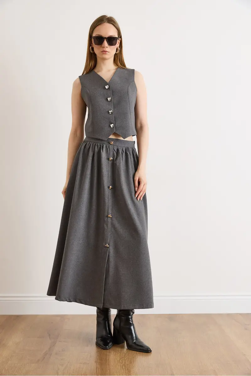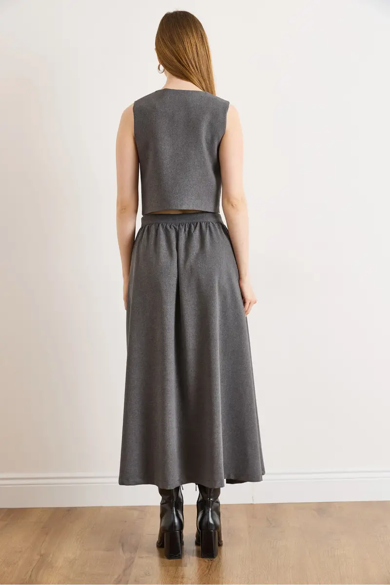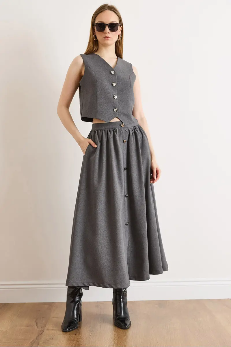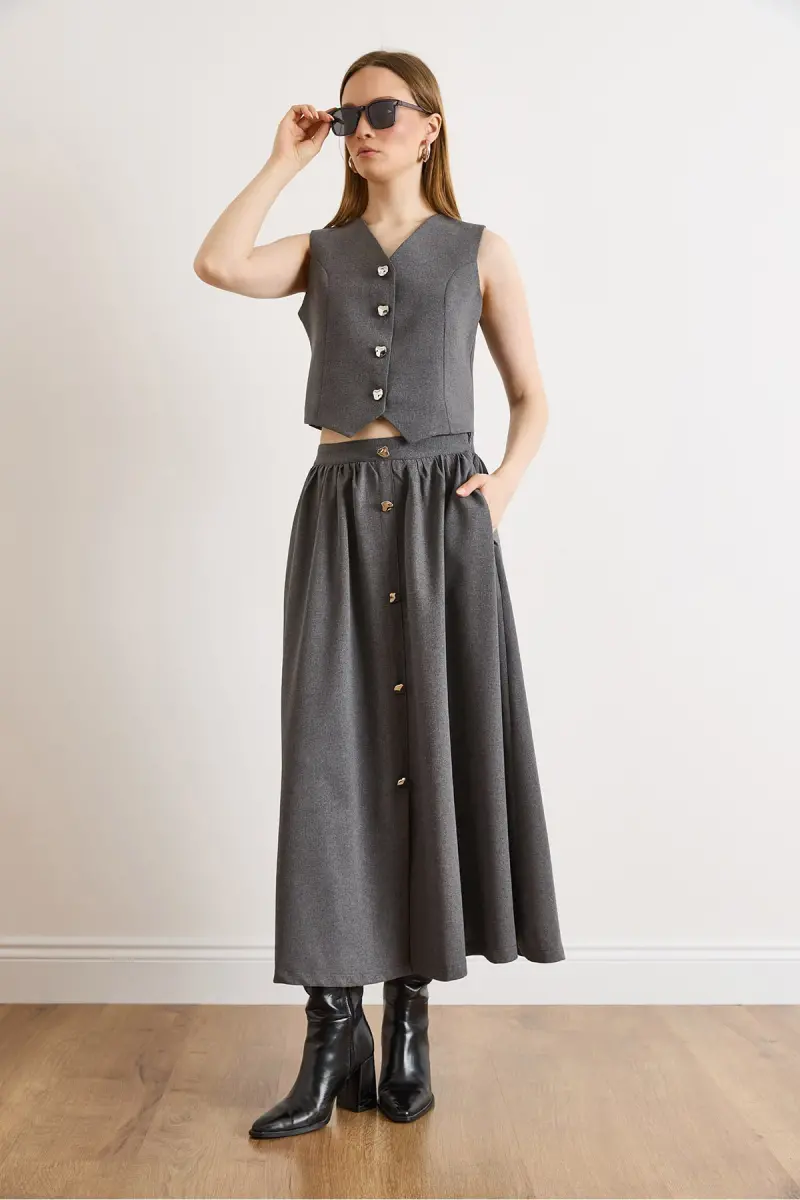 Kadın Füme Üst Astarlı Yelek Alt Düğmeli Kloş Etek Takım TKM-19000376-Füme
