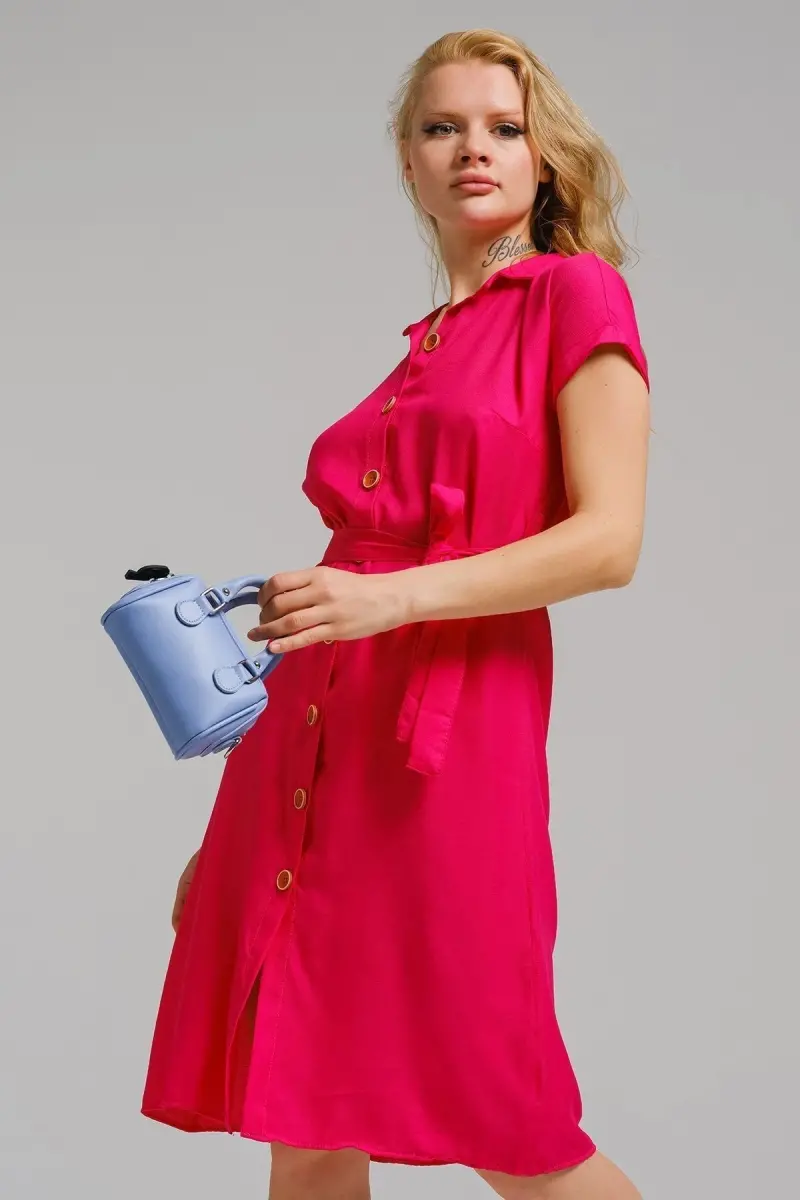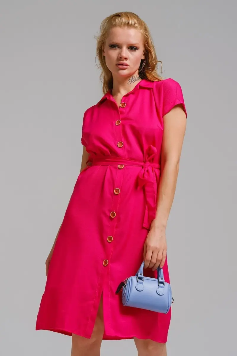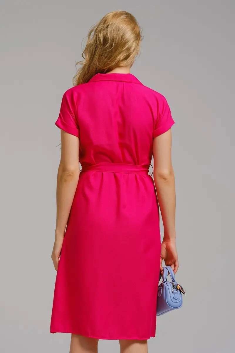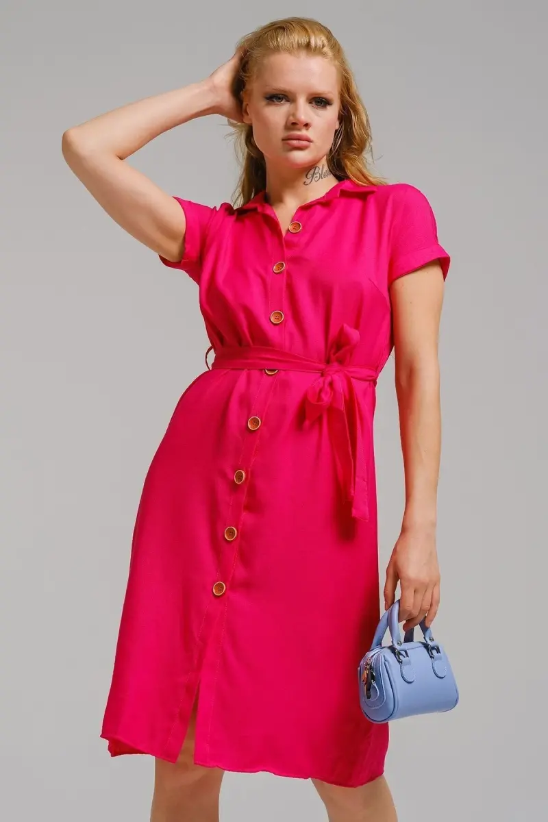 Kadın Fuşya Beli Kemerli Kısa Kol Gömlek Elbise ARM-19Y001068-Fuşya