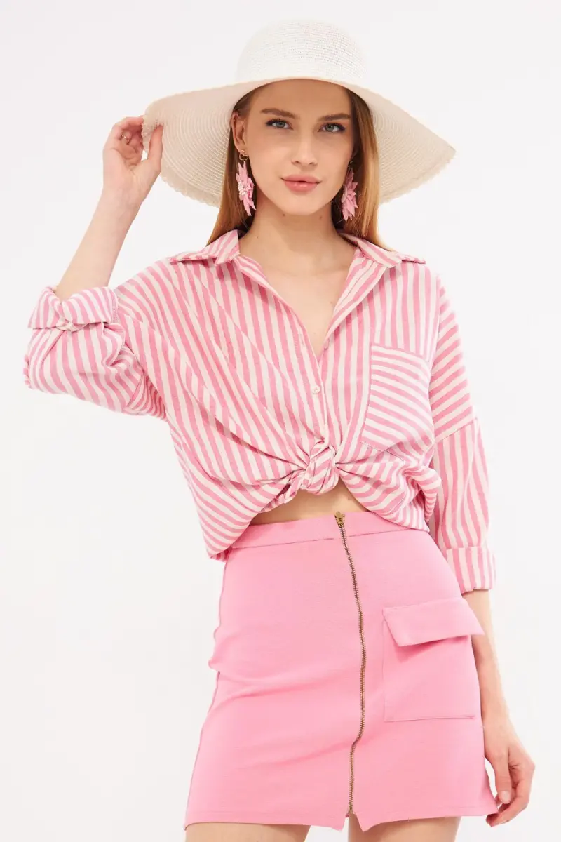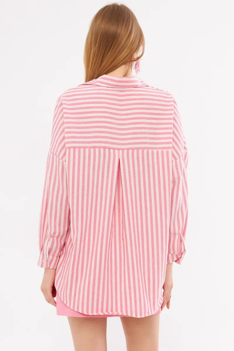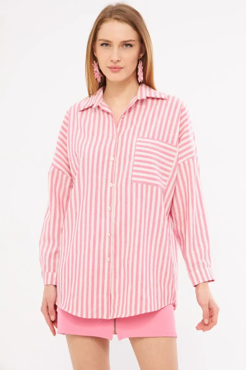 Kadın Fuşya Çizgili Uzun Kol Cep Detaylı Pileli Oversize Gömlek ARM-24Y001057-Fuşya