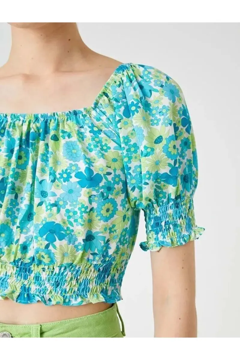 Kadın Giyim Bluz Crop Balon Kollu Gipe Detaylı 2SAK60239PW Mavi Desen Mavi Desen-Blue Desıgn