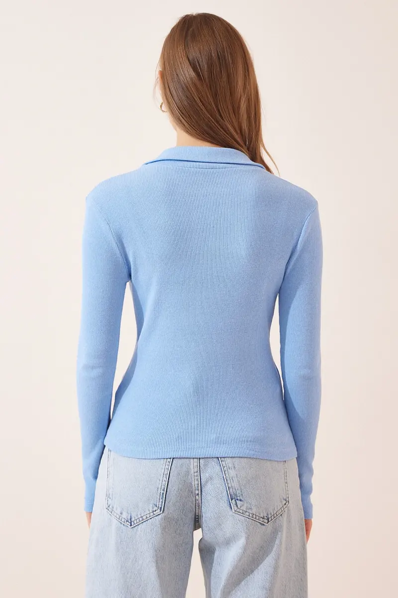 Kadın Gök Mavi Polo Yaka Fitilli Örme Bluz GT00111-Gök Mavi