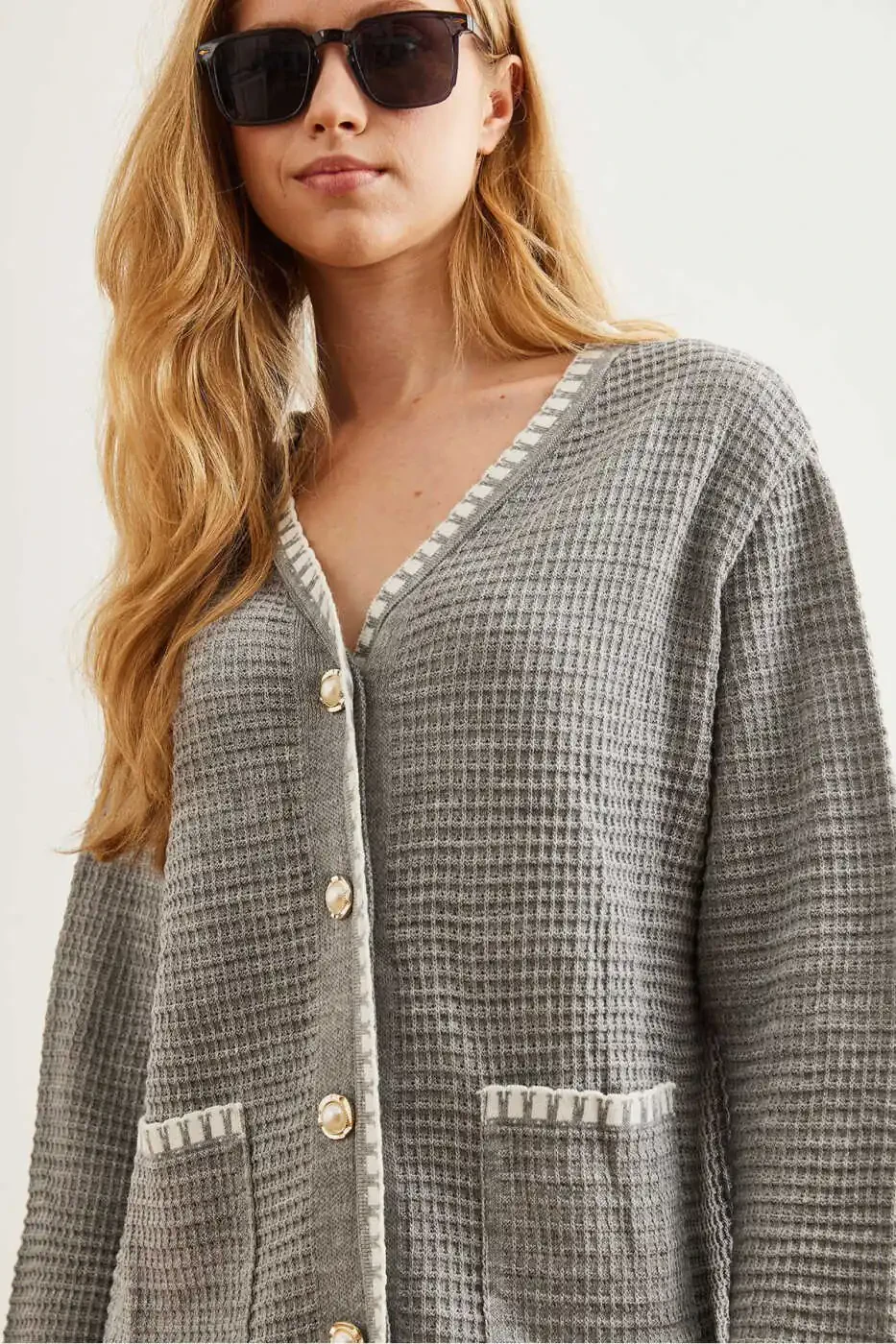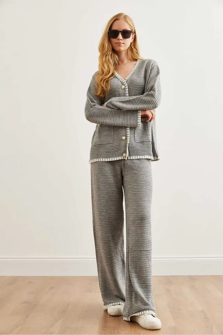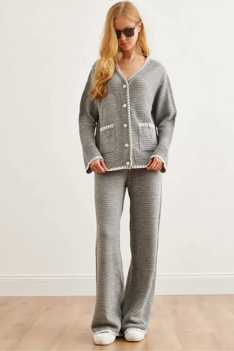 Kadın Gri Triko Takım, Biye Detaylı Triko, Triko Takım, Rahat Triko Takım, Stil Sahibi Triko Takım, Günlük Triko Takım, Soğuk Hava Triko Takım, Kalın Triko Takım, Esnek Triko Takım, Dayanıklı Triko Takım, V Yaka Triko Takım, Basic Triko Takım