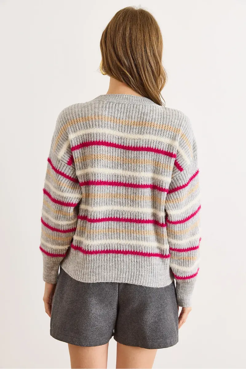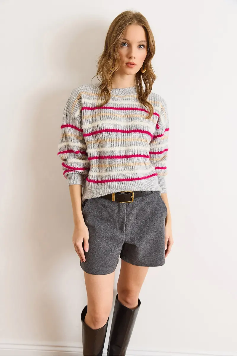 Kadın Gri Çizgili Sakal Detaylı Yumuşak Dokulu Triko Kazak KZK-19000893-Gri