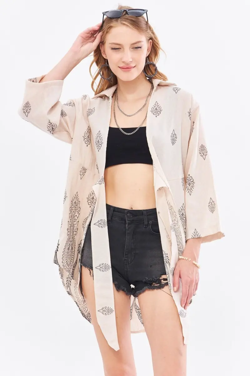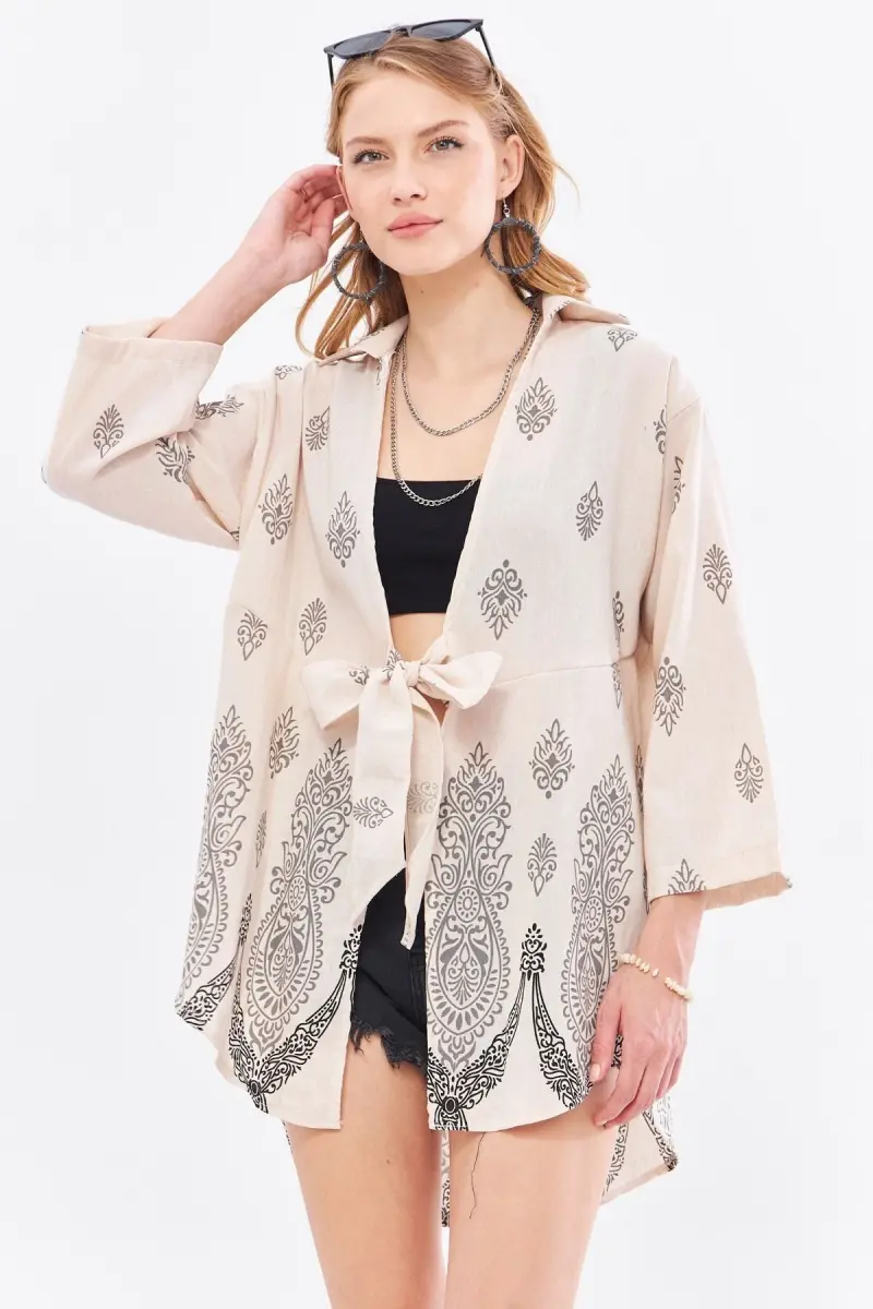 Kadın Gri Desenli Keten Görünümlü Eteği Sulu Önden Bağlamalı Kimono Gömlek ARM-24Y001092-Gri