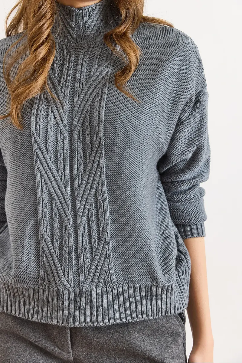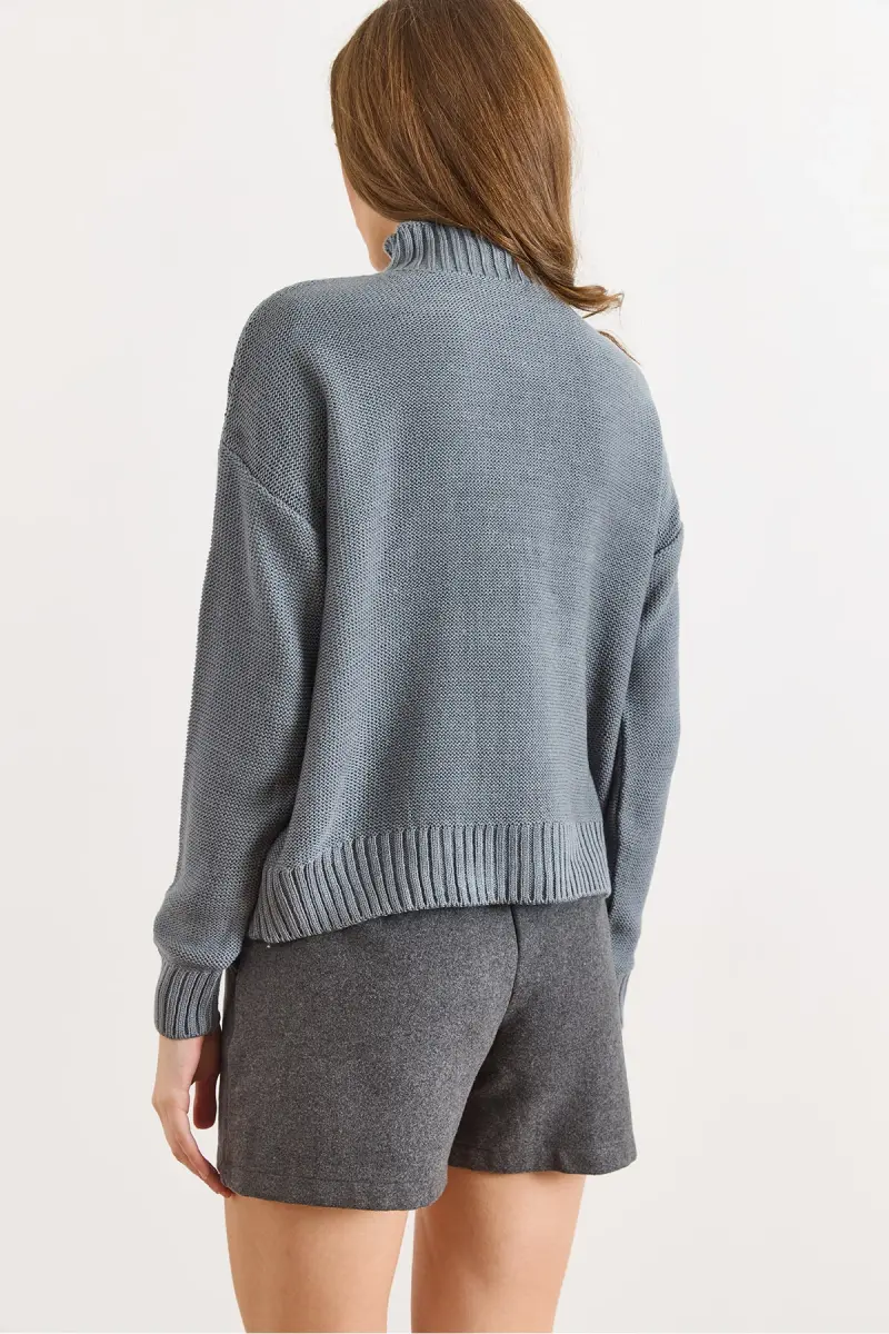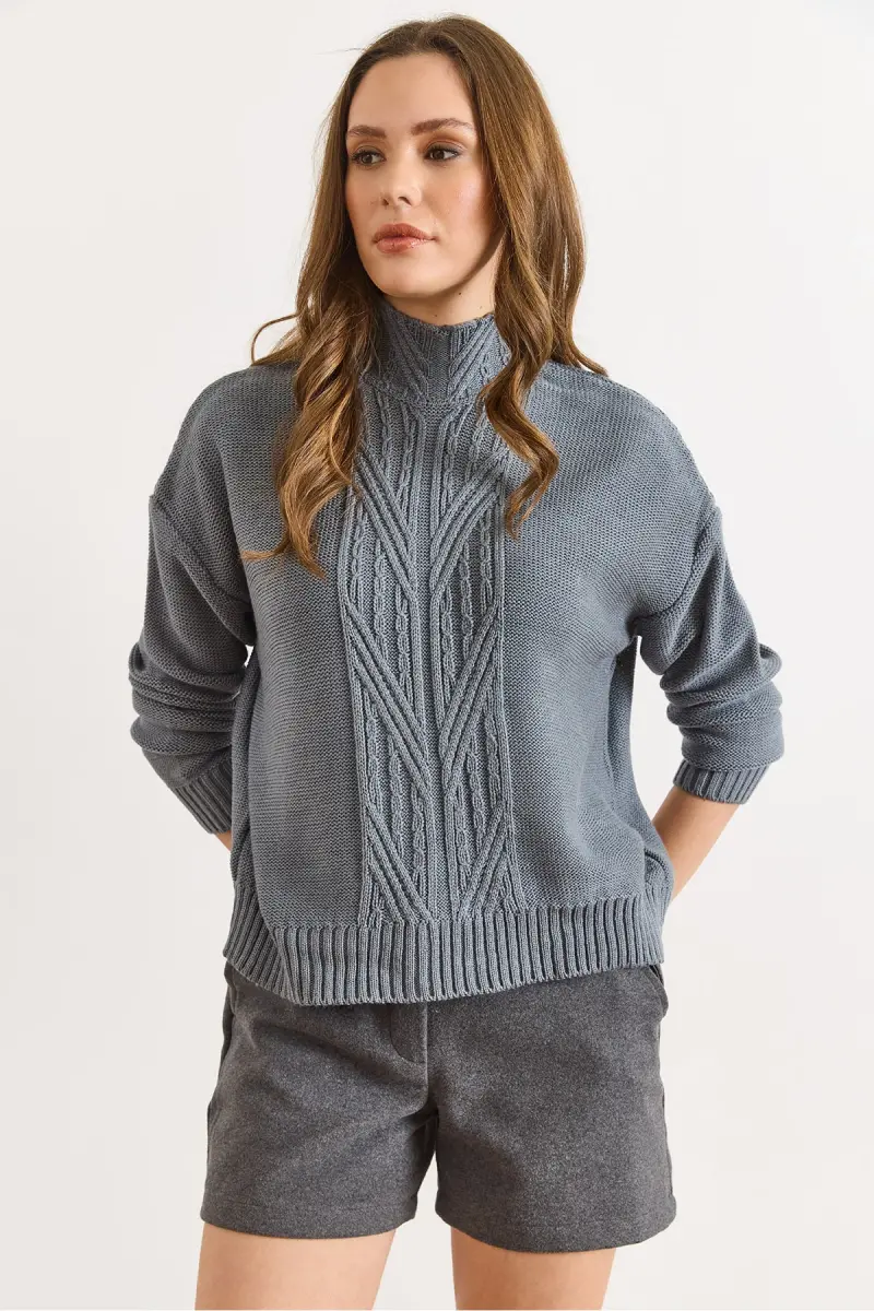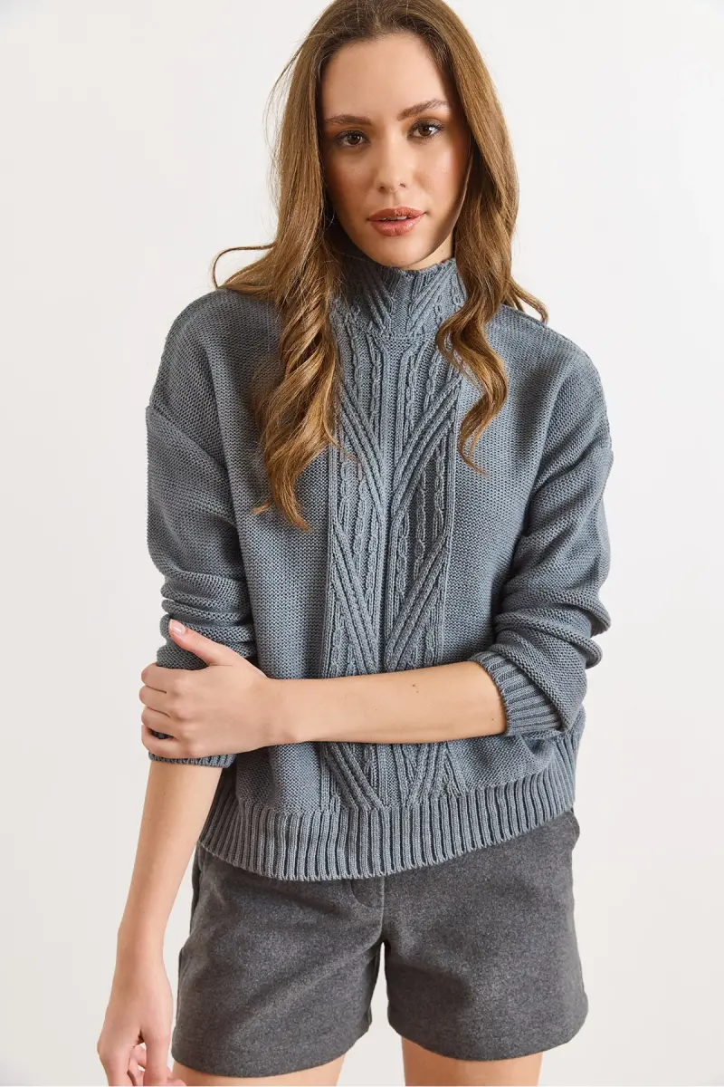 Kadın Gri Dik Yaka Ortası Saç Örgülü Triko Kazak KZK-19000912-Gri