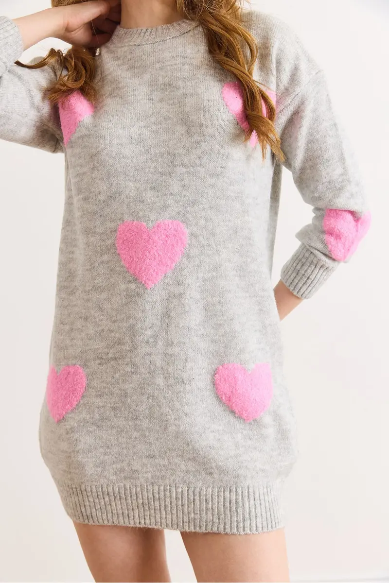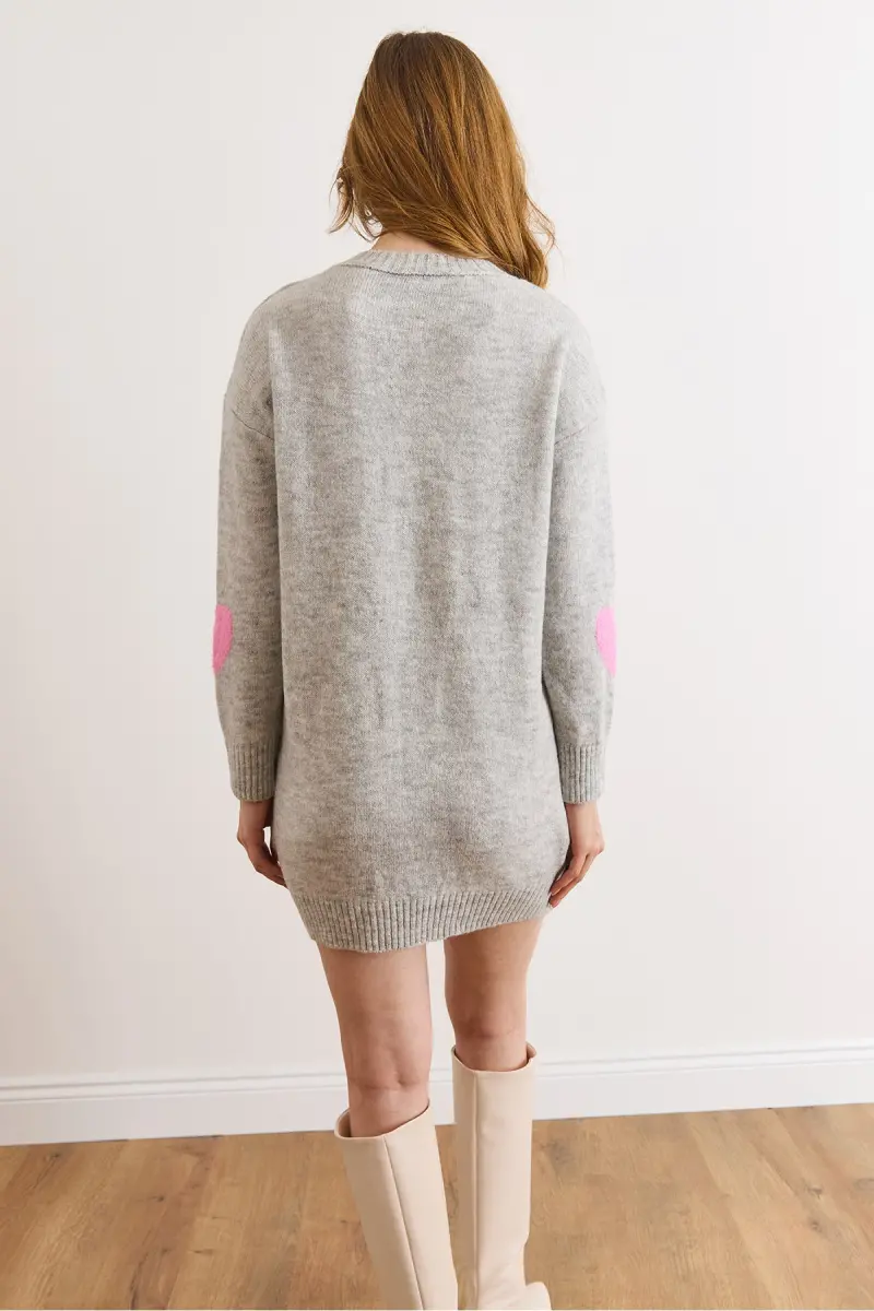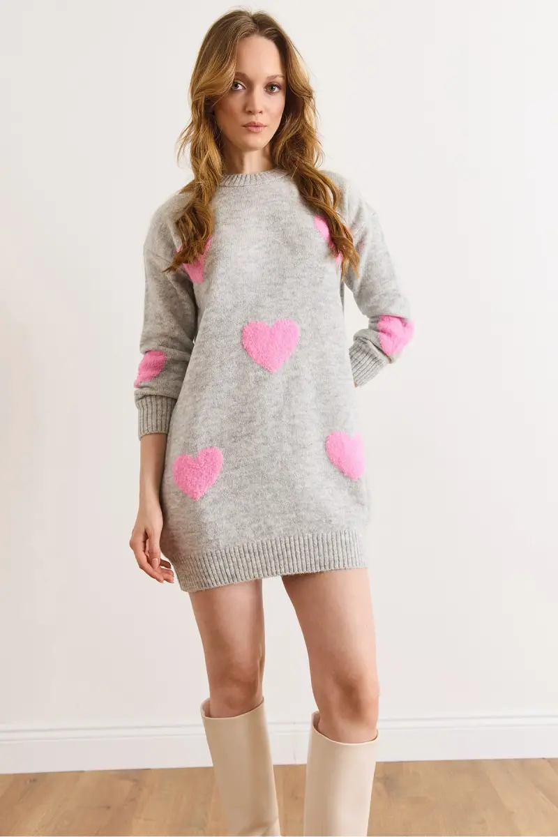 Kadın Gri Kalp Detaylı Yumuşak Dokulu Triko Tunik Elbise ELB-19002284-Gri