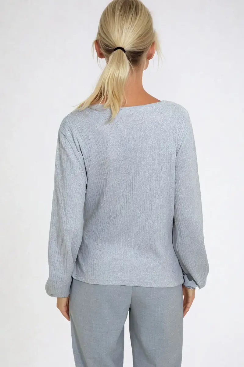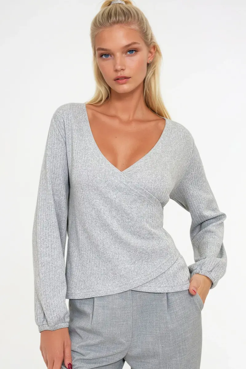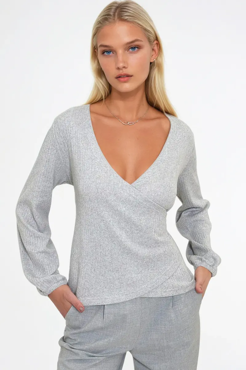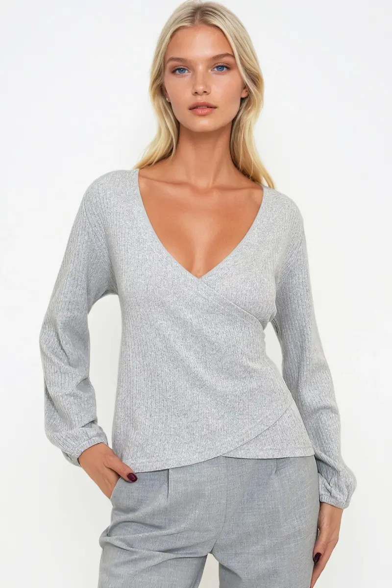 Kadın Gri Kruvaze Yaka Kolu Lastikli Bluz ALC-X12929-Gri