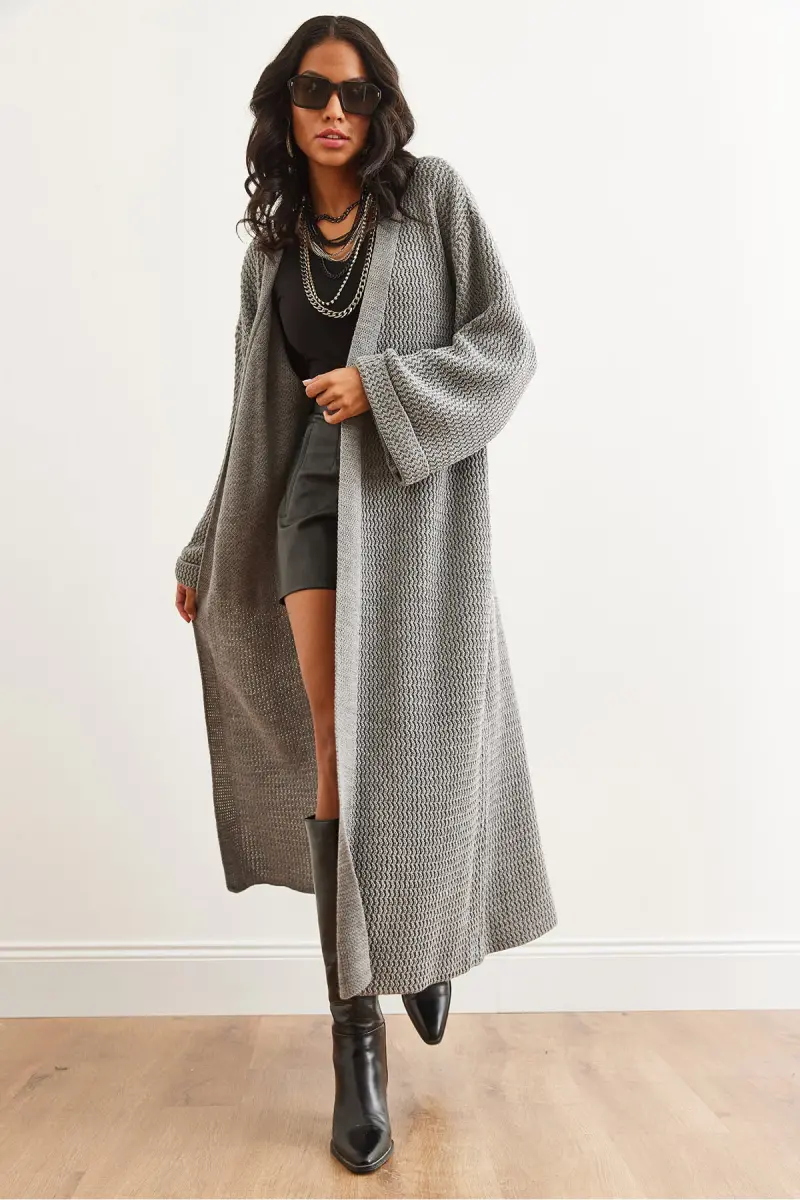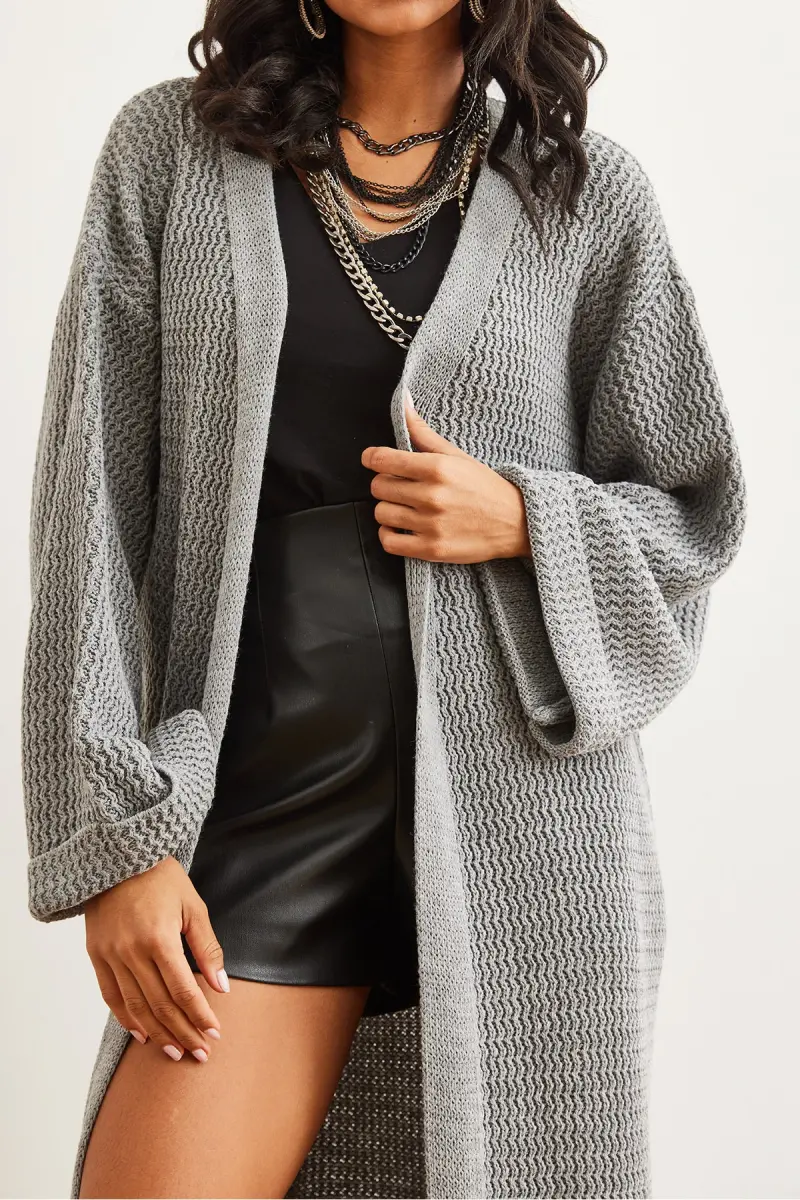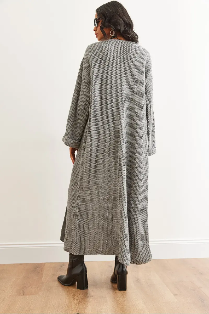 Kadın Gri Manşeti Katlamalı Maxi Triko Hırka HRK-19000297-Gri