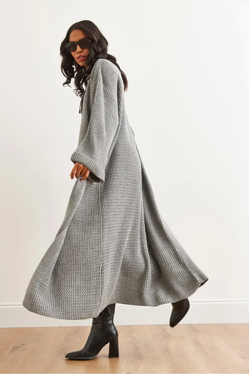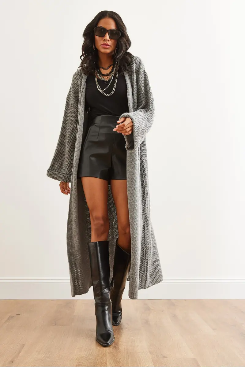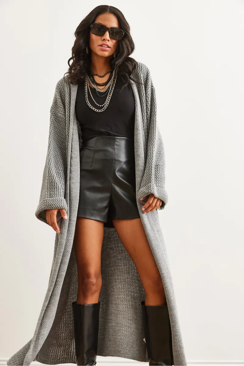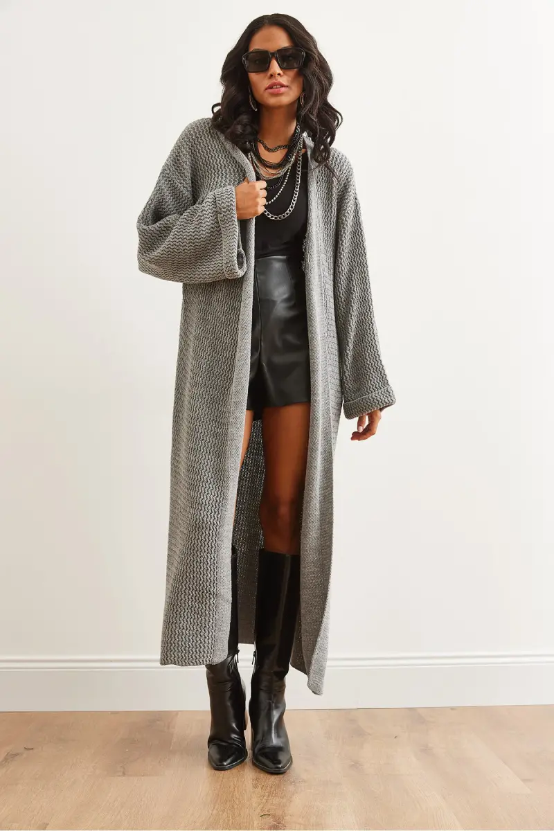 Kadın Gri Manşeti Katlamalı Maxi Triko Hırka HRK-19000297-Gri