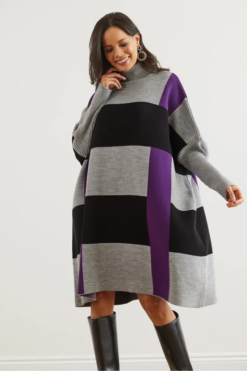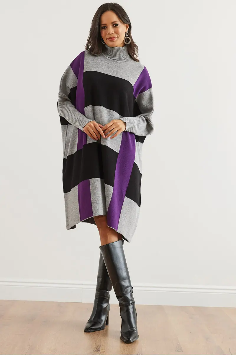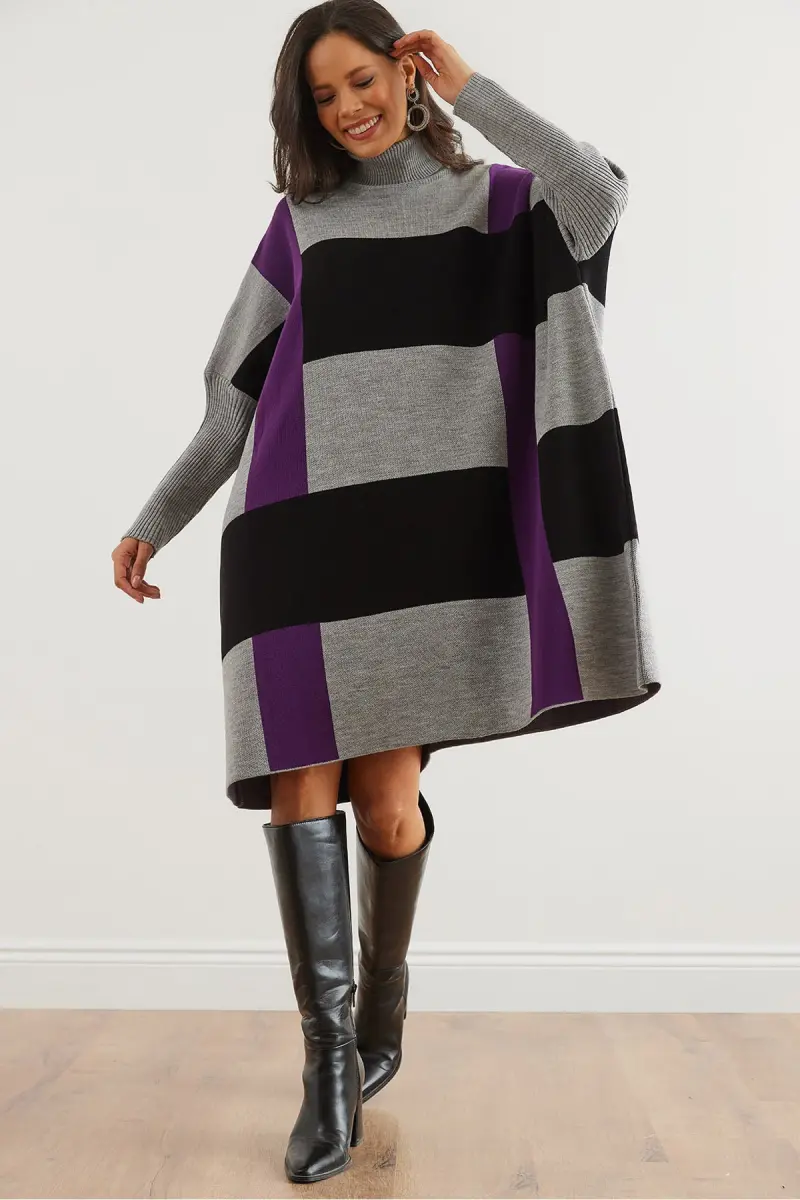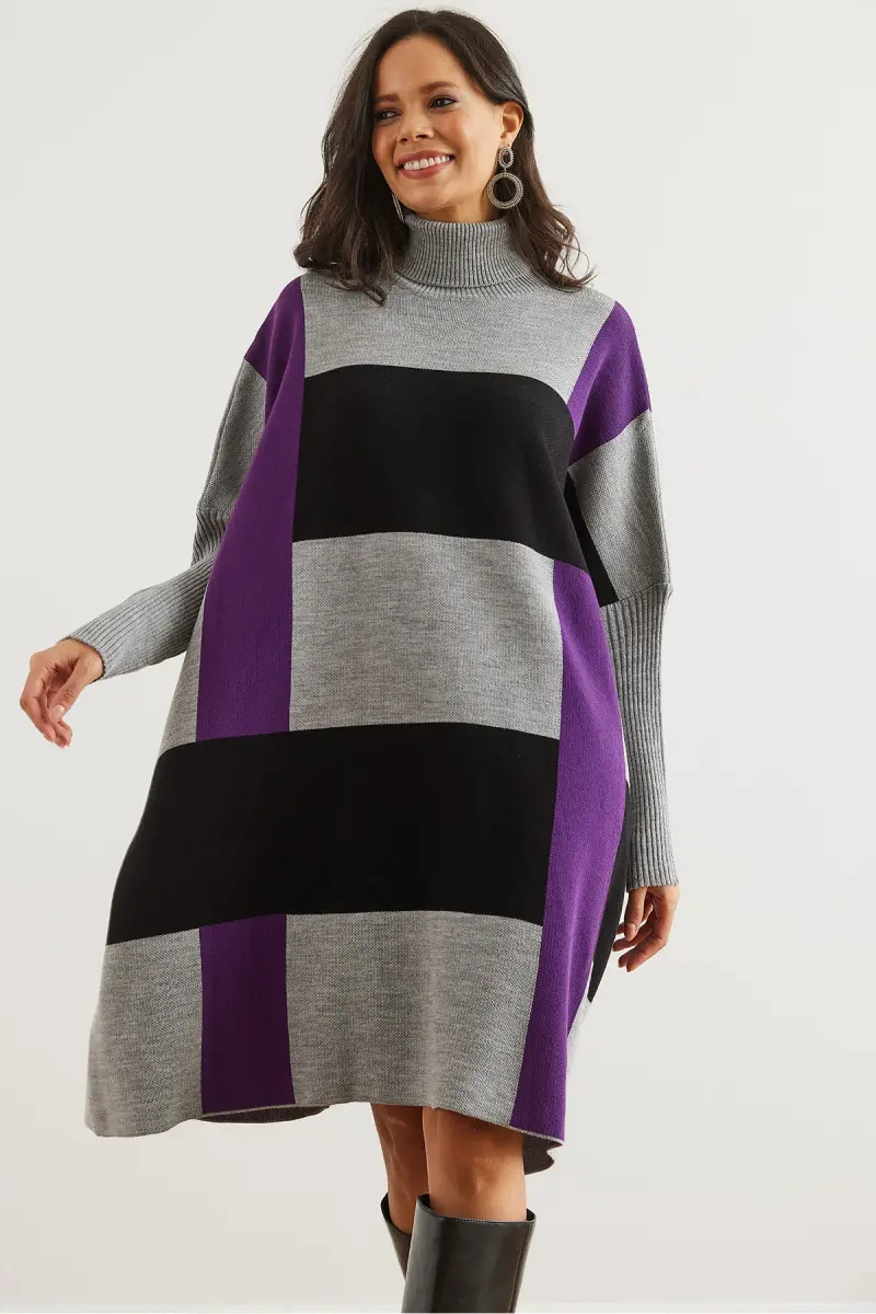 Kadın Gri Mor Ekose Kalın Panço Tunik Elbise ELB-19002323-Gri Mor