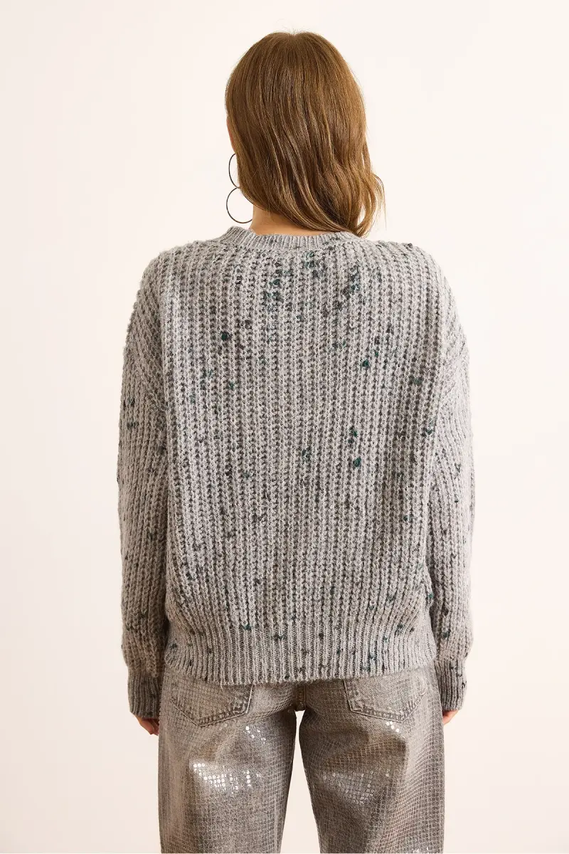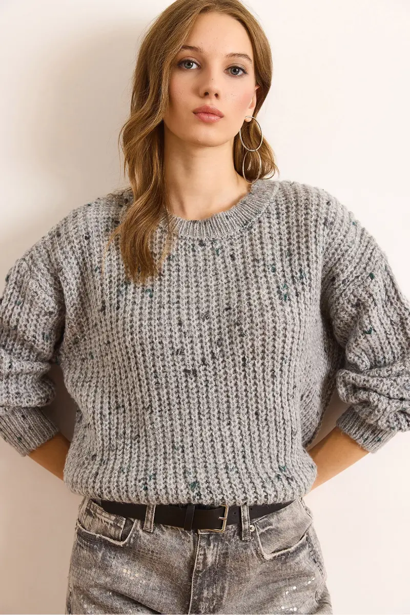 Kadın Gri Renk Detaylı Yumuşak Detaylı Oversize Triko Kazak KZK-19000862-Gri