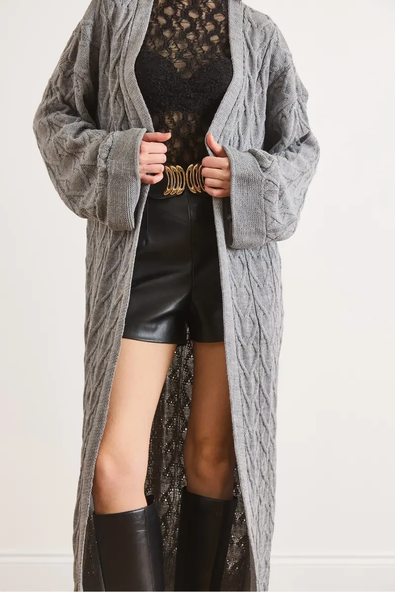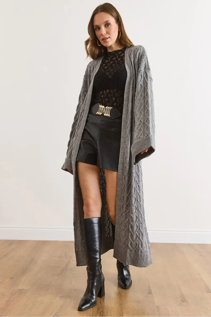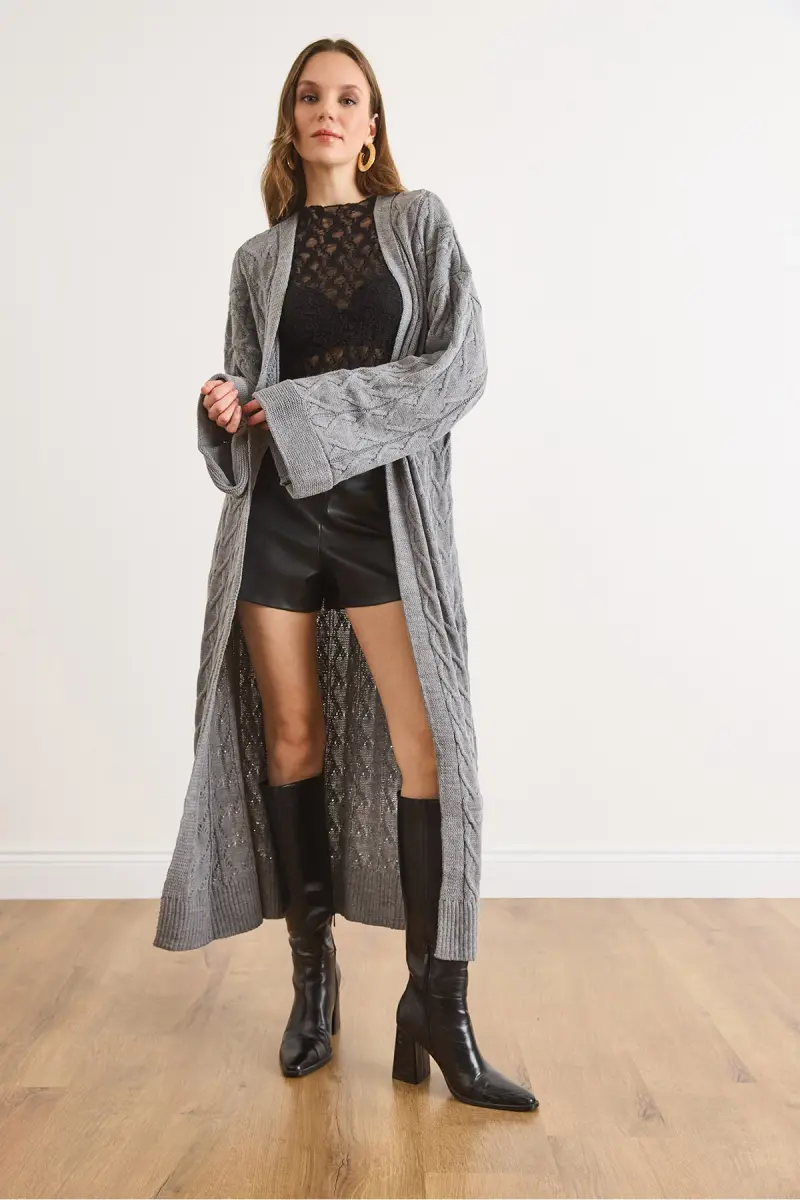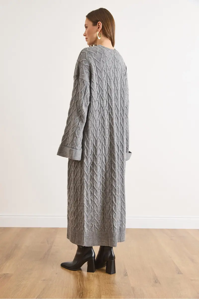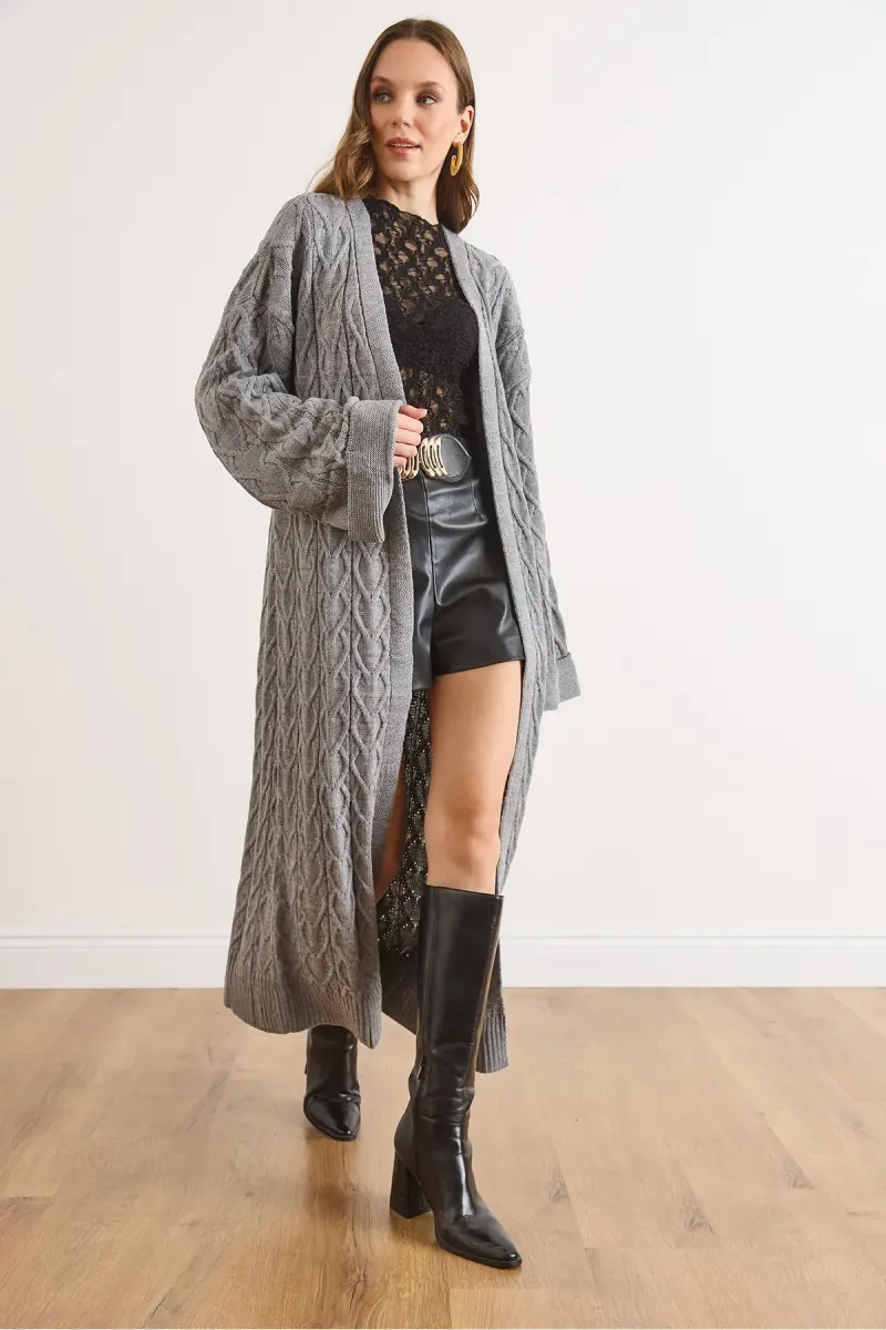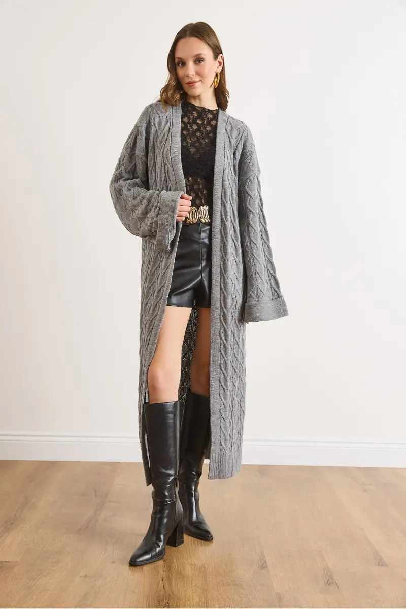 Kadın Gri Saç Örgü Manşet Katlamalı Maxi Triko Hırka HRK-19000327-Gri