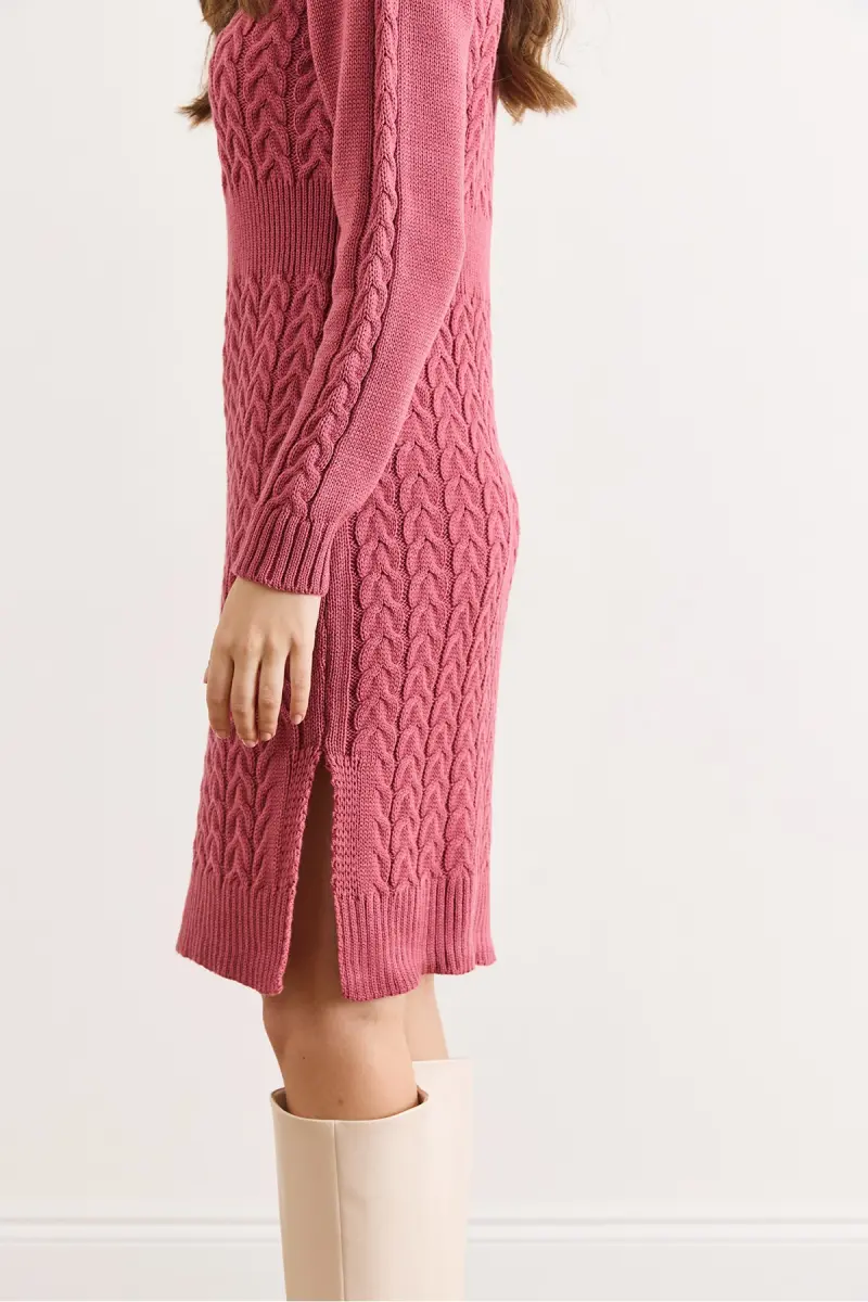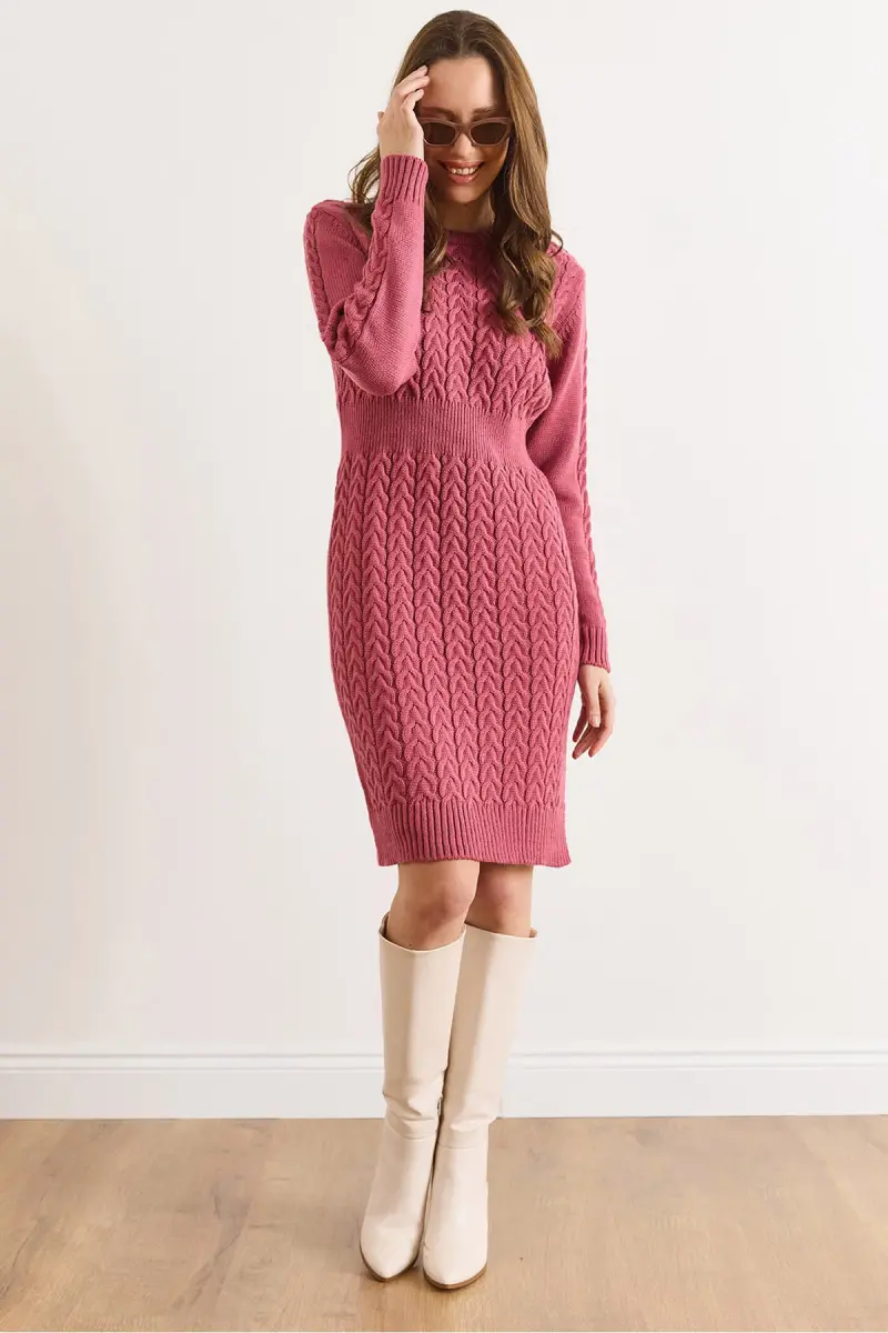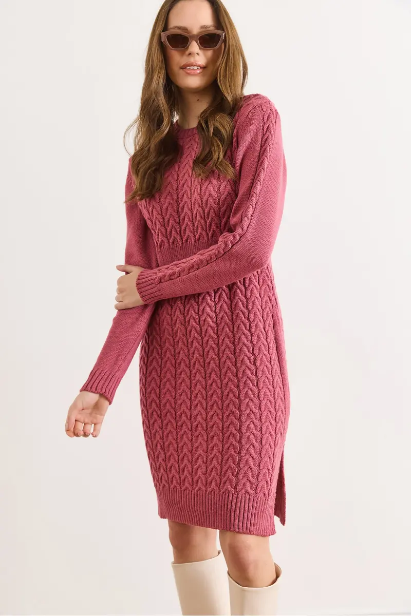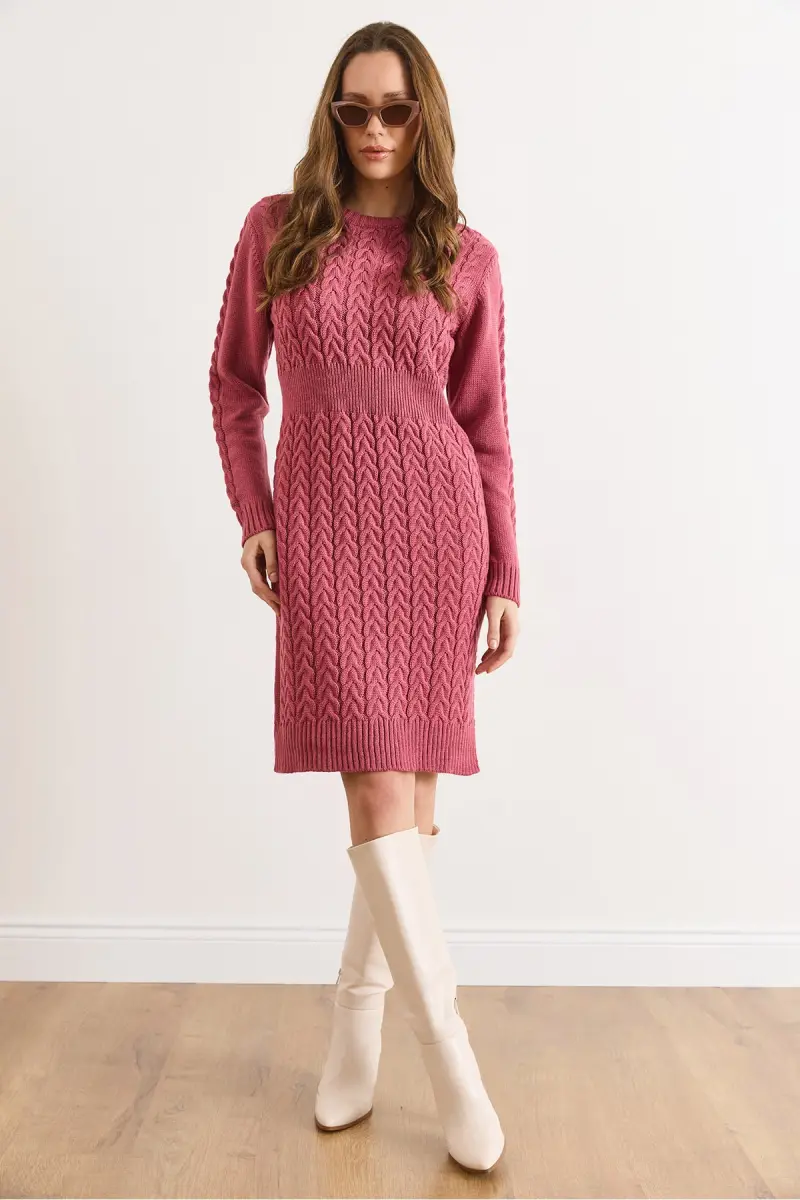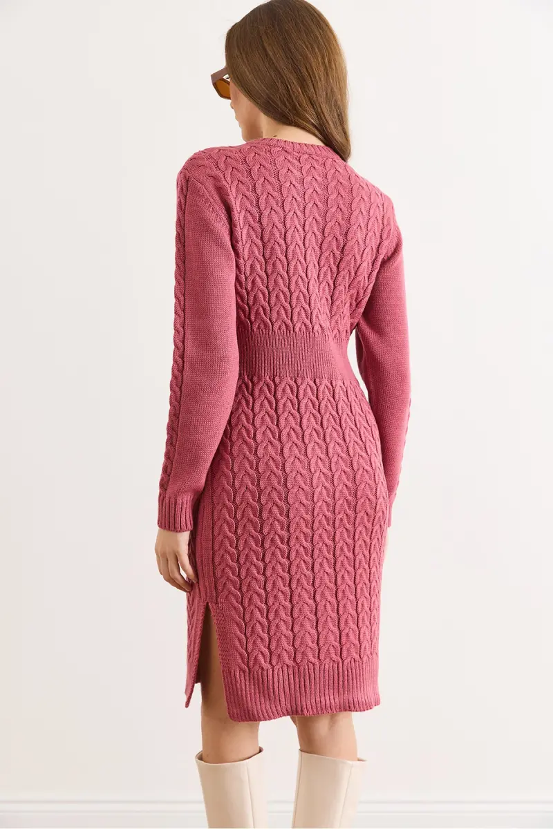 Kadın Gül Kurusu Beli Bantlı Yırtmaçlı Saç Örgü Mini Elbise ELB-19002289-Gül Kurusu
