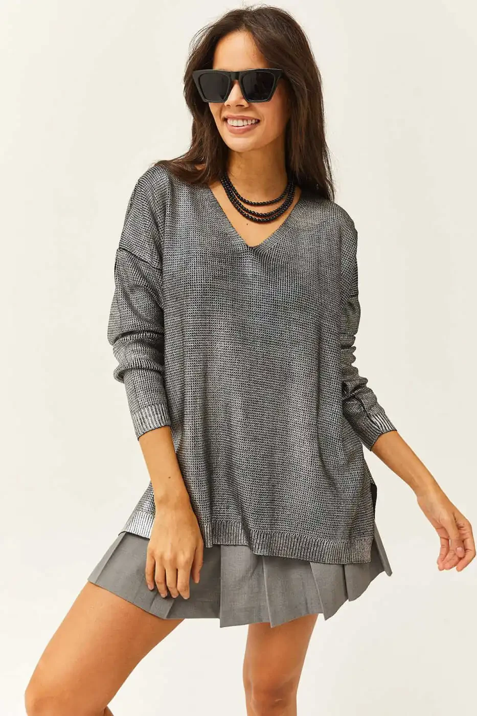 Kadın Triko Kazak, Gümüş V Yaka, Salaş Metalik Triko, Uzun Kollu Triko, Rahat Triko, V Yaka Triko