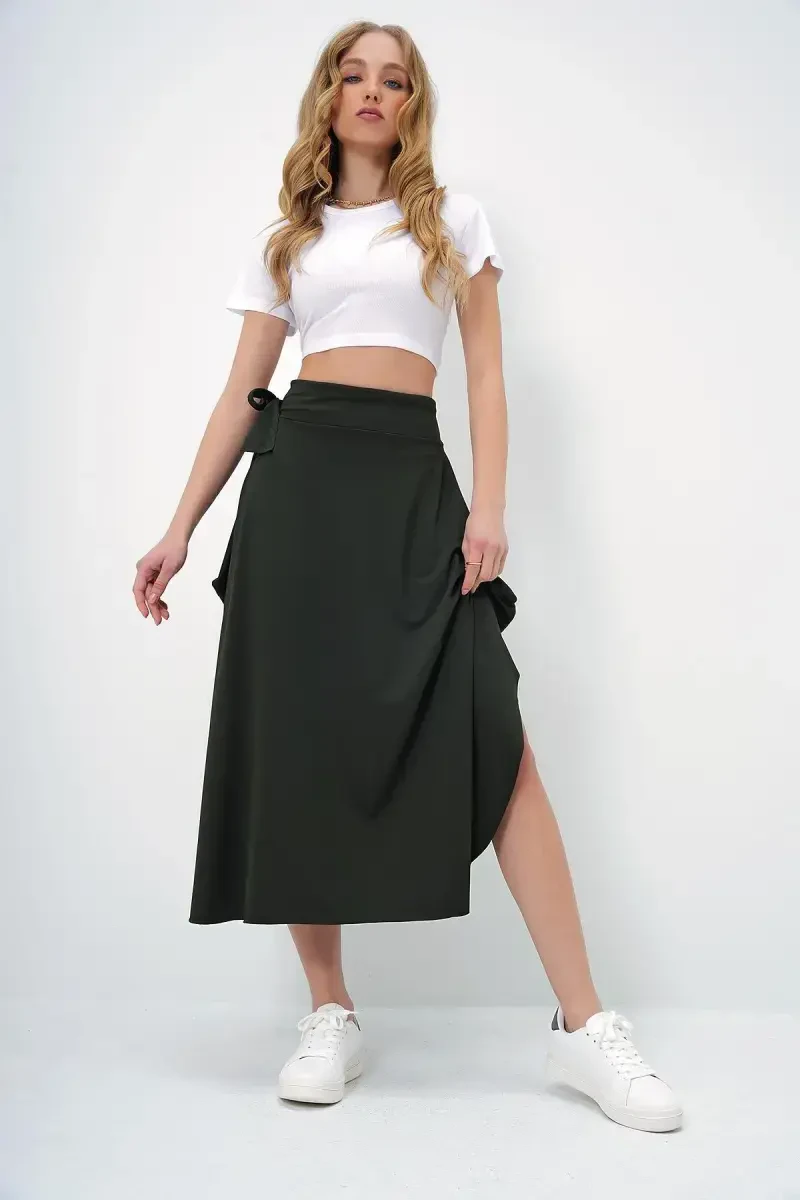 This skirt is a perfect choice for women looking for a stylish and comfortable look. Its asymmetrical cut and belted design provide a perfect fit for your body. The khaki color easily complements any outfit.