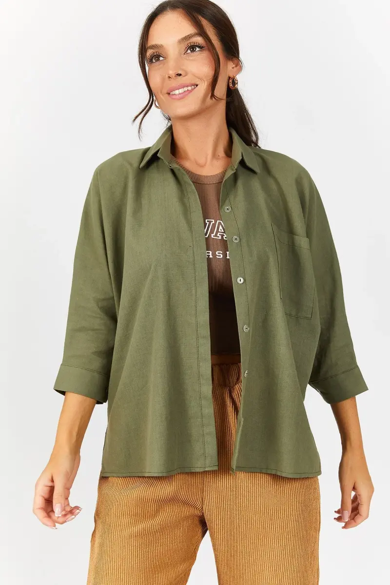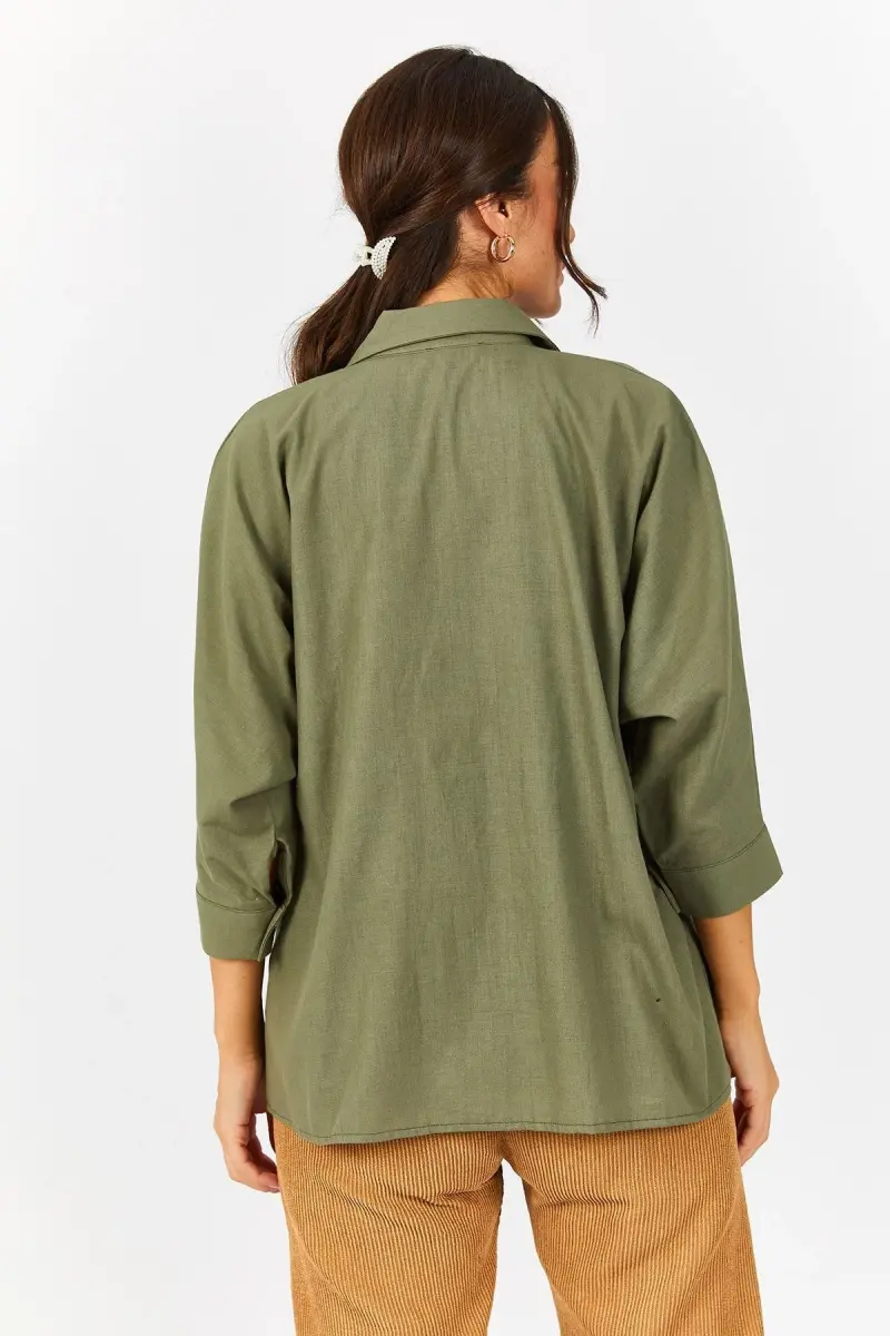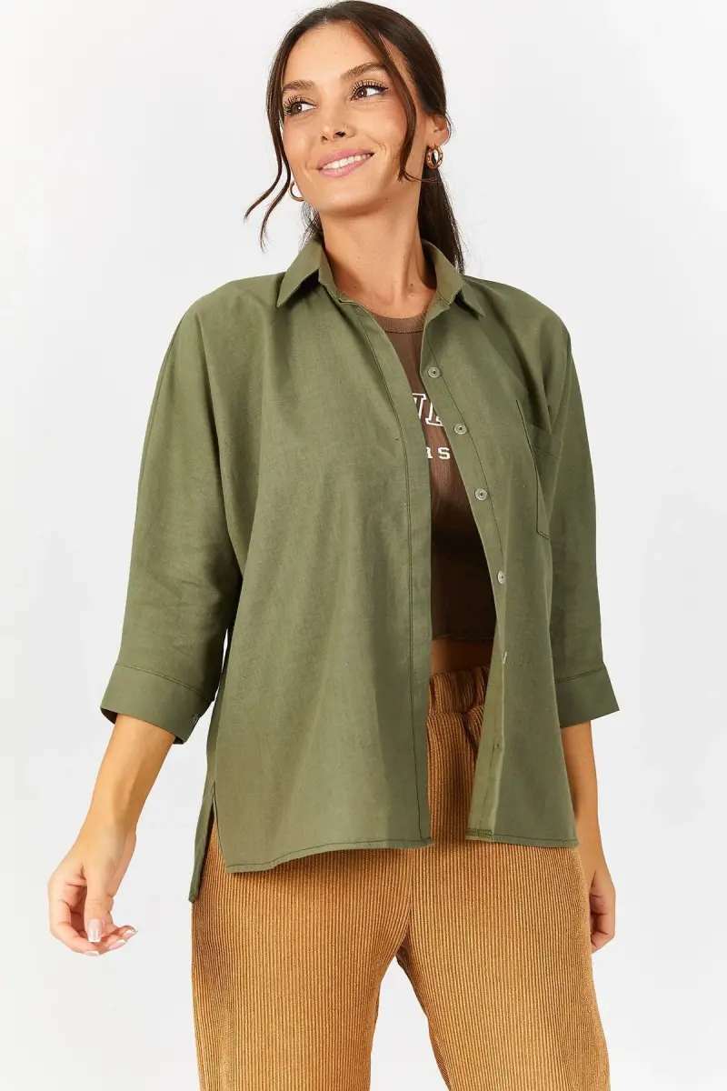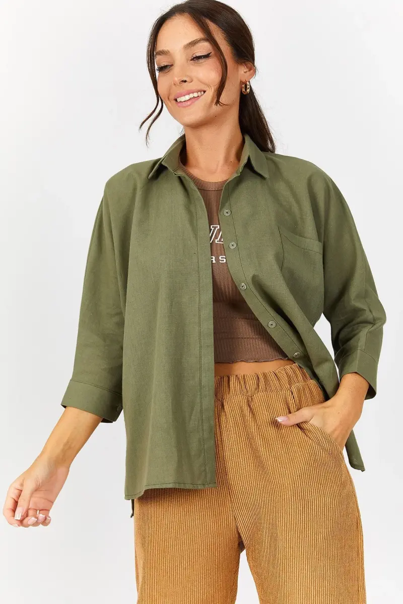 Kadın Haki Cepli Salaş Keten Gömlek ARM-21Y001035-Haki