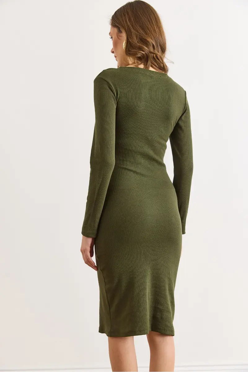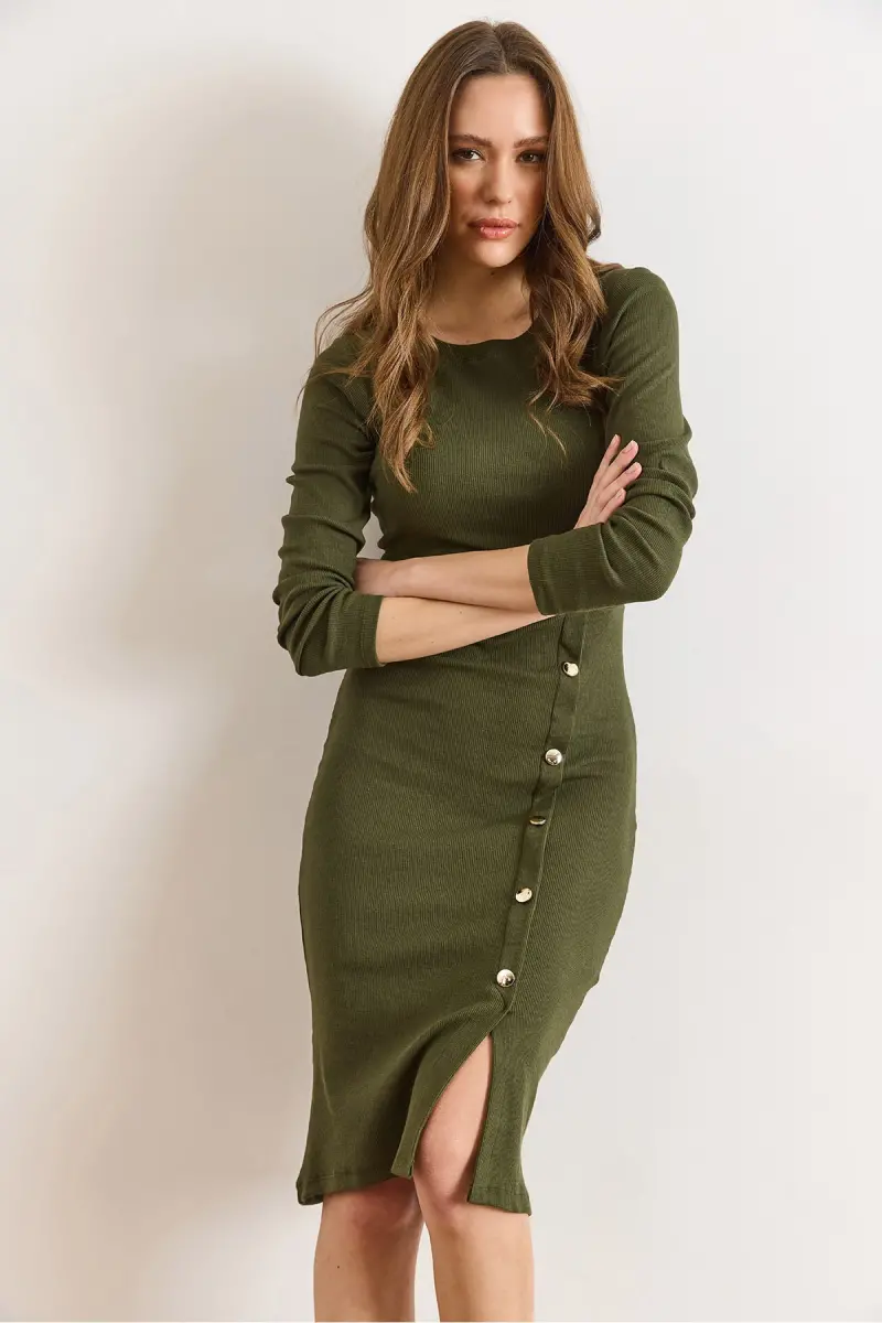 Kadın Haki Düğme Detaylı Yırtmaçlı Midi Esnek Elbise ELB-19002256-Haki