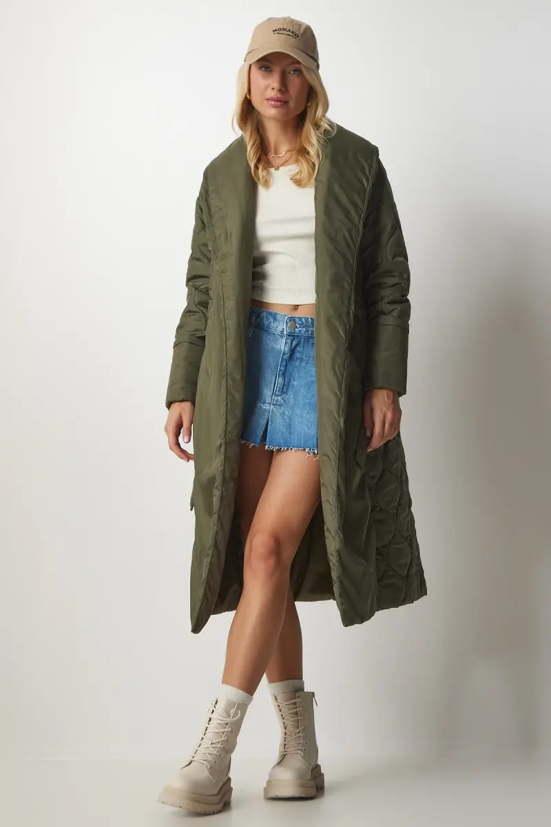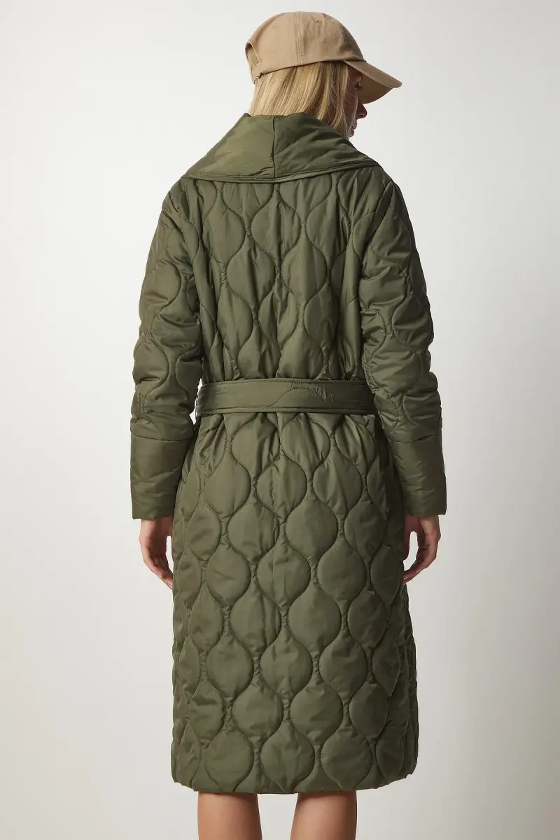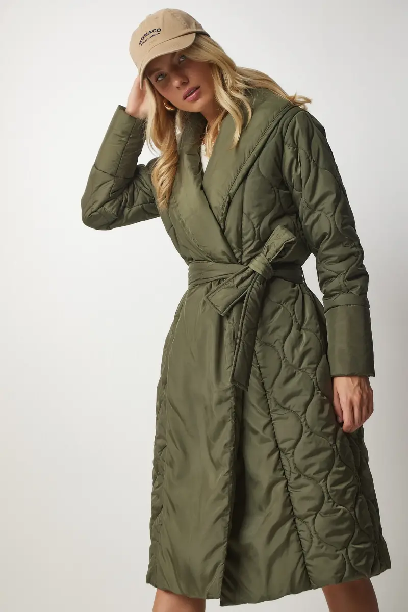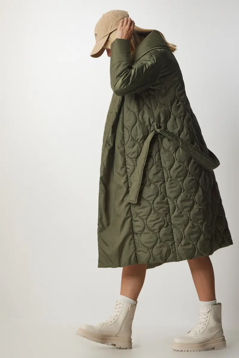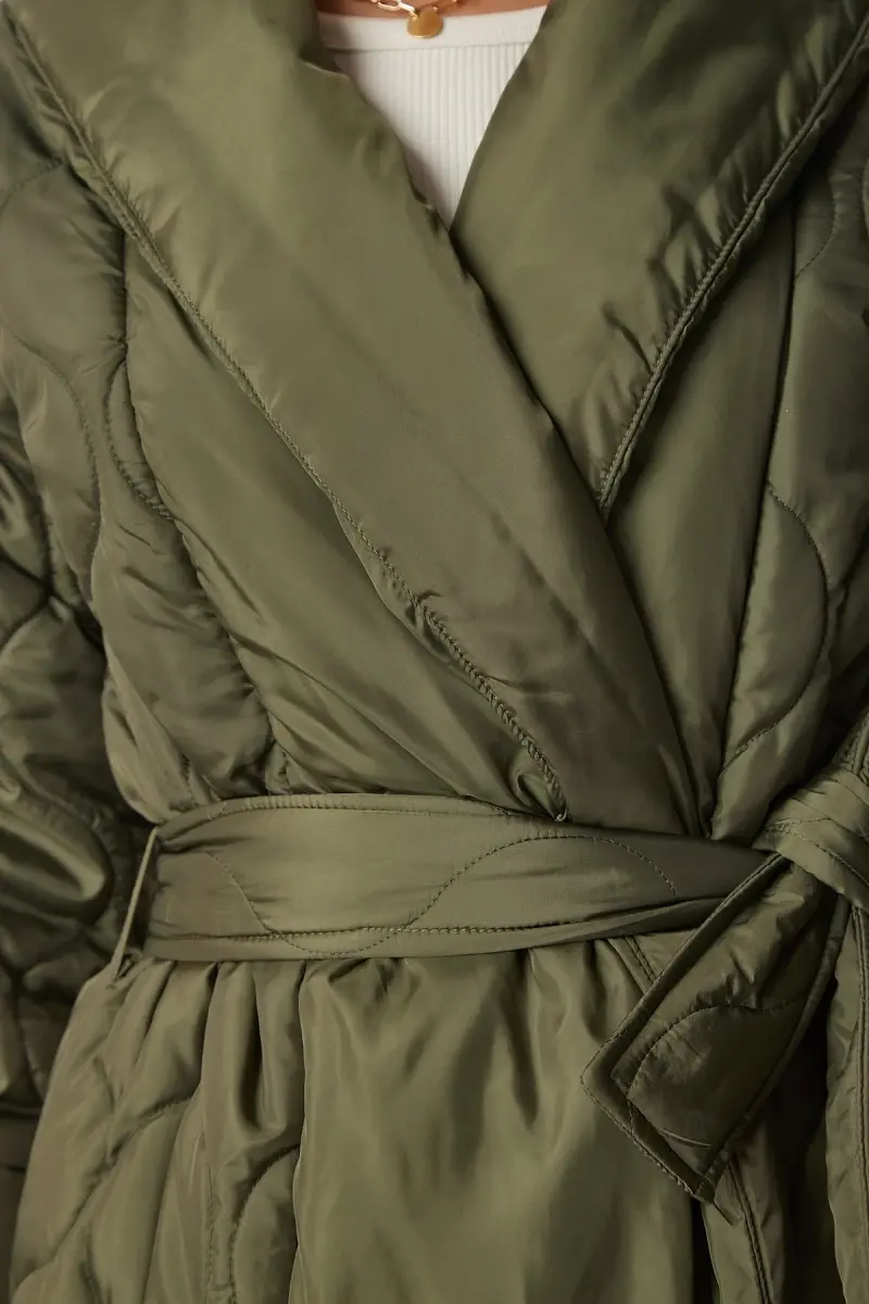 Kadın Haki Kuşaklı Şal Yaka Kapitone Kaban dz00089-Haki