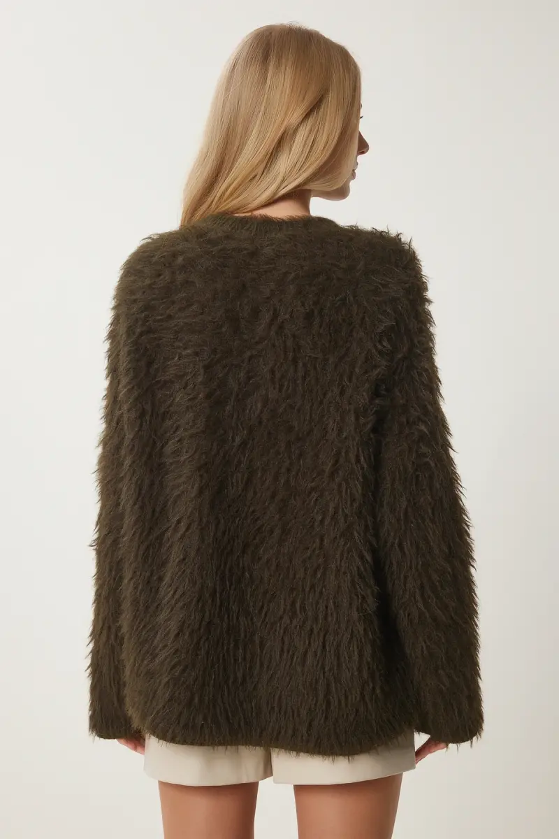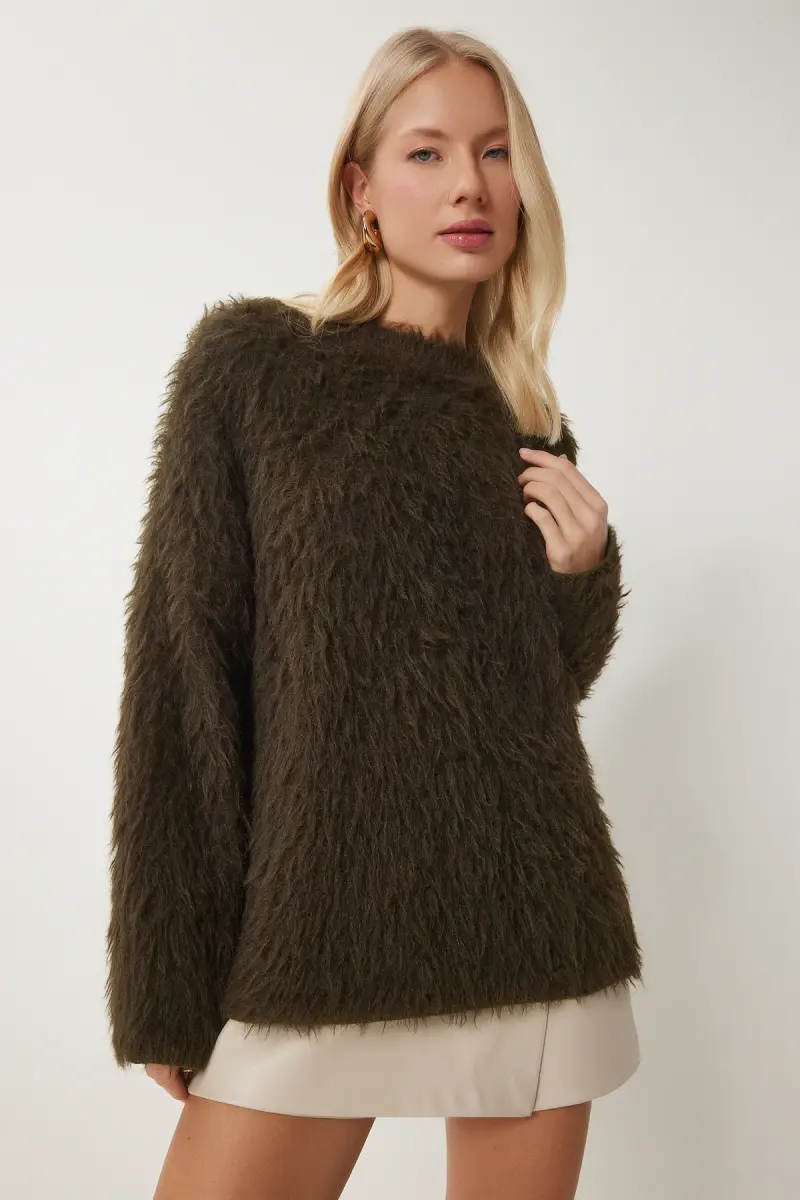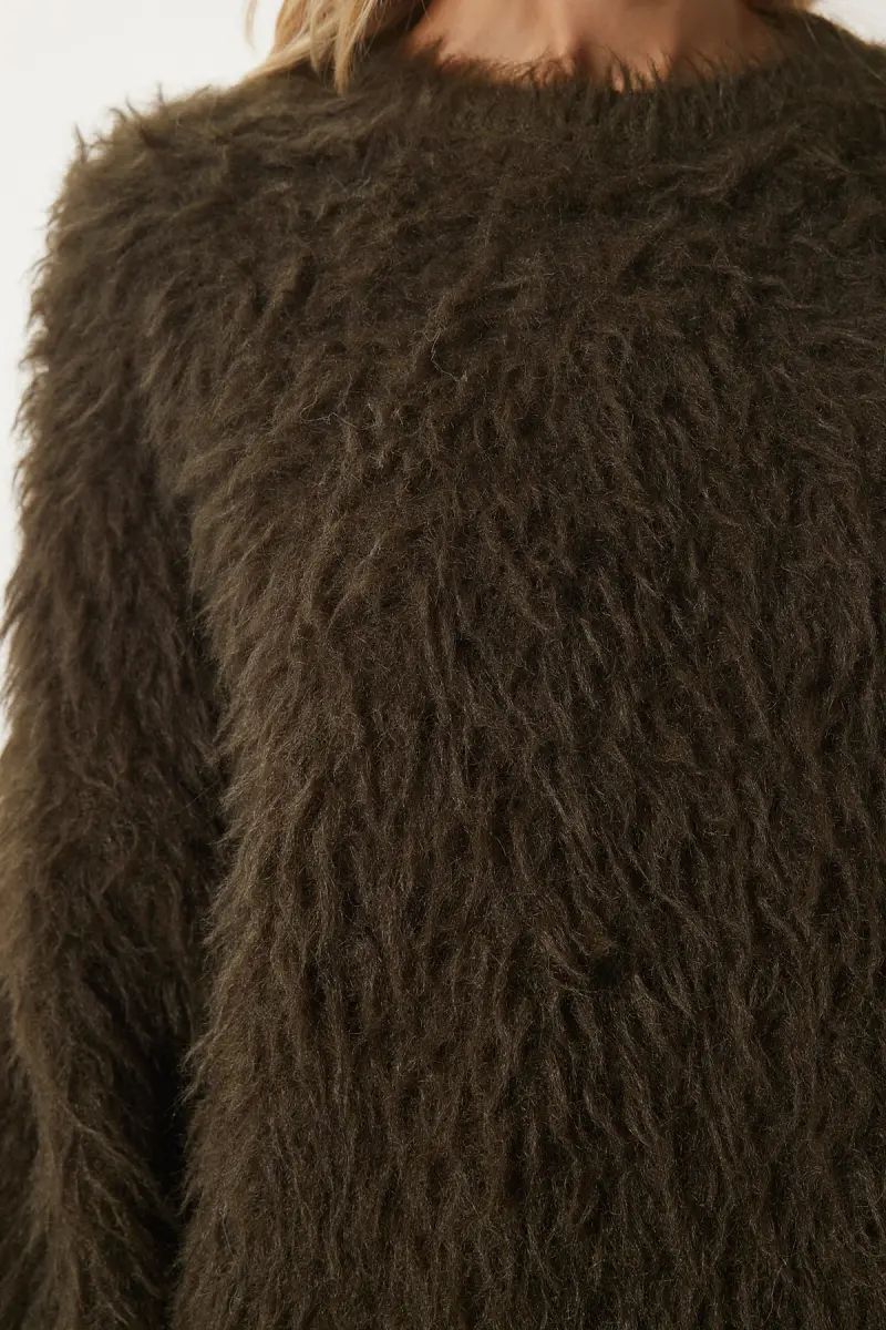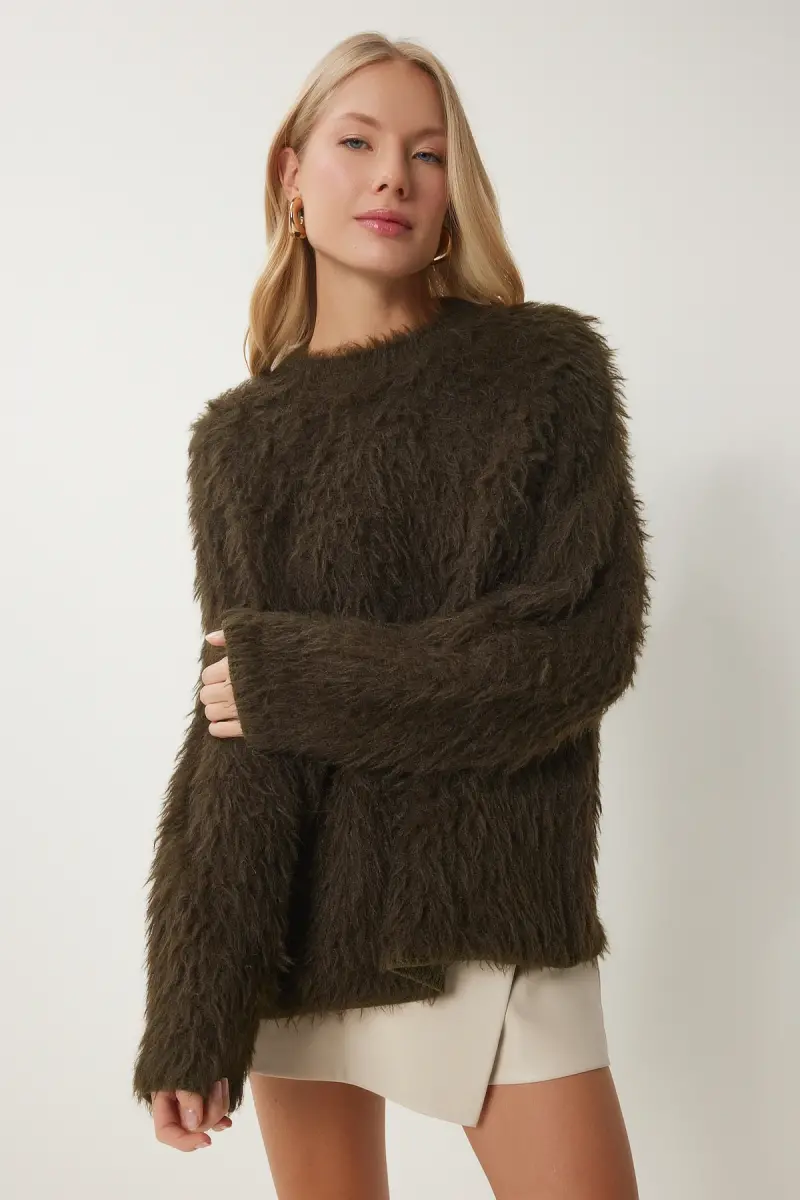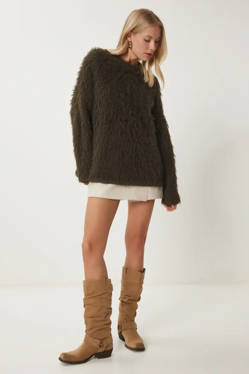 Kadın Haki Sakallı Yumuşak Dokulu Triko Kazak US00950-Haki