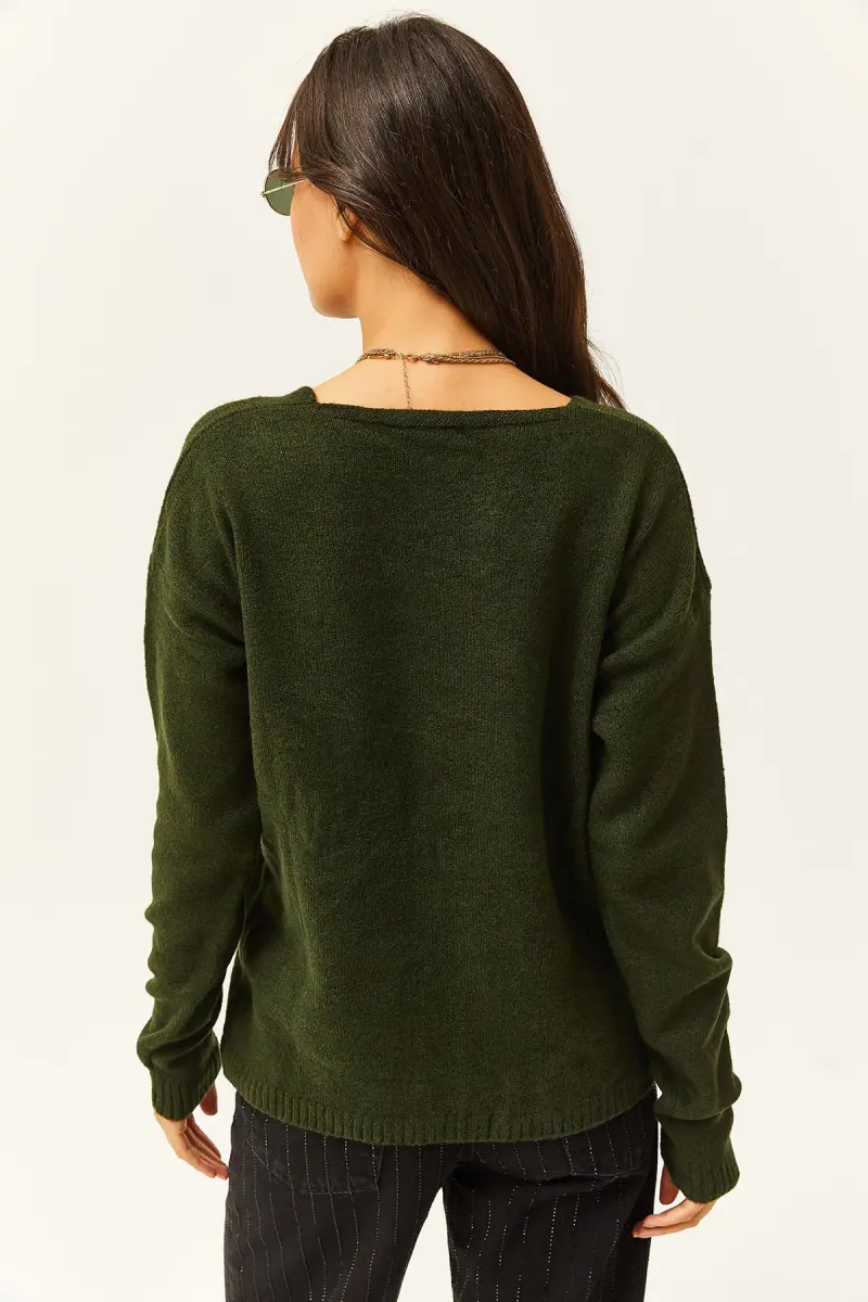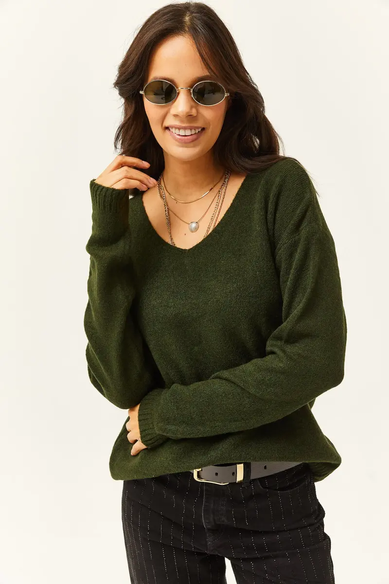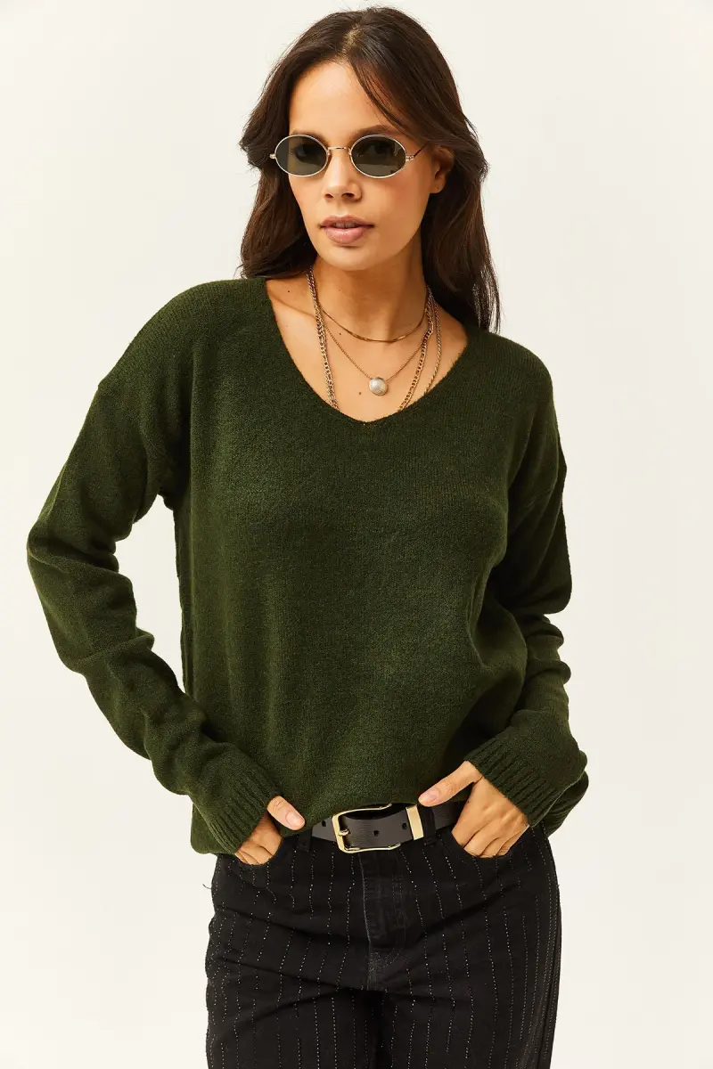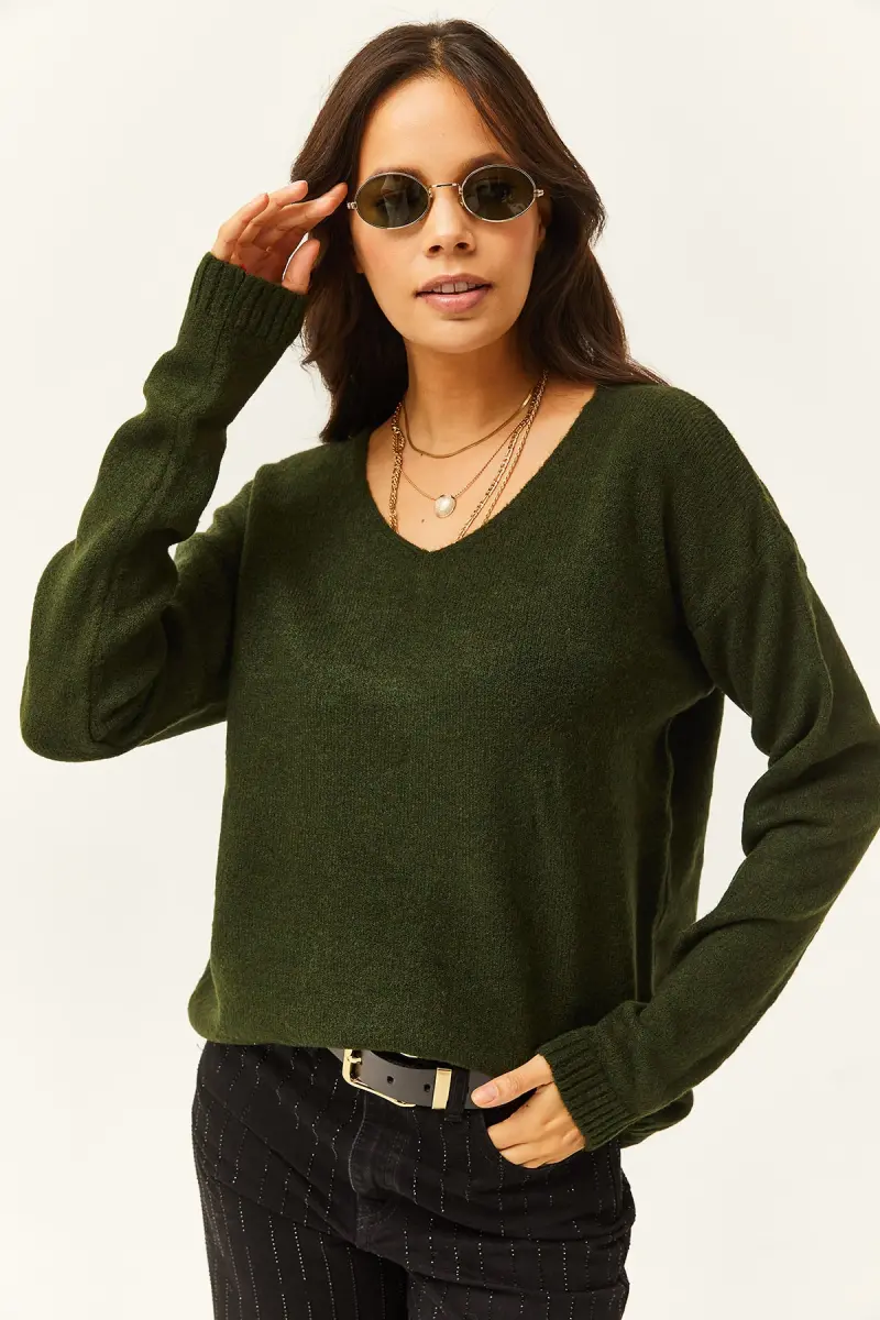 Kadın Haki V Yaka Yumuşak Dokulu Triko Kazak KZK-19000598-Haki