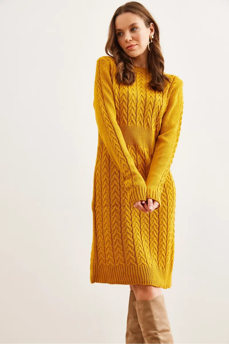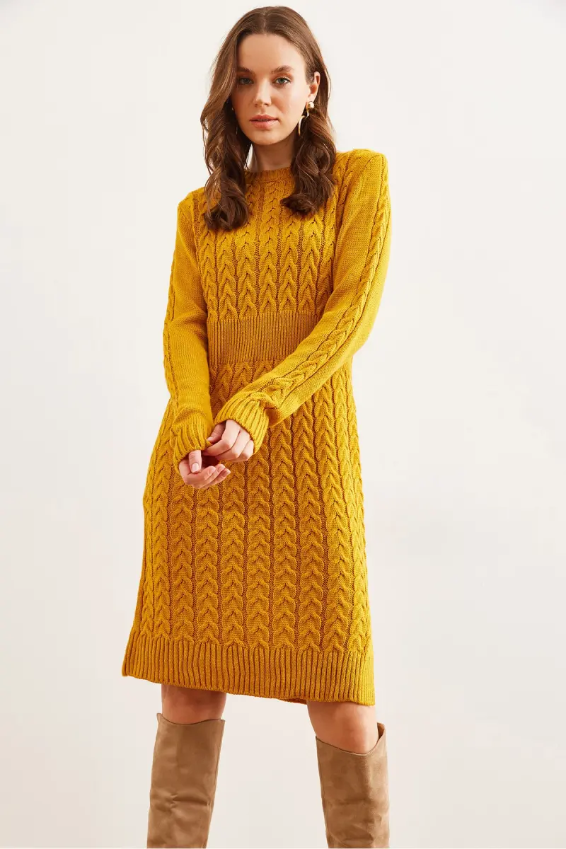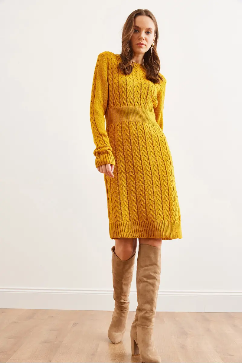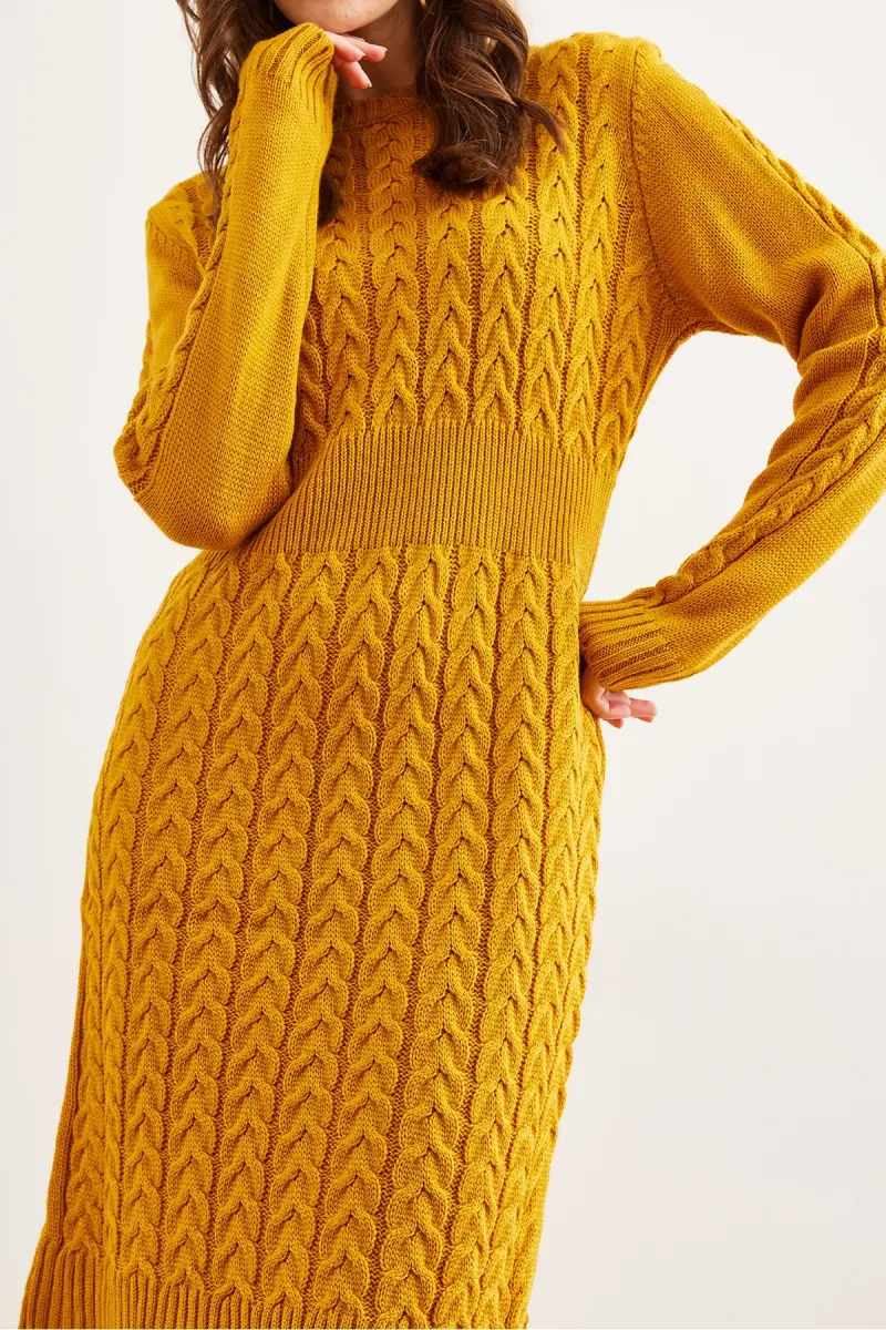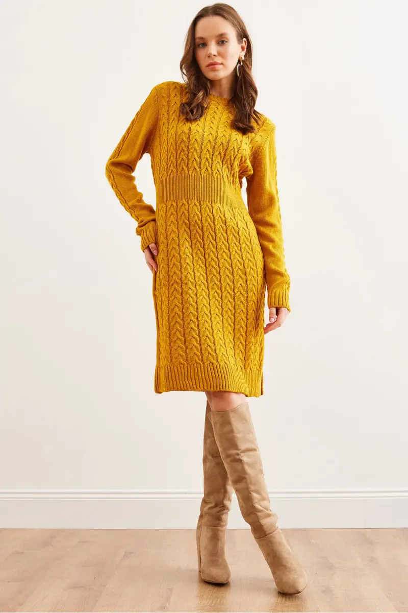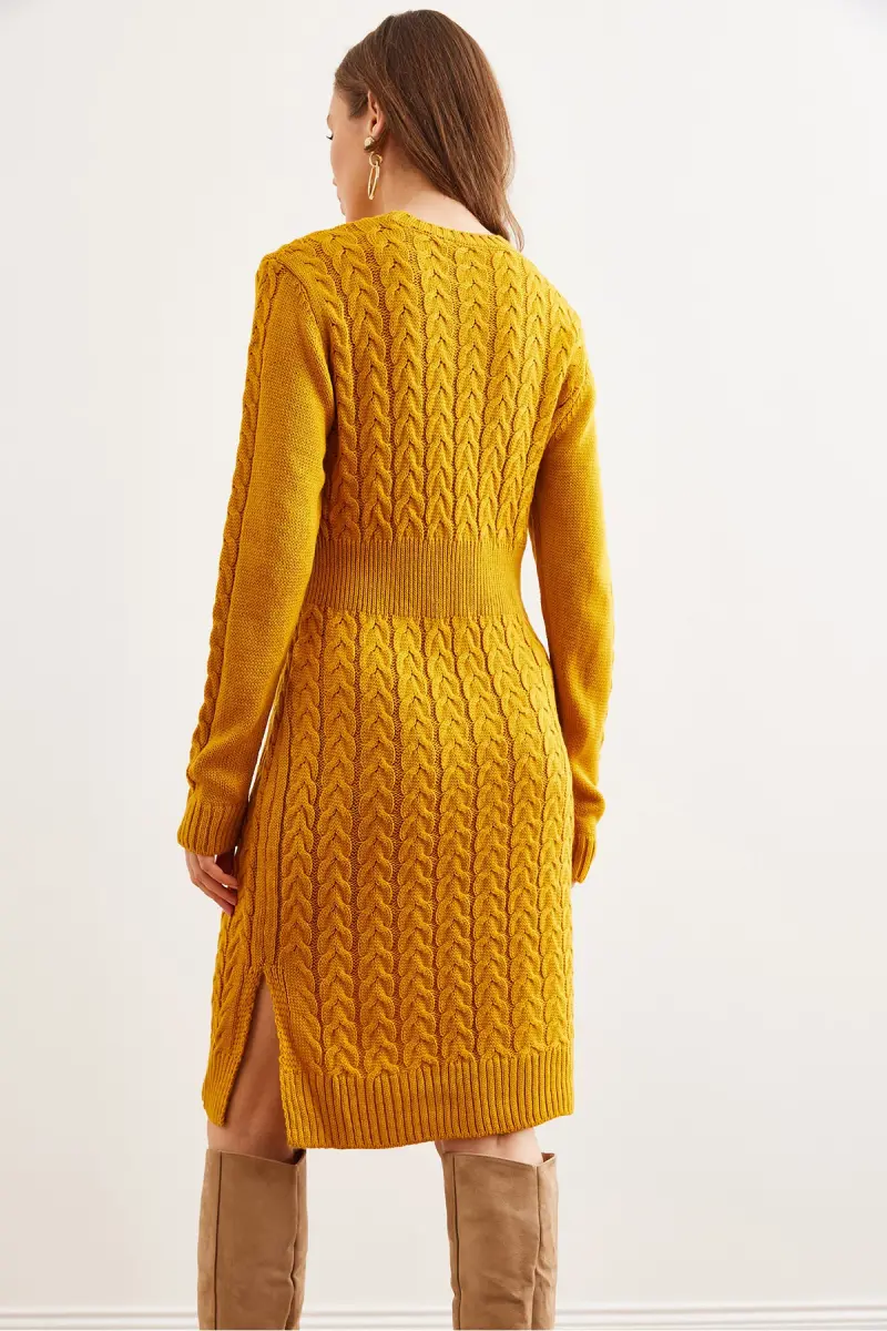 Kadın Hardal Beli Bantlı Yırtmaçlı Saç Örgü Mini Elbise ELB-19002289-Hardal