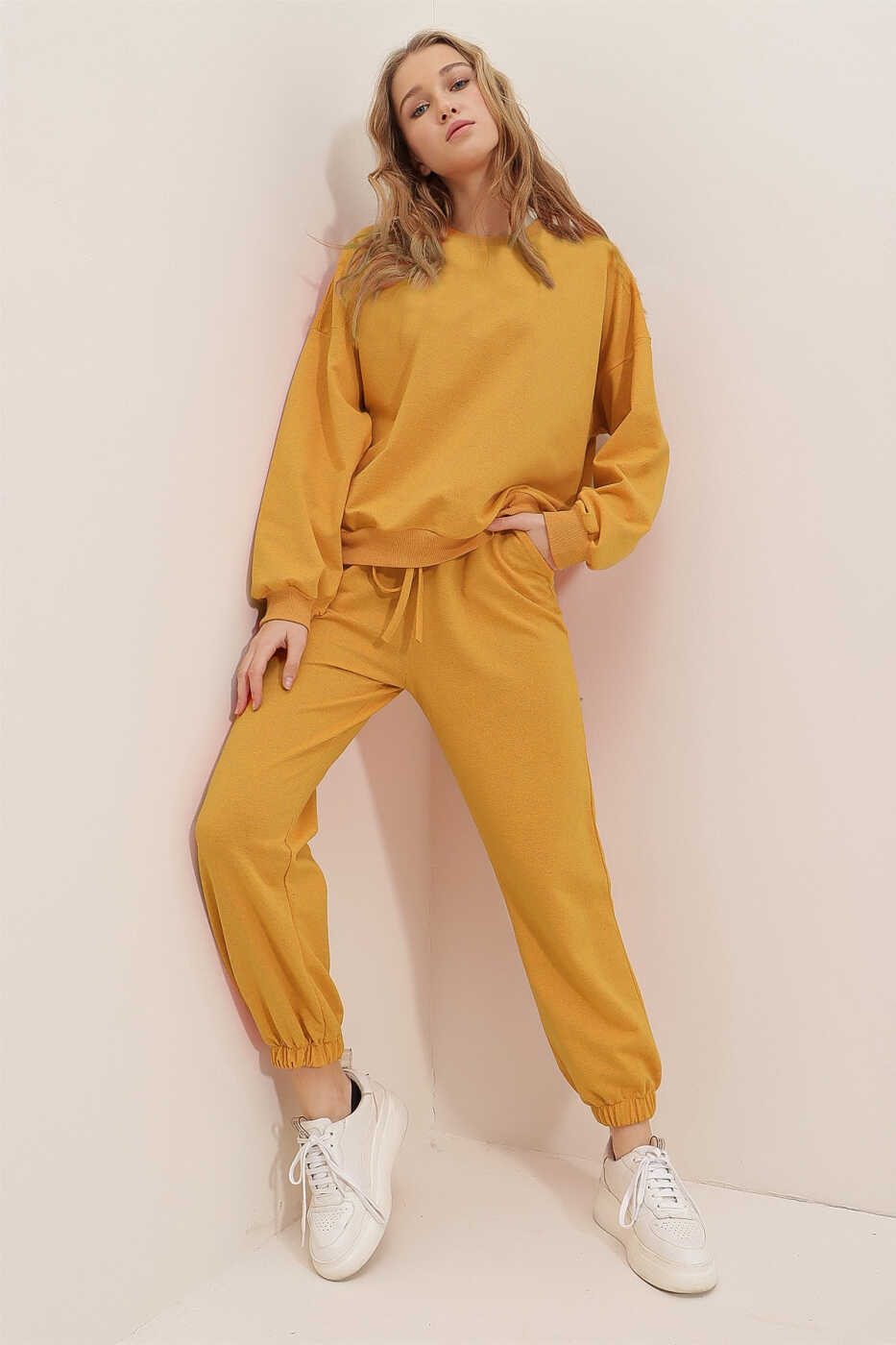 Kadın Hardal Bisiklet Yaka Beli Ve Paçası Lastikli İki İplik Basic Eşofman Takımı ile şıklığı ve konforu bir arada yaşayın!