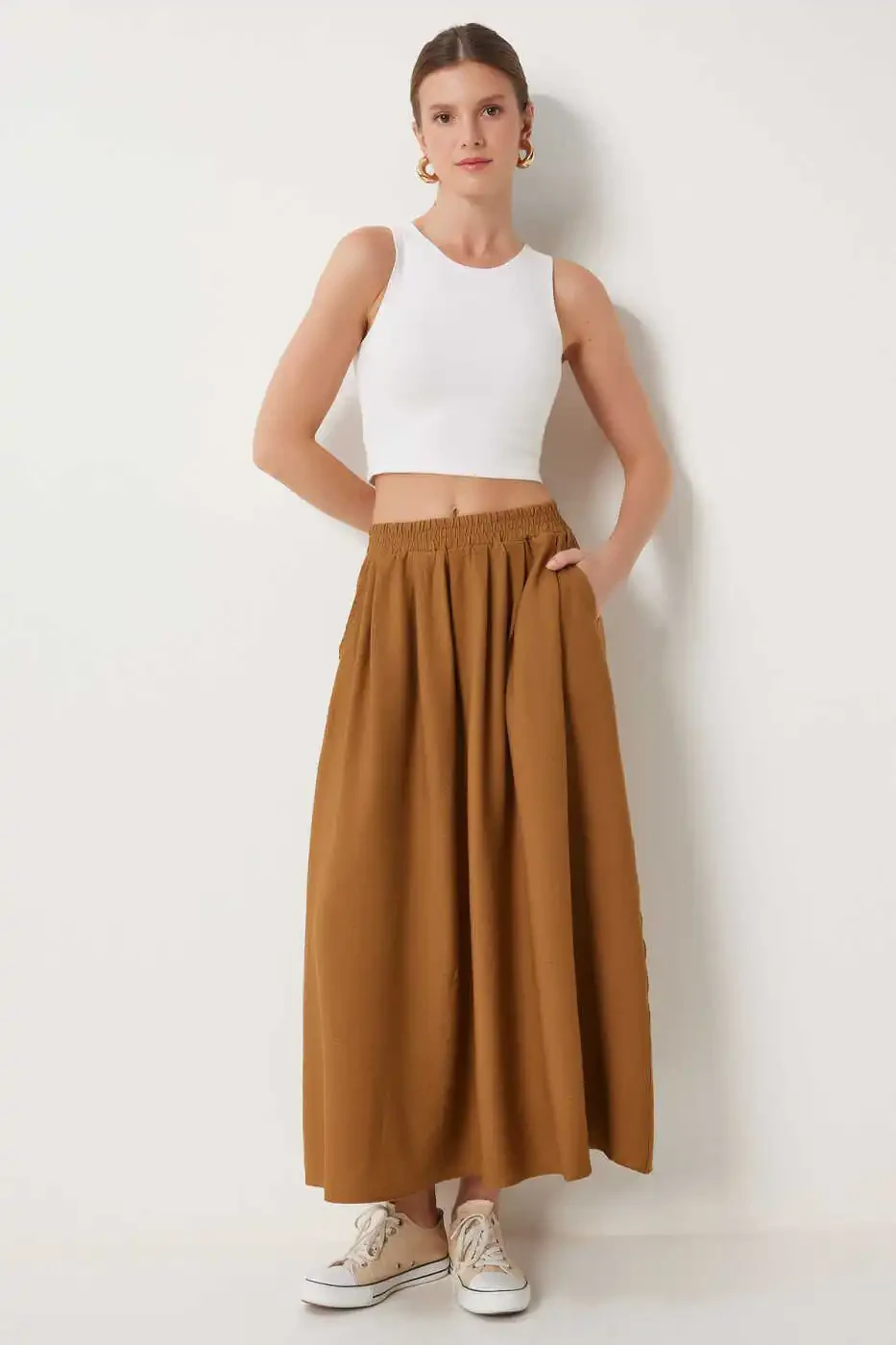 Add style and flair to your wardrobe with the Women's Mustard Pocket Long A-line Woven Skirt US00933! With its classic and timeless design, this skirt can be easily worn in every season and every environment. It will suit many different styles, from your everyday combinations to your elegance in special events. With the energetic and attractive tone of mustard yellow, it adds vibrancy and a modern touch to your style, while its A-line cut provides both a feminine look and comfortable freedom of movement. Made from high-quality woven fabric, the skirt will accompany you for many years with its durability and comfort. The practical pocket details ensure functionality is not overlooked; this skirt offers both style and practicality. Appealing to a wide age range, from young to adult, this timeless piece can be easily combined with different tops; create a casual style with t-shirts, a more elegant look with blouses, or a sporty style with sweatshirts. The regular-length cut gently hugs the body lines for a stylish look and is designed to fit every body type. Don't miss out on this skirt, available with Trendyol's guarantee! Limited stock! Free return within 15 days. You can click on the relevant link for detailed information.