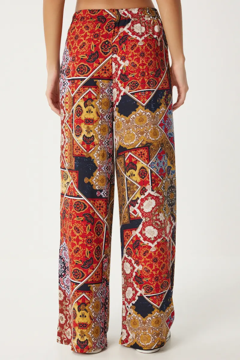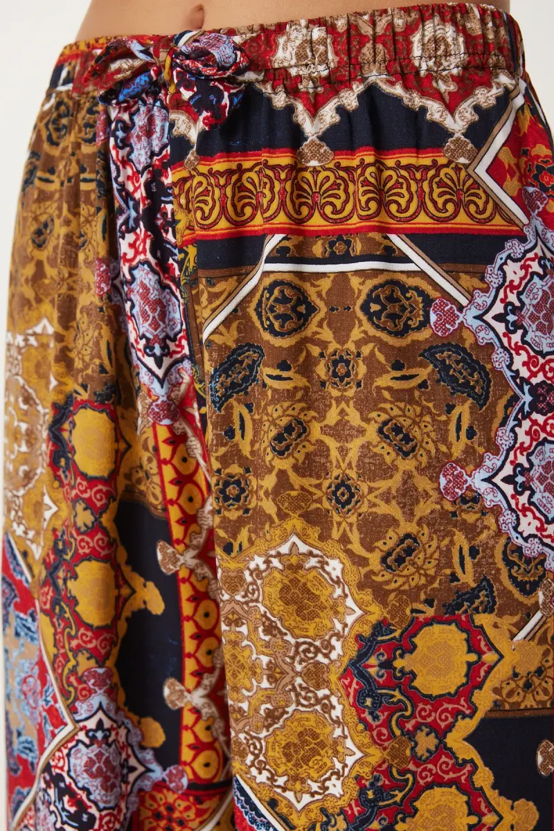 Kadın Hardal Kiremit Desenli Dökümlü Viskon Palazzo Pantolon EN00606-Hardal Kiremit