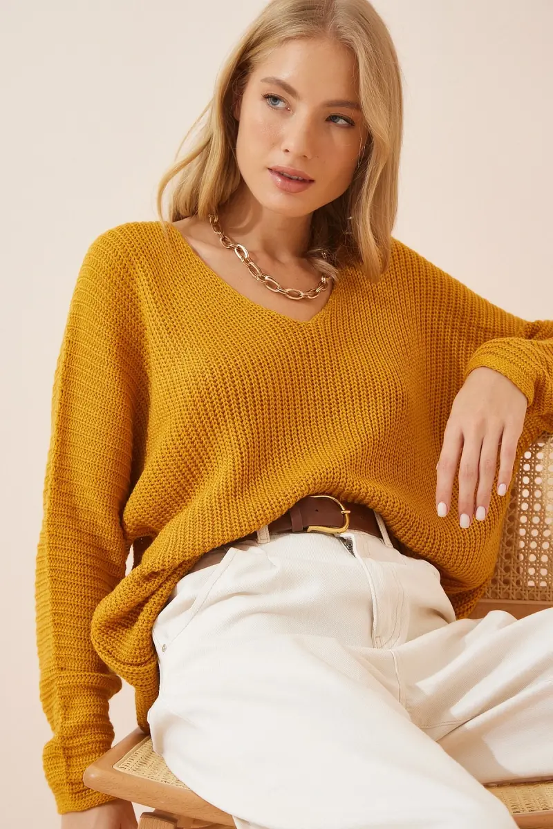 Kadın Hardal V Yaka Selanik Örgü Oversize Triko Kazak ZA00059-Hardal