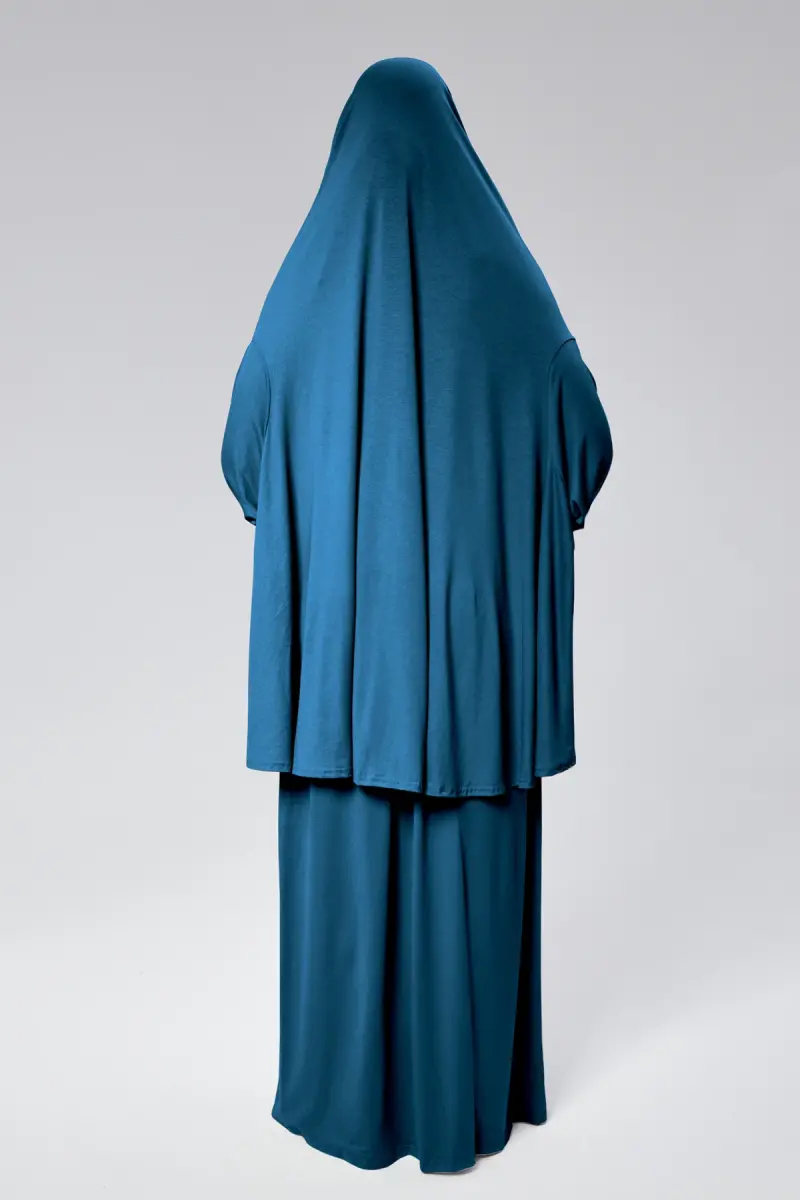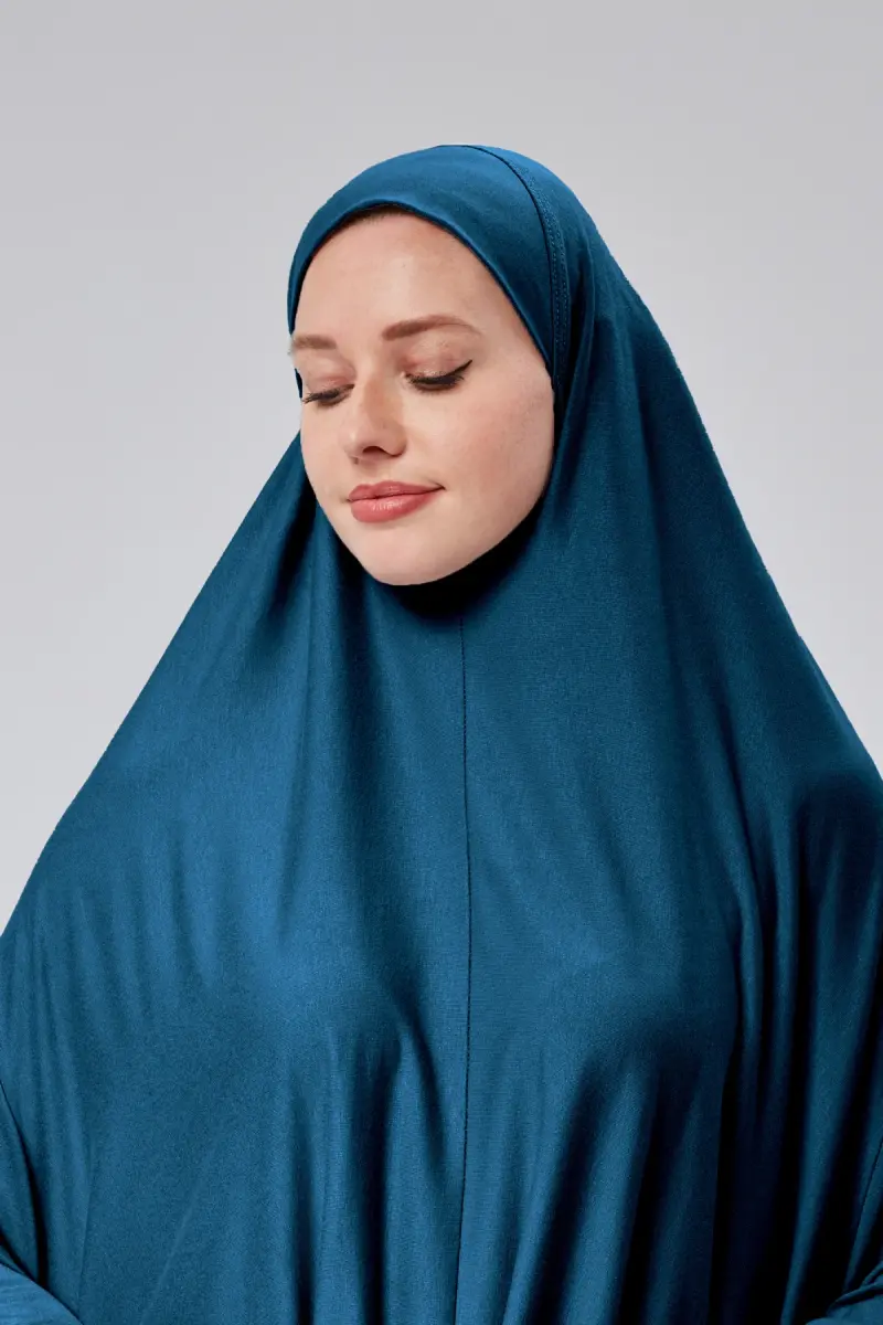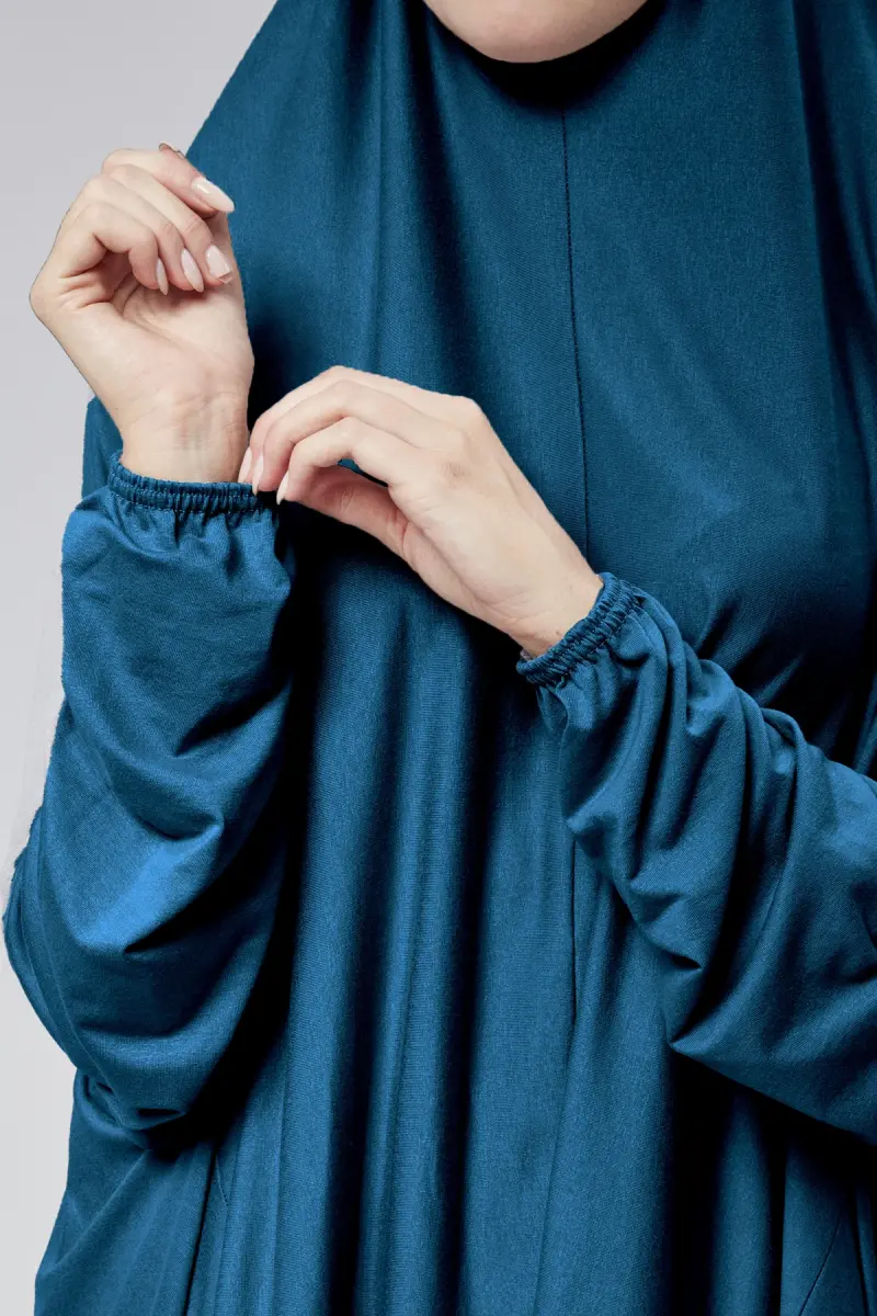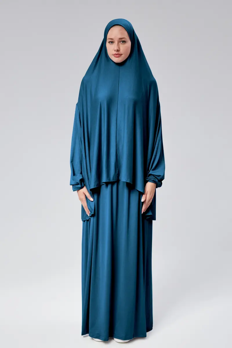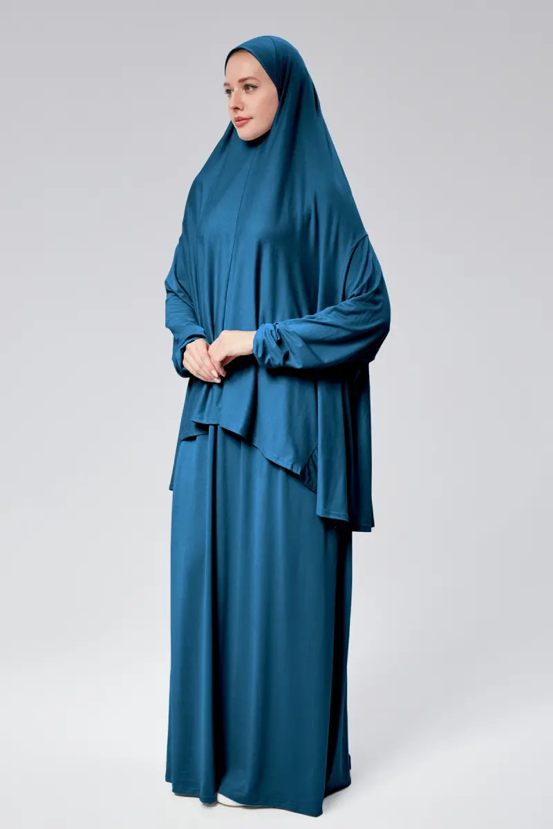 Kadın İki Parça Namaz Elbisesi Başörtülü Organik Pamuklu Lastikli Kolu Kaymaz Etek Penye Tesettür-Petrol rengi