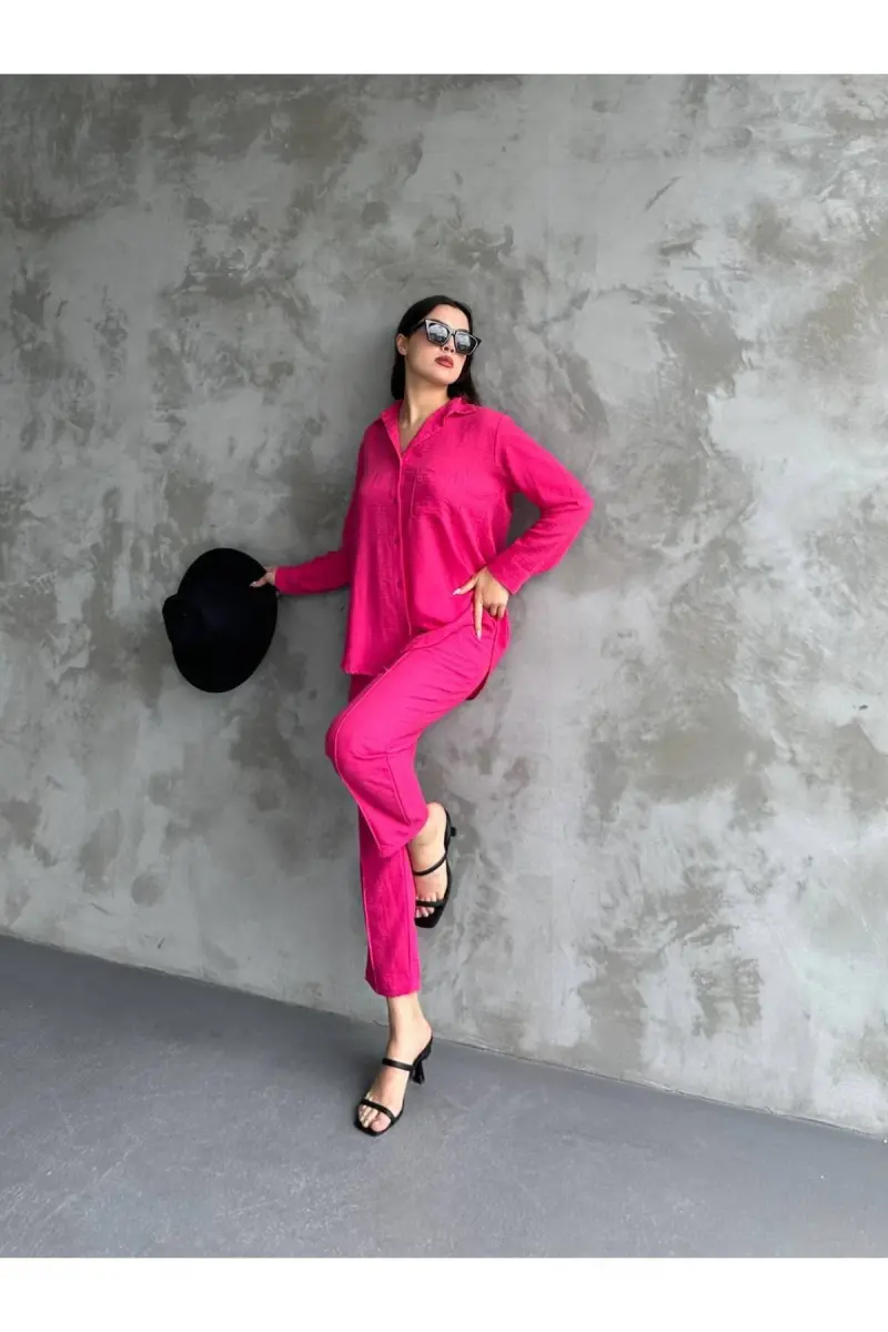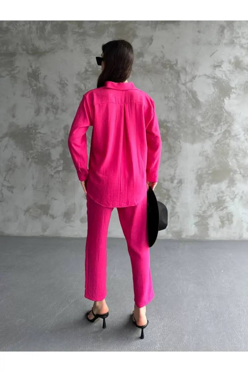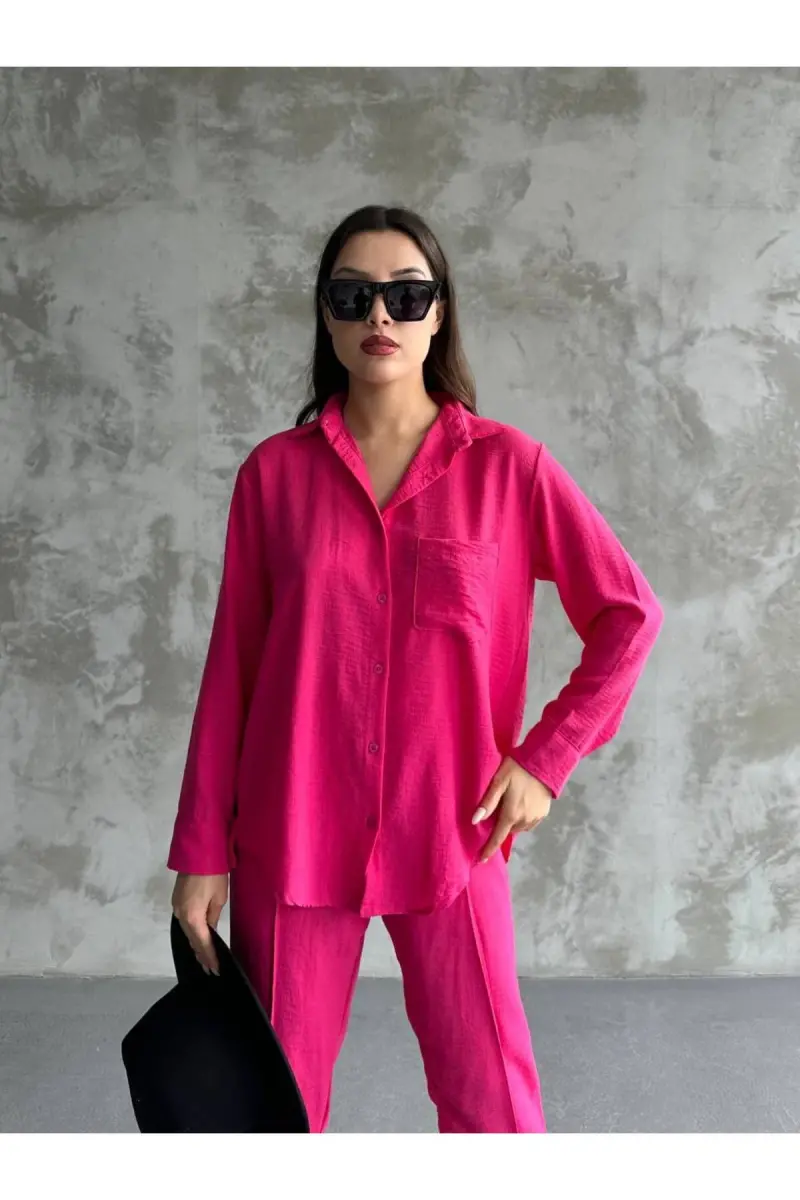 Kadın Ikili Keten Gömlek Pantolon Alt Üst Takım-FUŞYA