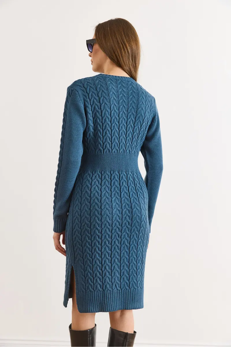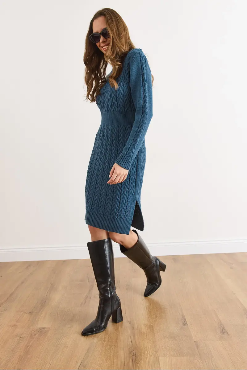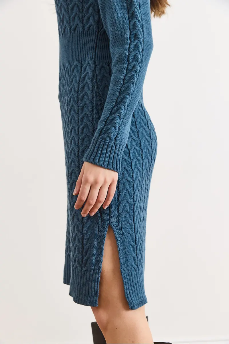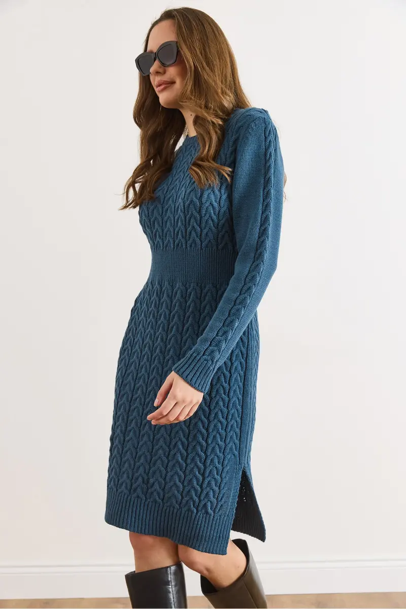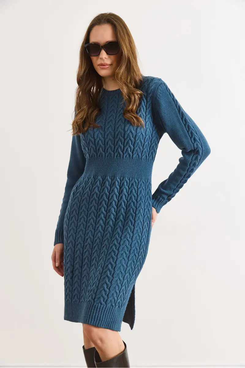 Kadın İndigo Beli Bantlı Yırtmaçlı Saç Örgü Mini Elbise ELB-19002289-İndigo