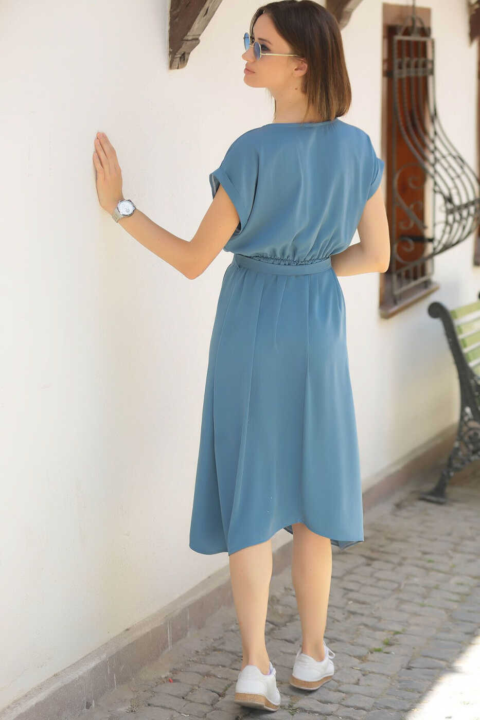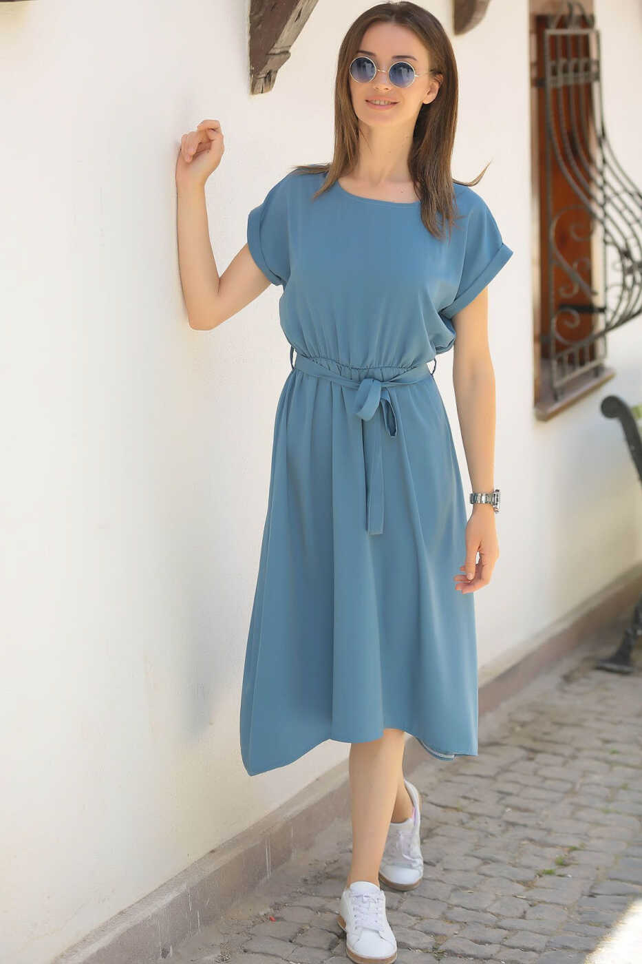 The dress, designed with an elastic waist and tie, perfectly fits your body and suits all sizes. The tie detail allows you to shape the dress as you wish, offering a stylish look for both everyday wear and special occasions.