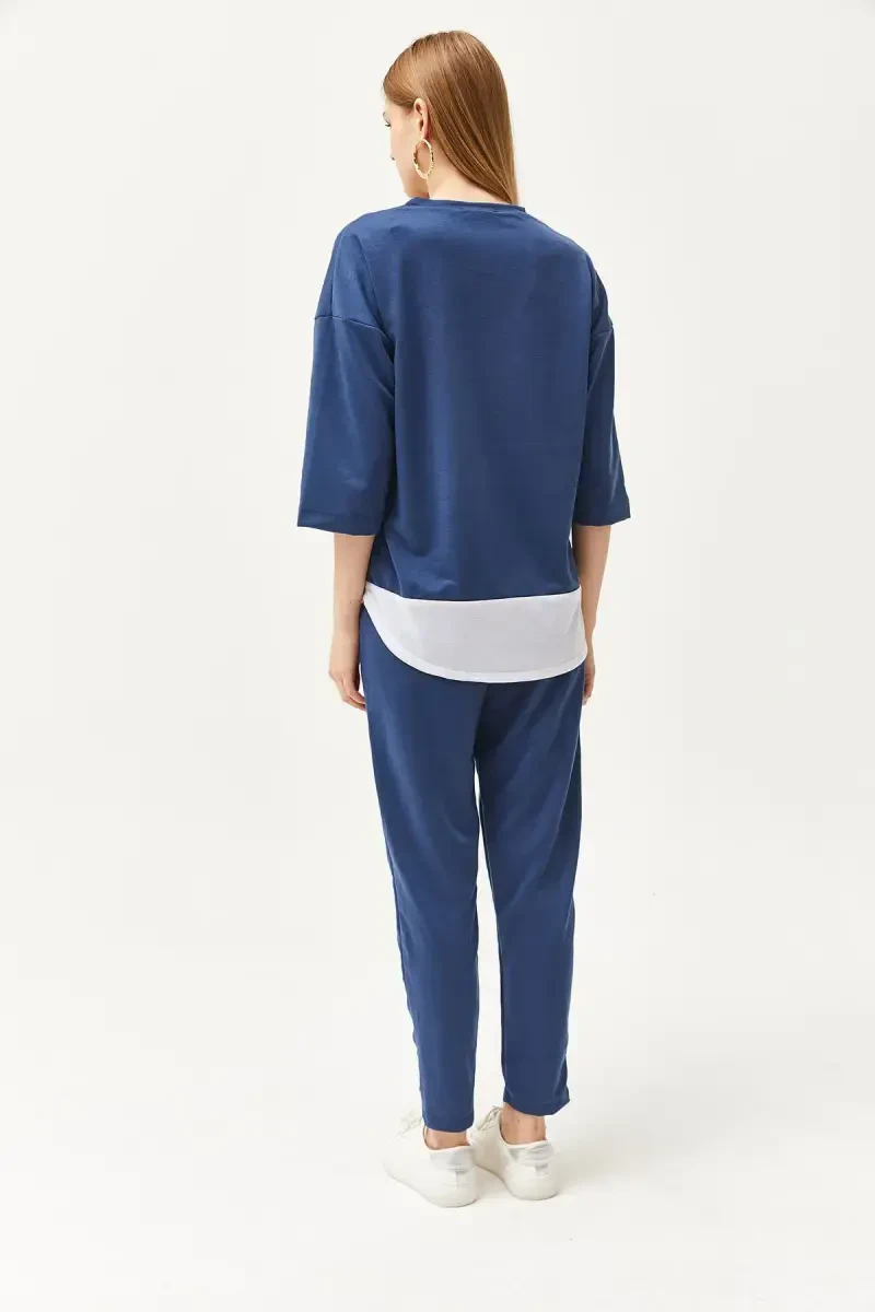 The Women's Indigo Trimmed Top and Bottom Set TKM-19000274-In offers a modern and stylish look with its crew neck design, while appealing to all age groups with its wide range of uses, making it a candidate to become an indispensable part of your wardrobe. The woven fabric structure combines durability and comfort, offering a long-lasting user experience. Standard sleeves and cuffed hems provide comfortable freedom of movement, while the plain design allows you to create a simple and timeless style. The regular fit and length option offers an ideal fit that hugs your body lines without restricting you. The 100% cotton material component provides breathability and a soft feel for comfortable wear all day long. Its plain pattern is easy to combine and helps you maintain your elegance in any environment. The normal waist design offers ideal comfort for daily use and perfectly fits your body lines. It can be easily cleaned according to Type 1 washing instructions, so your product stays like the first day for a long time. This set is offered with Trendyol assurance, and you can order a maximum of 10 of this product that you can have at a campaign price. This product, which can be offered for sale by more than one seller, is listed according to the prices, scores, delivery statuses and promotions determined by the sellers. Free returns are available within 15 days. This stylish and useful set is an excellent option for both daily use and special moments. Enjoy being stylish and comfortable at all times with this piece that you must have in your wardrobe.