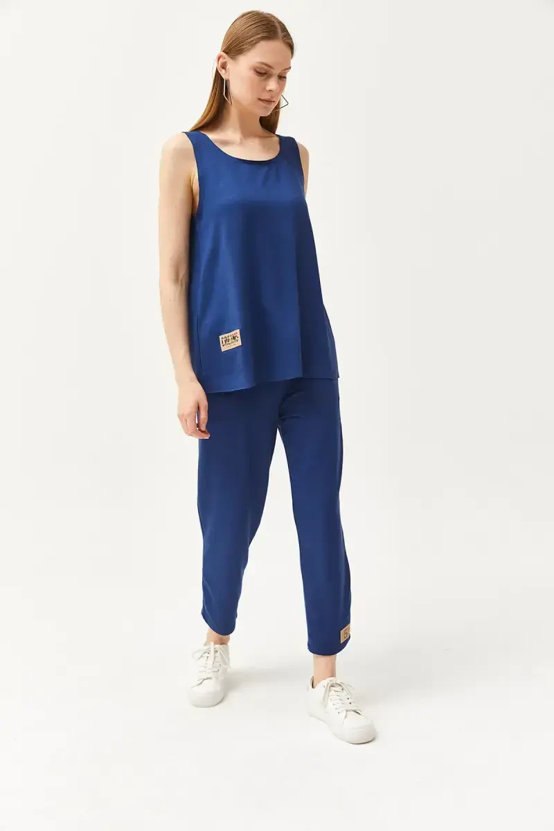 Relaxed fit, sleeveless, indigo color, slouchy blouse and wide leg pants set. Crystal detailed t-shirt.