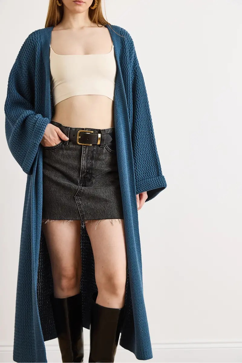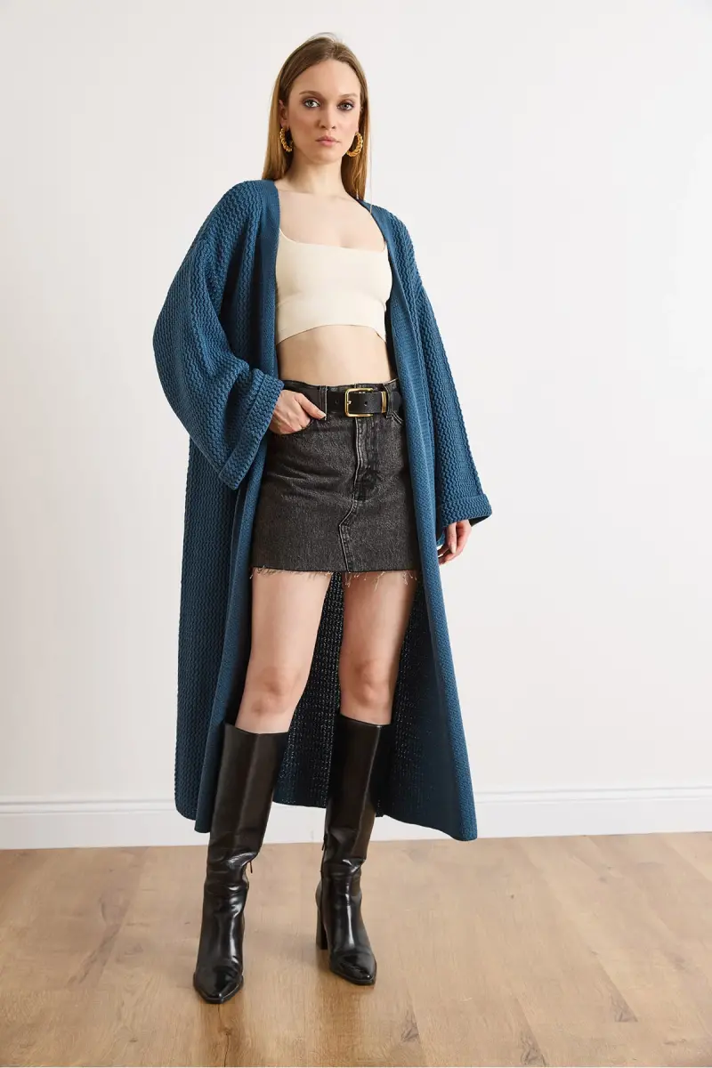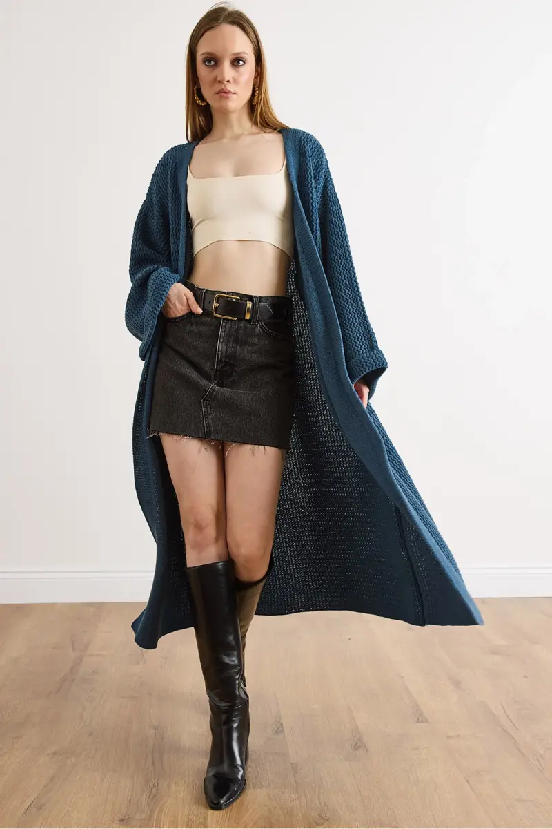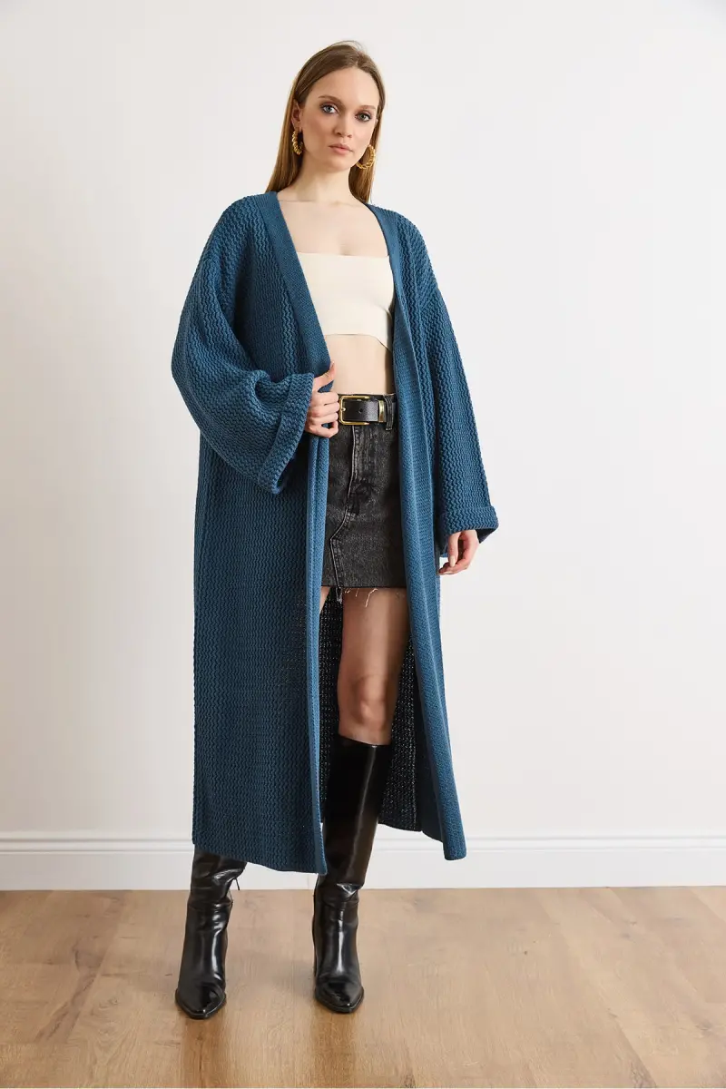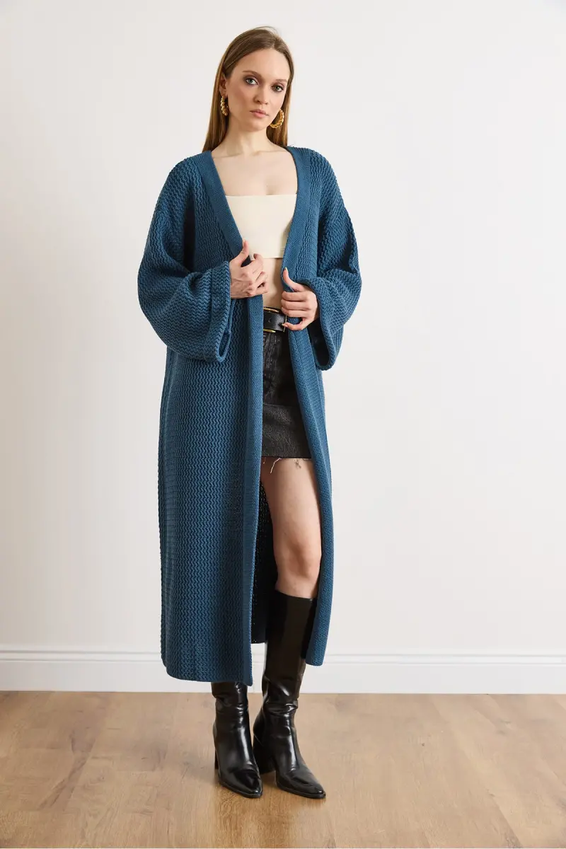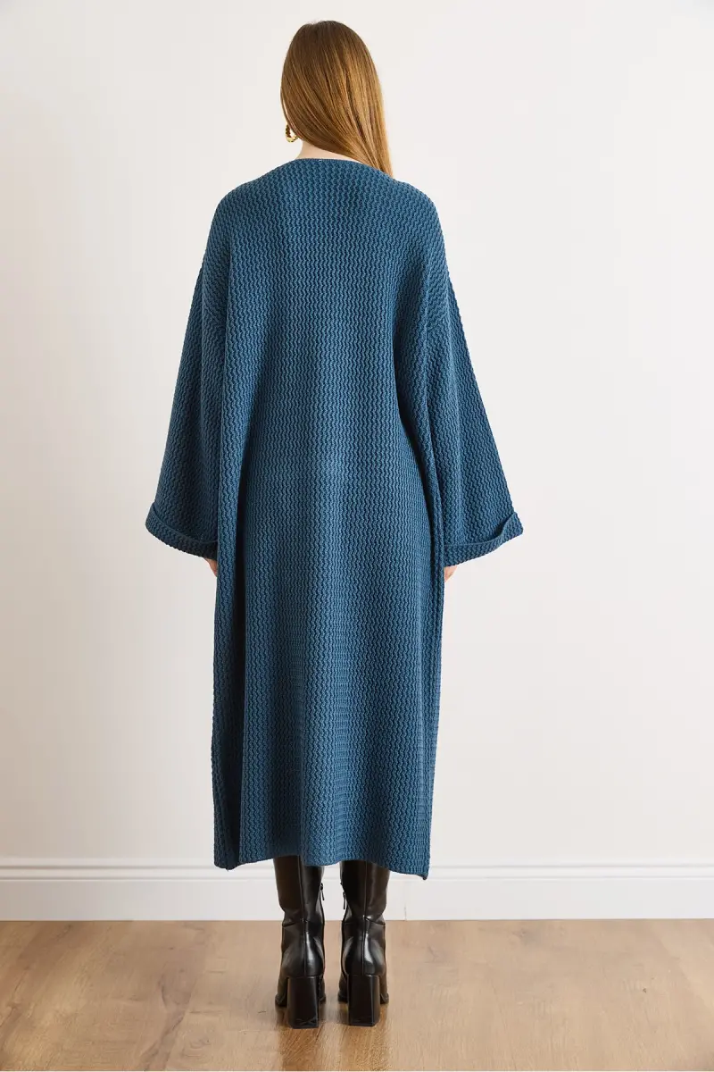 Kadın İndigo Manşeti Katlamalı Maxi Triko Hırka HRK-19000297-İndigo