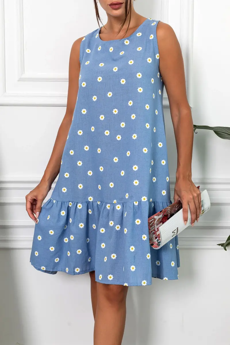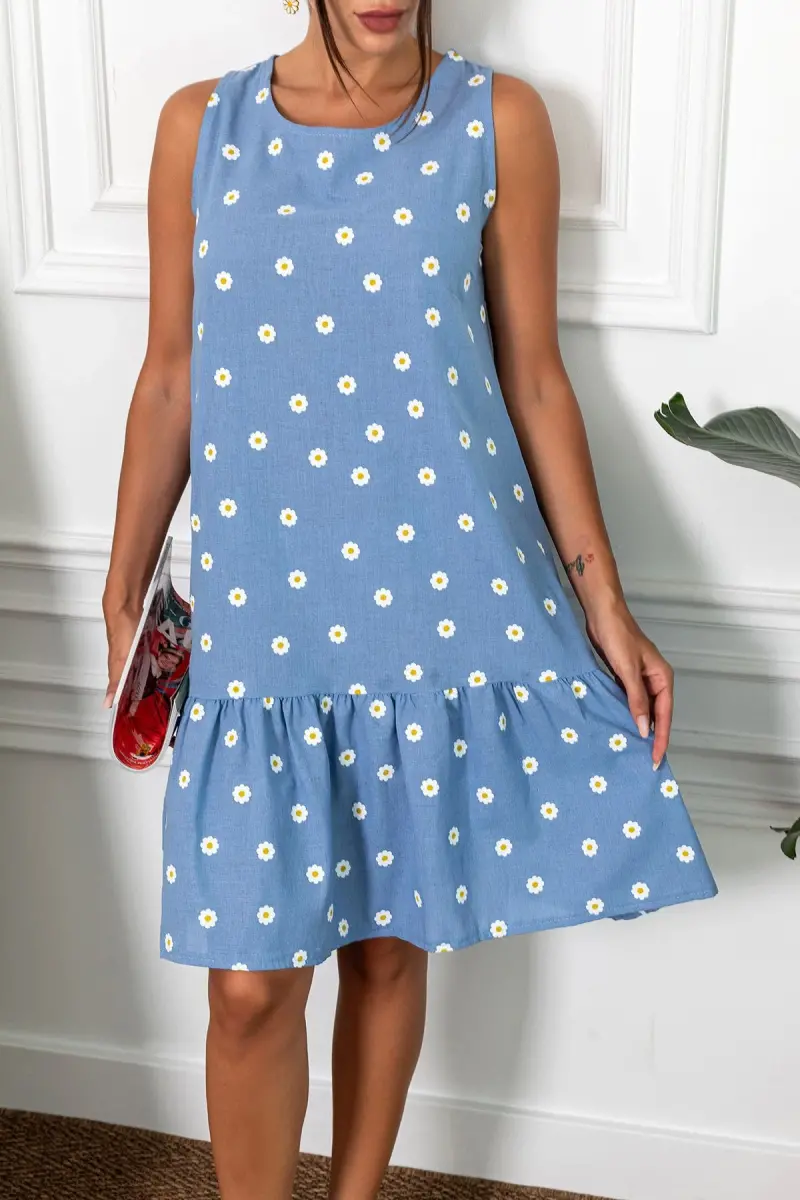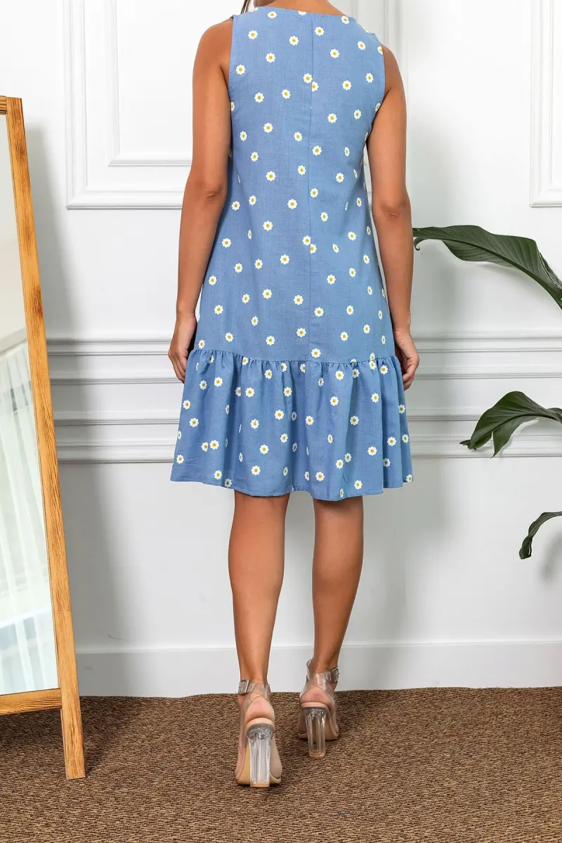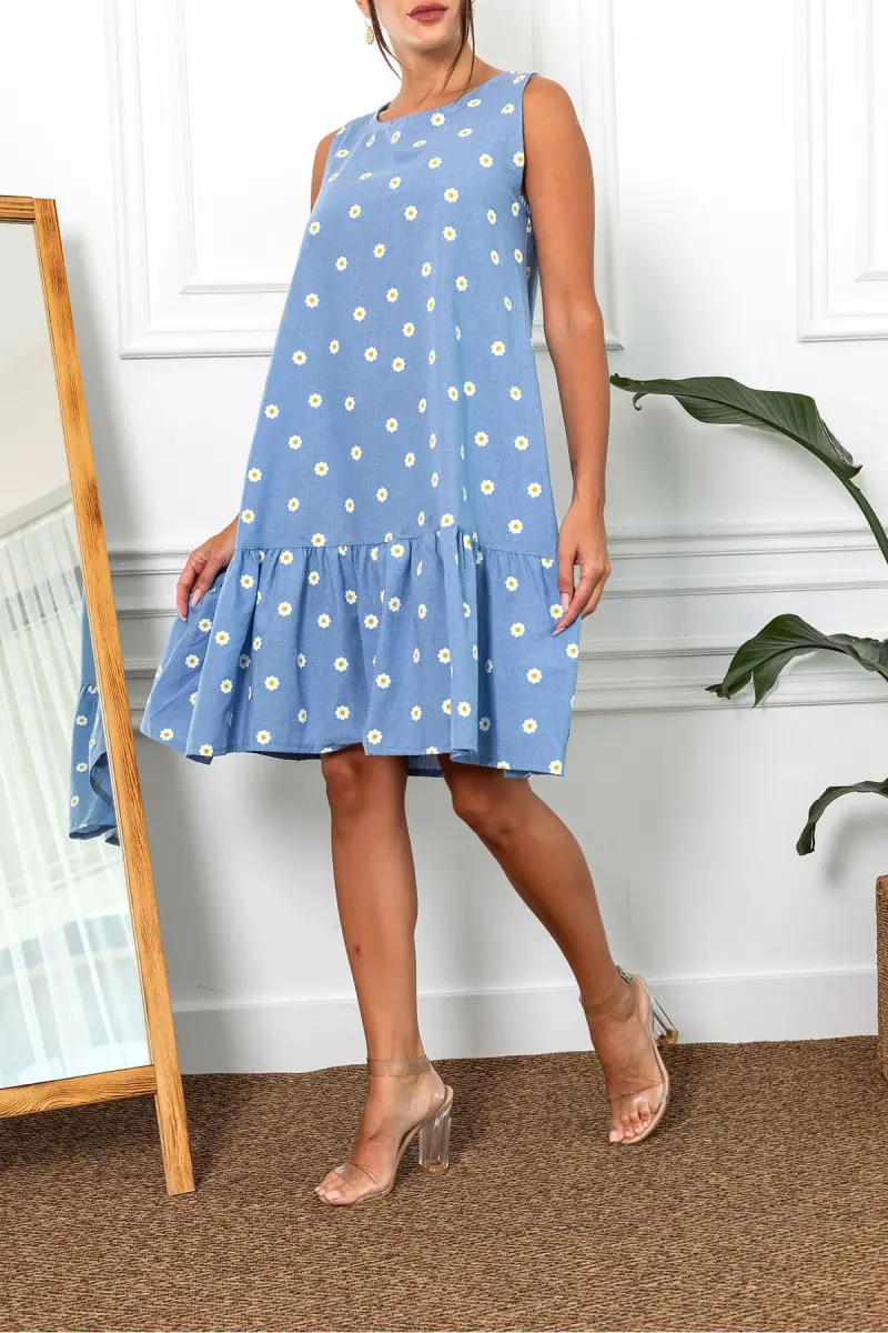 Kadın İndigo Papatya Desen Kolsuz Eteği Fırfırlı Elbise ARM-22Y001123-İndigo