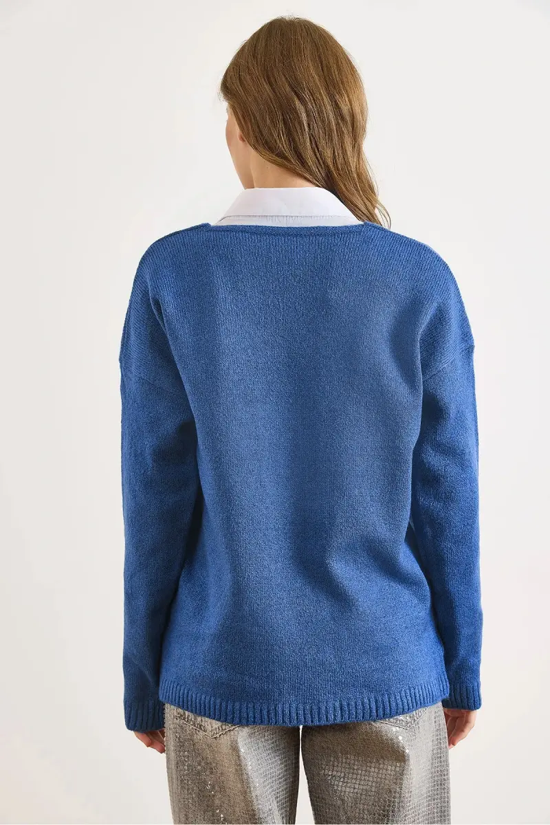 Kadın İndigo V Yaka Yumuşak Dokulu Triko Kazak KZK-19000598-İndigo