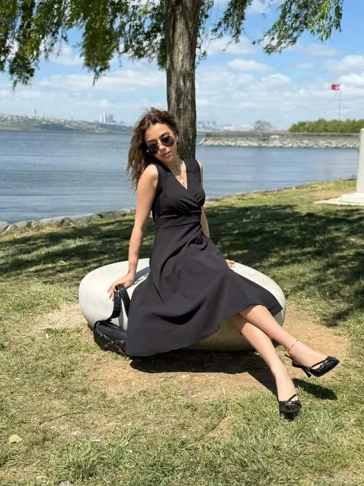 Kadın Ithal Krep Kumaş Kruvaze Yaka Eteği Kloş Kolsuz Mini Elbise