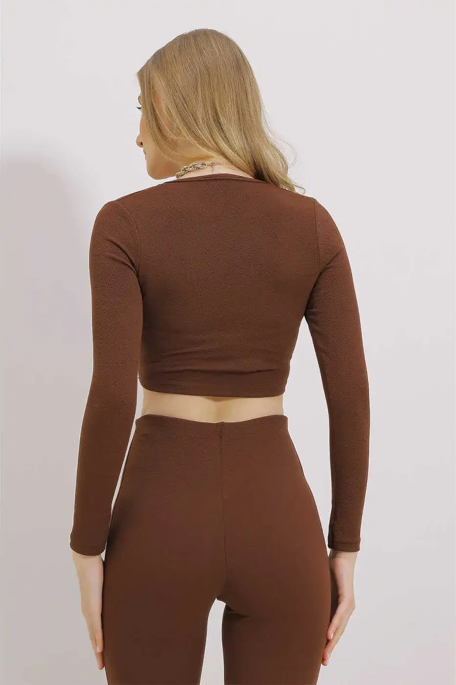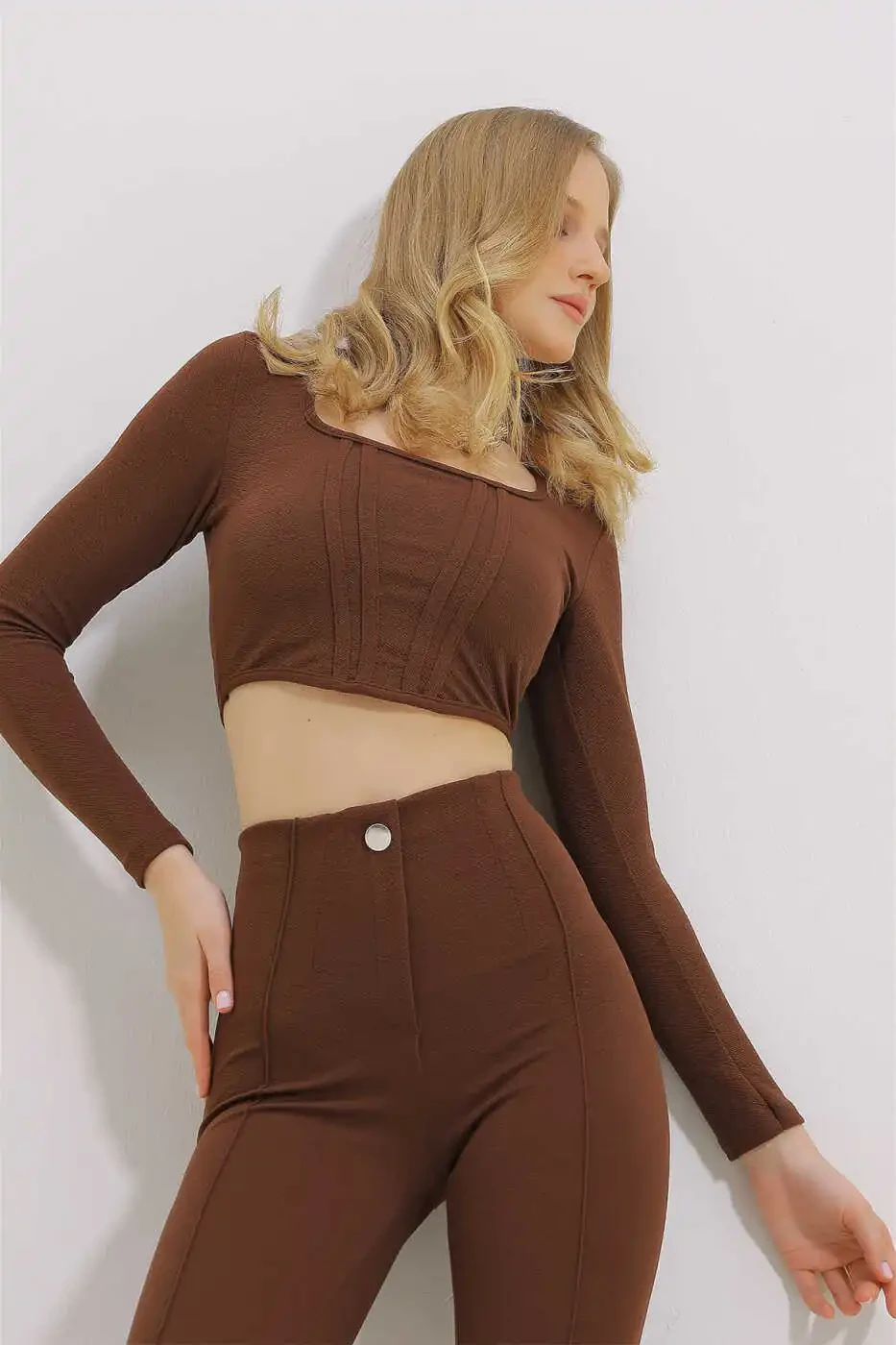 Женская кроп-блузка с квадратным вырезом и кофейным цветом - ALC-X11437