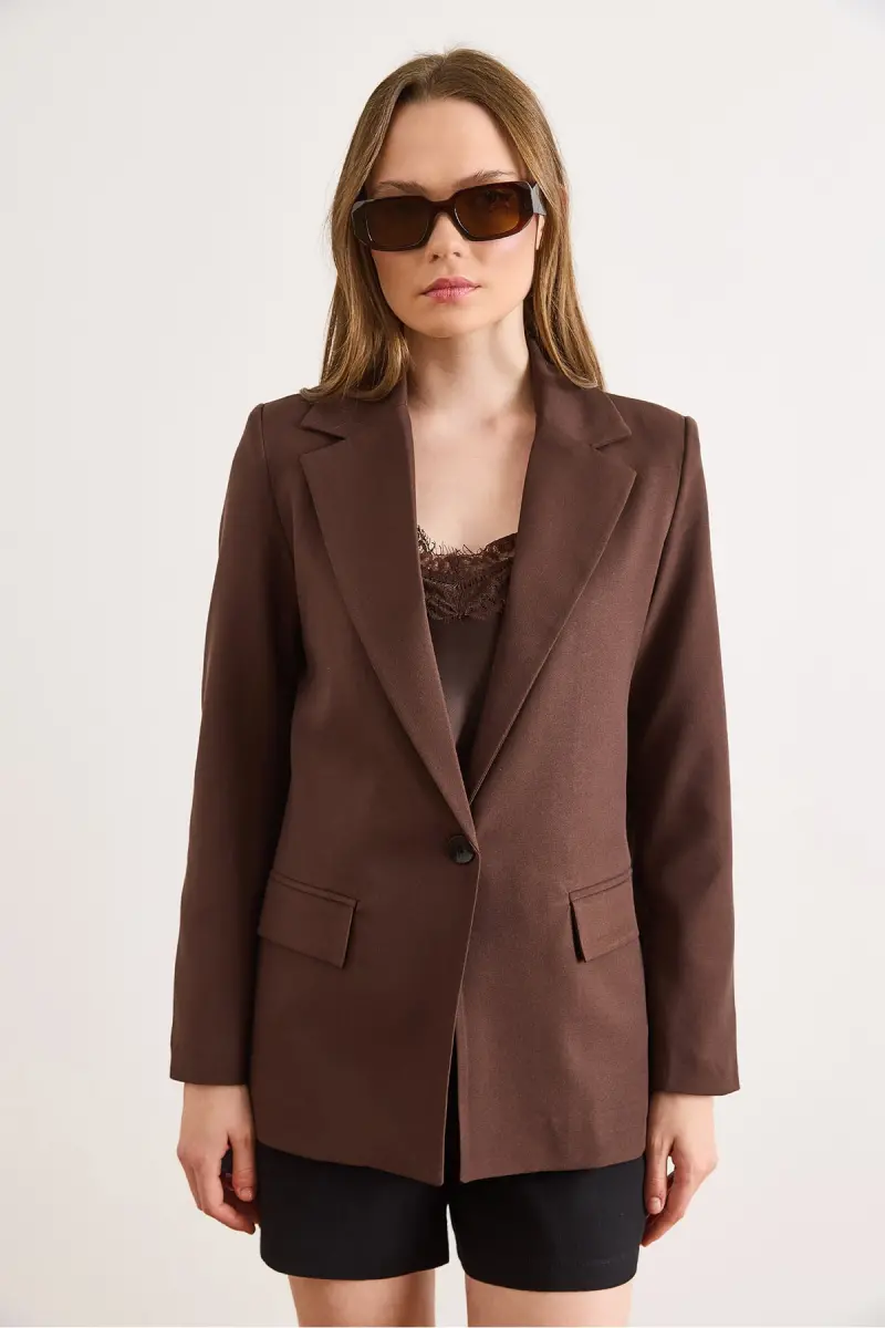 Kadın Kahverengi Tek Düğmeli Astarlı Cep Kapaklı Premium Blazer Ceket CKT-19000395-Kahverengi