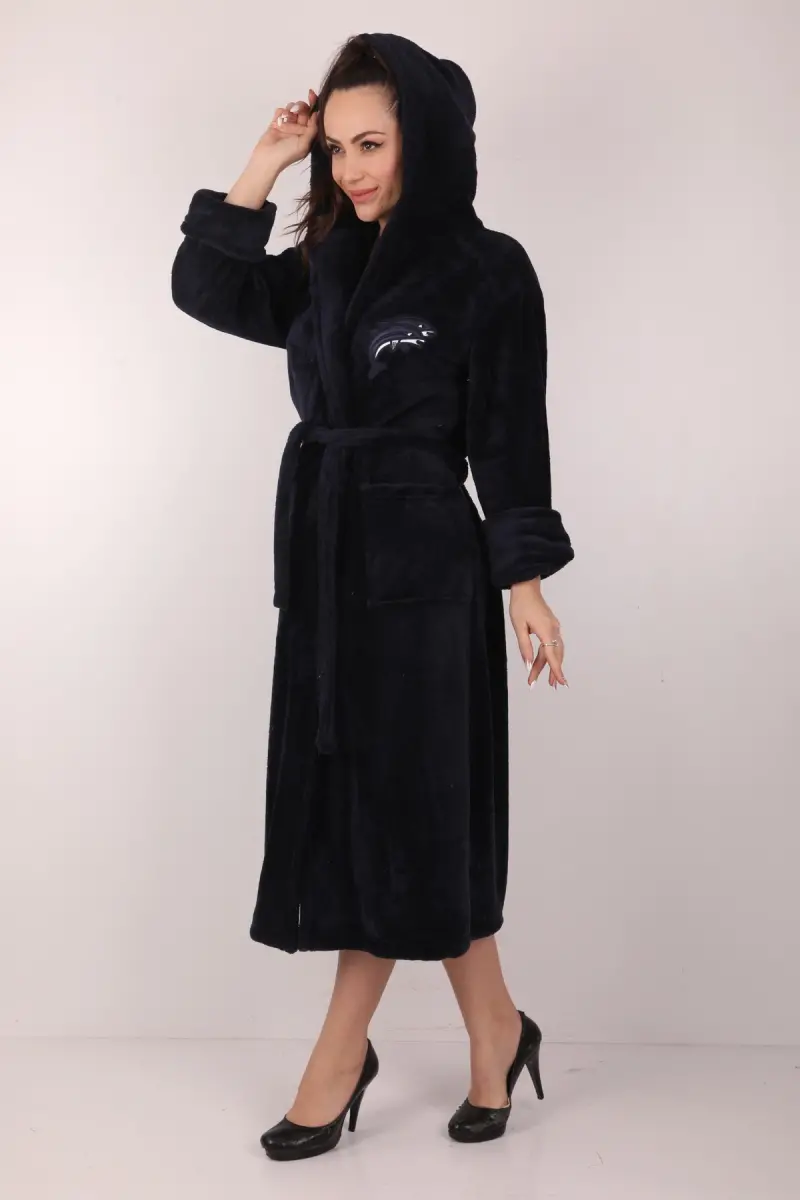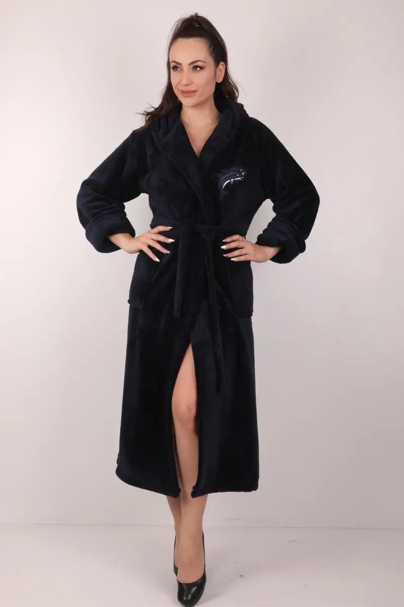 Kadın Kapşonlu Nakışlı %100 Bambu Uzun Sabahlık-lacivert